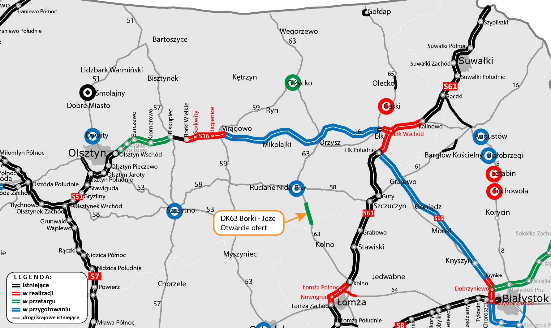 Pięciu wykonawców jest zainteresowanych rozbudową ponad 14 km DK63 Borki - Jeże. Najniższą cenę 95,6 mln zł zaproponowała firma Unibep z Bielska Podlaskiego, najwyższą 128,5 mln zł, firma Strabag z Pruszkowa. Budżet, jakim dysponujemy na wykonanie zadania wynosi 97 145 425,54 zł. Jedynym kryterium oceny ofert będzie cena. Na wykonanie zadań wykonawca robót będzie miał 18 miesięcy. Do czasu realizacji nie wlicza się okresów zimowych.