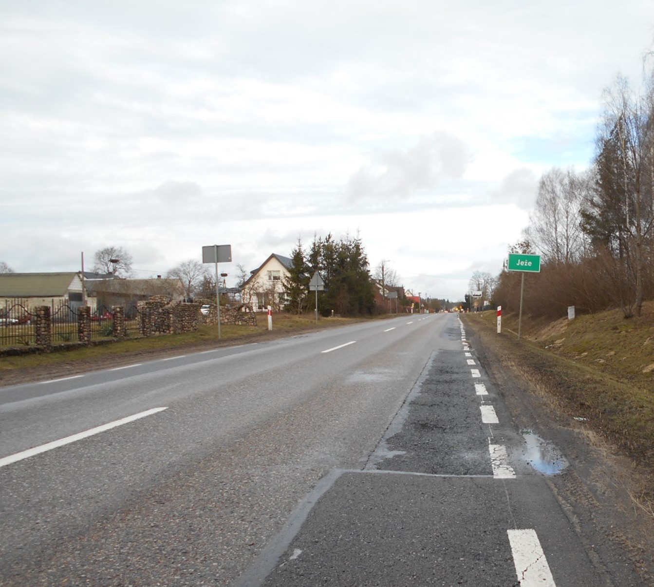 DK63 Borki - Jeże. Wjazd do miejscowości Jeże. Po lewej stronie drogi zabudowania, po prawe znak z nazwą miejscowości.