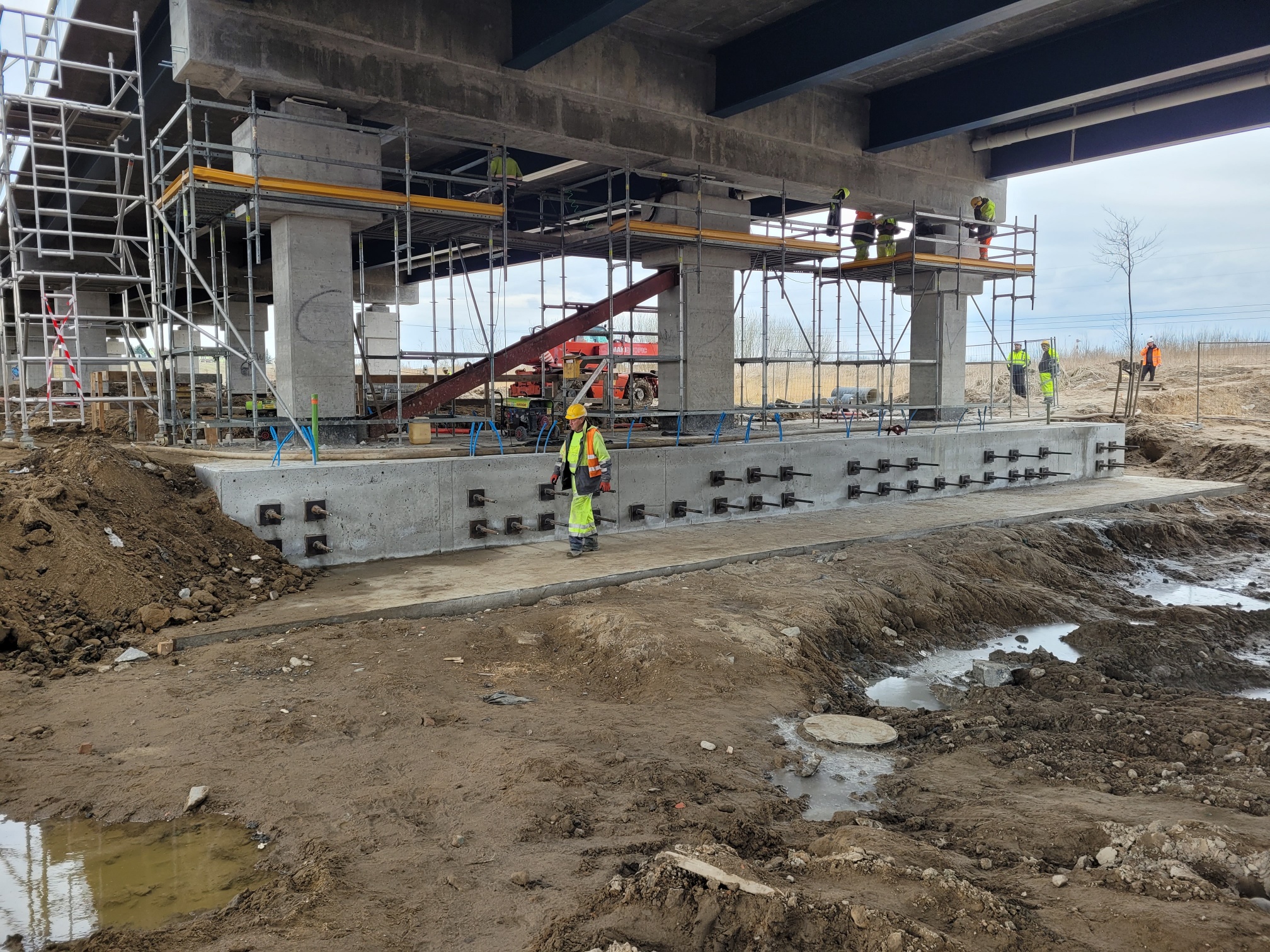 Niezwłocznie przystąpiliśmy wraz z wykonawcą do doraźnych działań zabezpieczających i monitorujących. Wykonana została tymczasowa stabilizacja jednego słupa podpory. Poza tym zainstalowane zostały czujniki monitorujące pracę konstrukcji, a na podstawie pomiarów i badań dokonaliśmy analizy zachowania się konstrukcji obiektu.