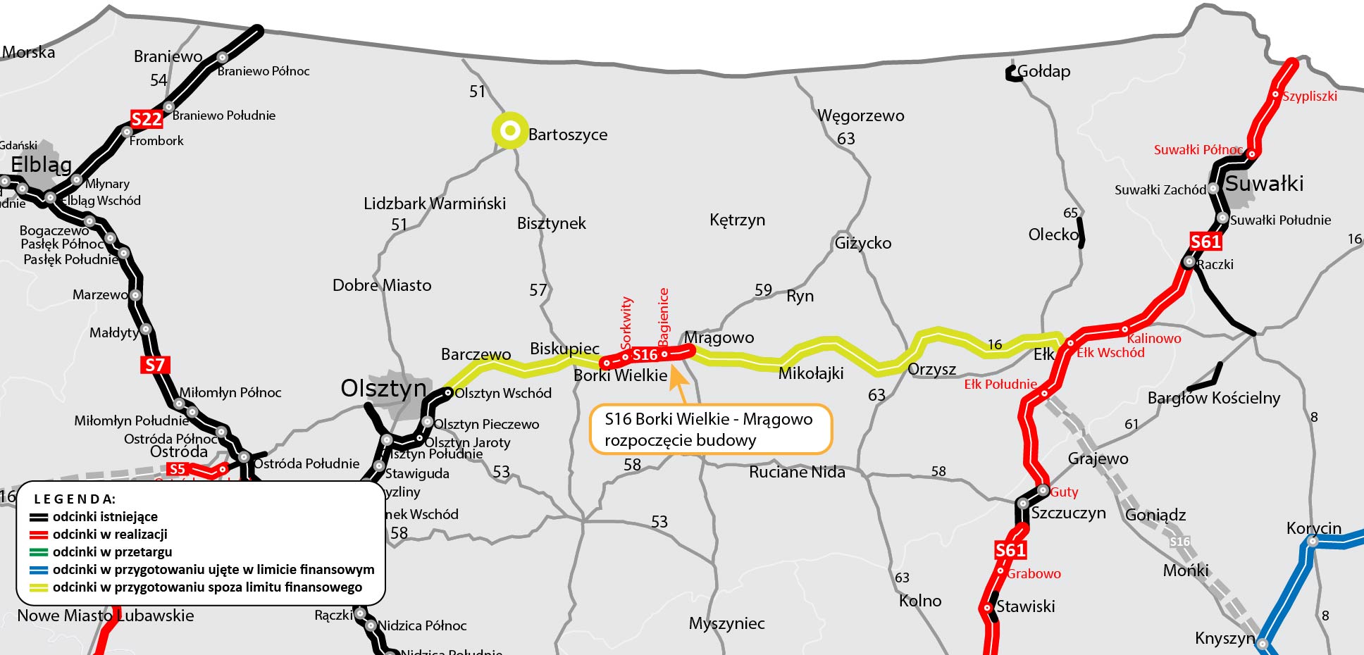 Odcinek S16 Borki Wielkie - Mrągowo, w systemie Projektuj i buduj, realizuje firma PORR. Inwestycja jest kolejnym etapem budowy drogi ekspresowej S16 w województwie warmińsko-mazurskim. Nowy odcinek będzie miał długość około 16 km, w tym około 13 km w ciągu S16 i około 3 km obwodnicy Mrągowa w ciągu drogi krajowej nr 59.