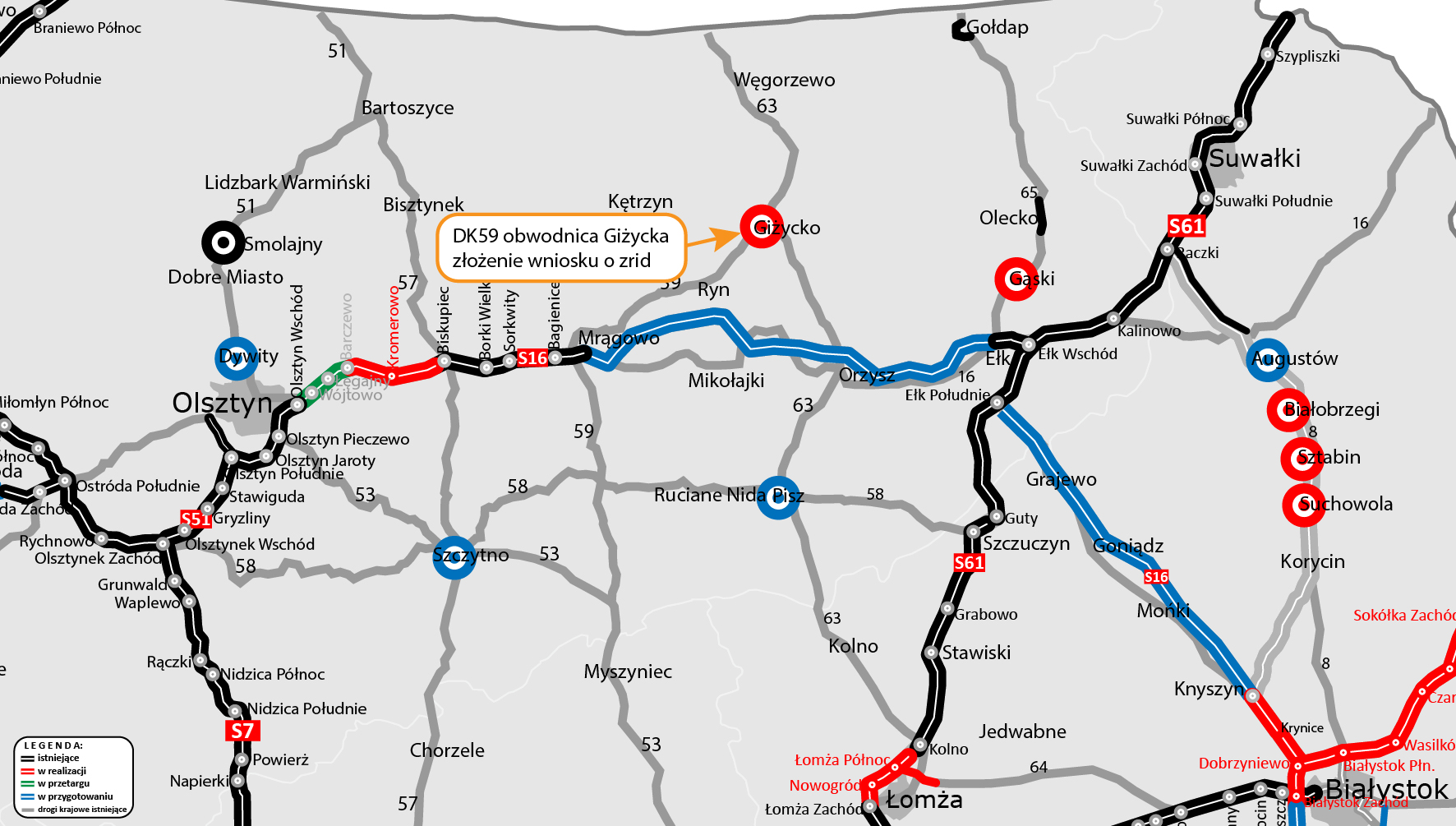 Do Wojewody Warmińsko-Mazurskiego trafił wniosek o wydanie decyzji o zezwoleniu na realizację inwestycji drogowej (ZRID) dla rozbudowy obwodnicy Giżycka na drodze krajowej nr 59. Po wydaniu decyzji będą mogły rozpocząć się prace budowlane.