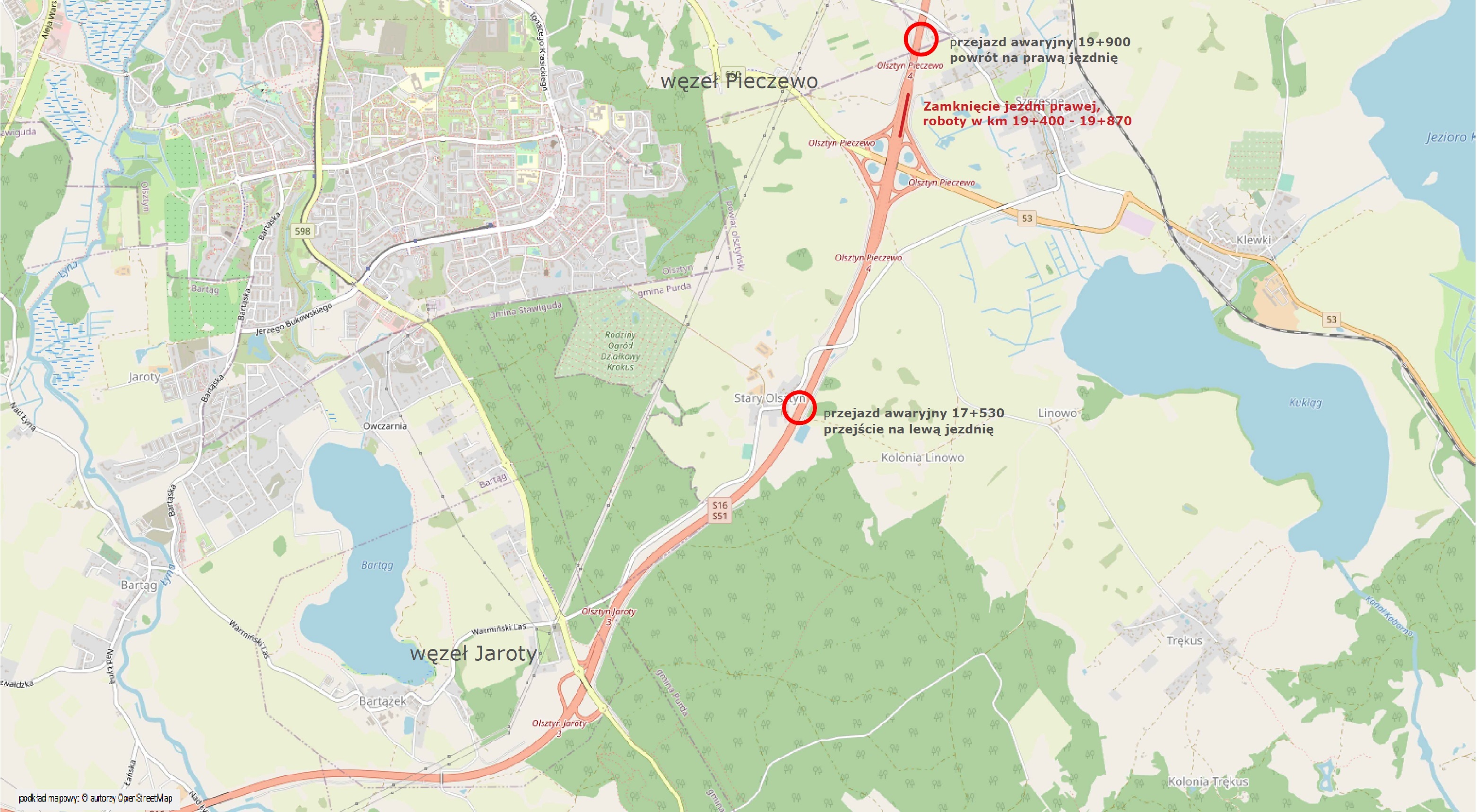 W piątek, 10 września, w godzinach porannych wyłączona z ruchu zostanie prawa jezdnia obwodnicy (w kierunku Augustowa) na odcinku około 2,5 km. Ruch zostanie skierowany na jezdnię lewą i będzie odbywał się dwukierunkowo. W tym celu zostaną wykorzystane przejazdy awaryjne zlokalizowane w km 17+530 i 19+900.