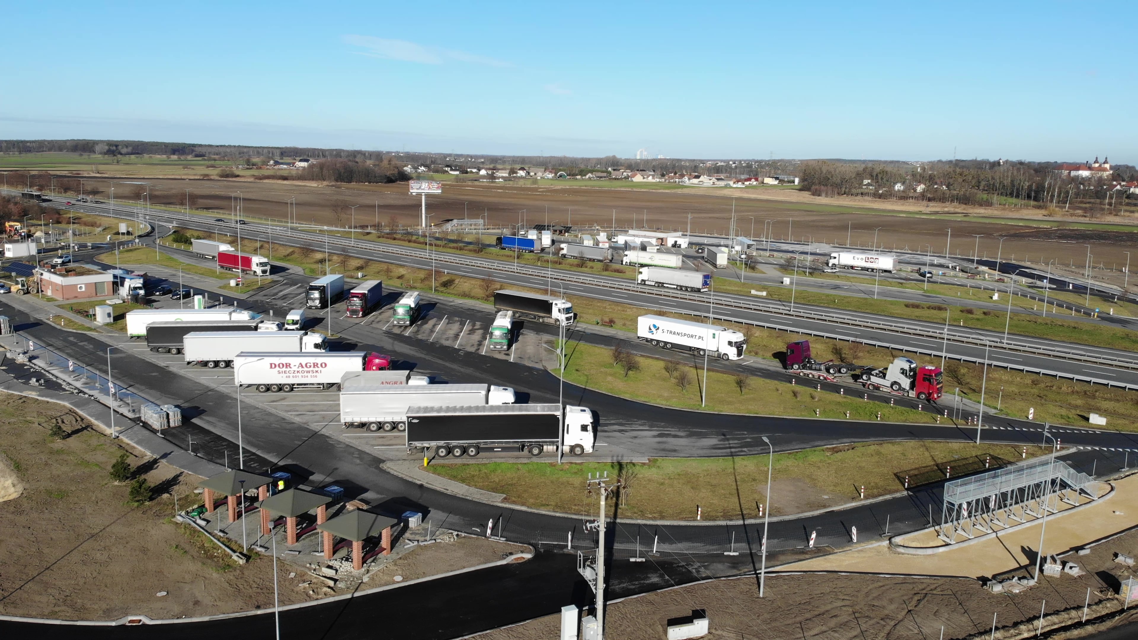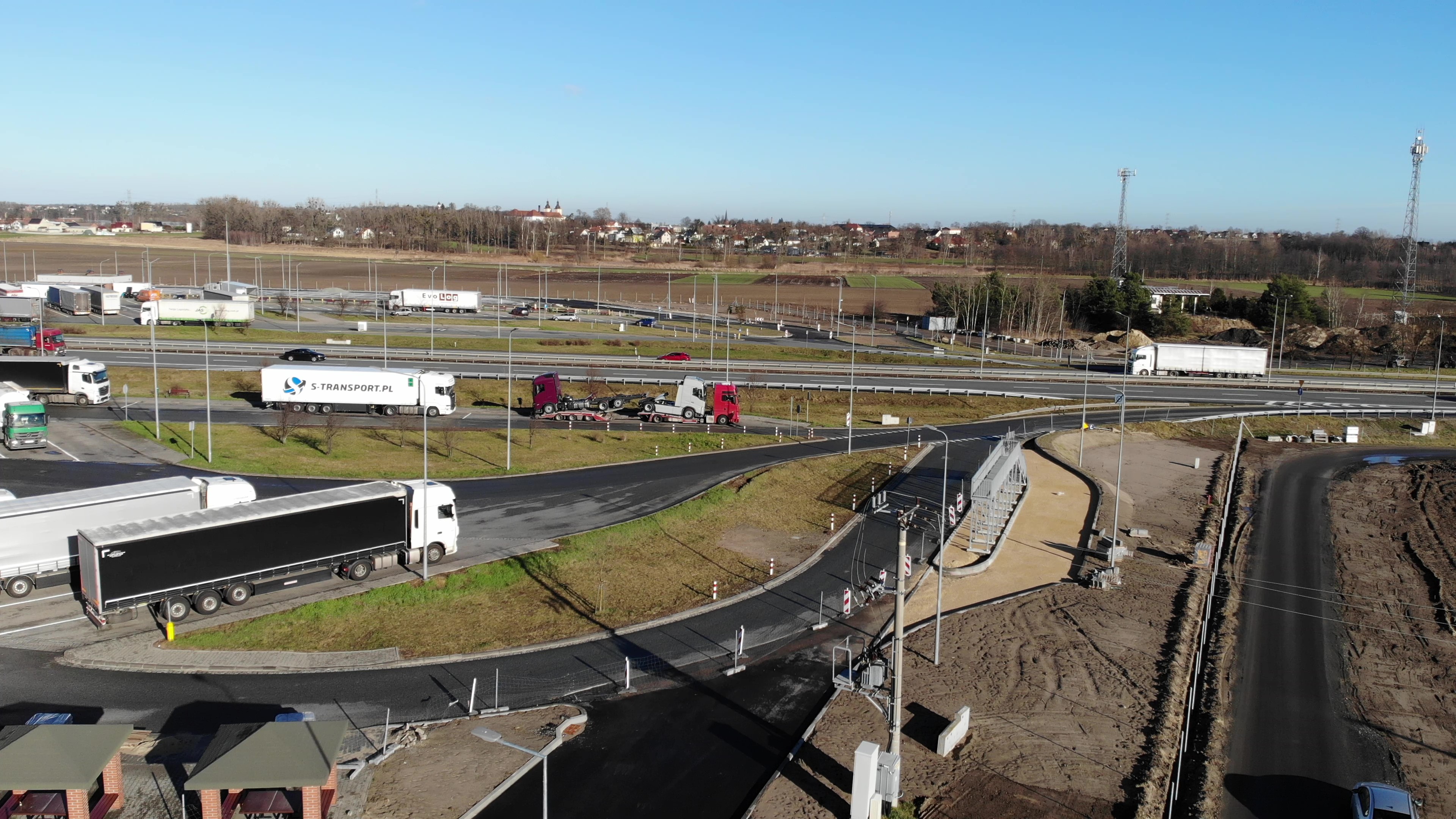 Obecnie układana jest kostka betonowa na wyspach i chodnikach, trwa montaż ogrodzenia. Na obu MOP-ach ustawiono rampy do odśnieżana pojazdów ciężarowych, wokół których ułożona zostanie kostka brukowa.