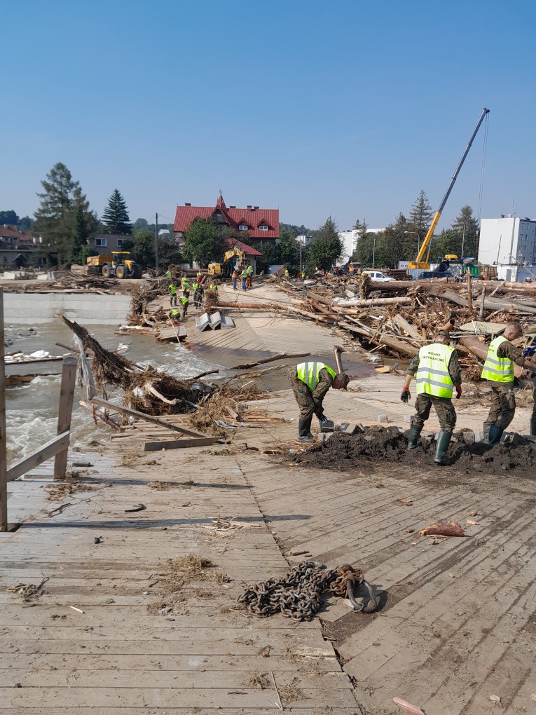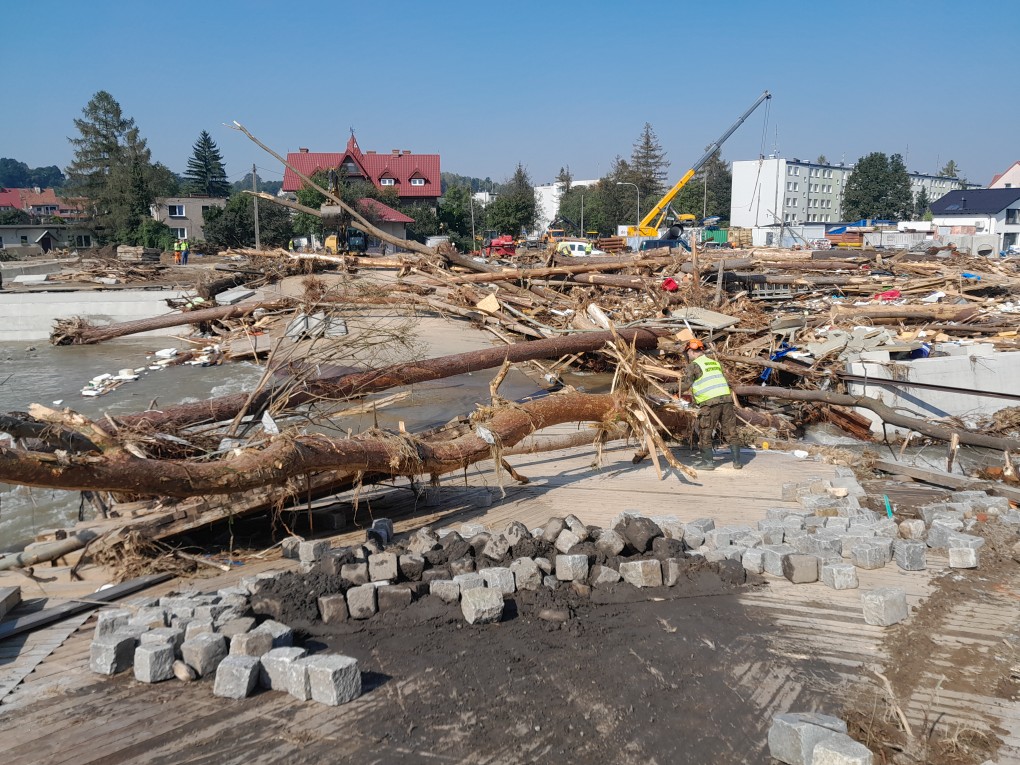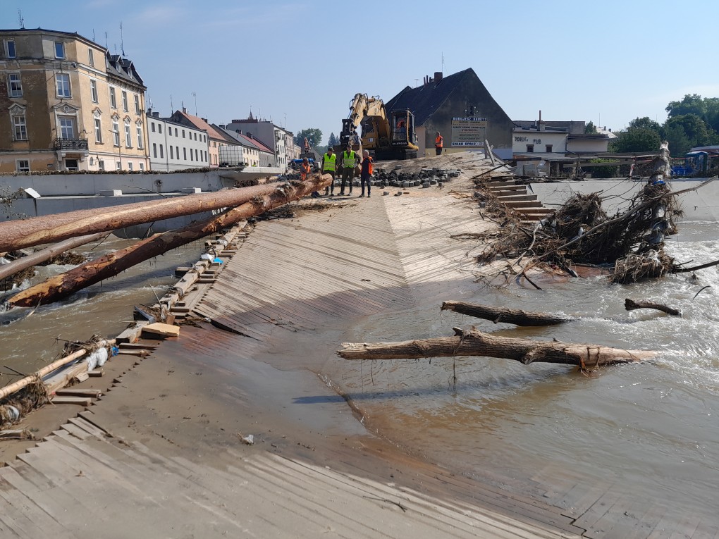 Gdy tylko sytuacja powodziowa na to pozwalała, wspólnie z wykonawcą (Himmel i Papesch Opole) rozpoczęliśmy oczyszczanie dojazdu do mostu. Wyciągaliśmy z koryta rzeki to, co można było wyciągnąć z brzegu. Od 20 września na miejscu pomagają nam żołnierze wojsk inżynieryjnych, którzy wspólnie z wykonawcą oczyszczają koryto rzeki oraz rozbierają konstrukcję mostu tymczasowego, który zalega w korycie rzeki.
