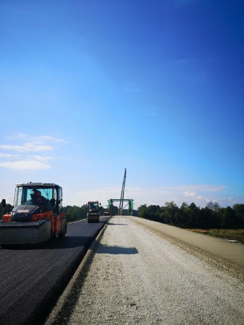 Aktualnie zaawansowanie rzeczowe jest na poziomie około 60 proc. W ramach robót drogowych na całej długości trasy głównej położono warstwę podbudowy pomocniczej z kruszywa, a niemal na całym odcinku podbudowę bitumiczną. Na większej długości odcinka trasy głównej widać już także warstwę wiążącą. Wykonawca kontynuuje prace przy budowie ronda turbinowego na początkowym odcinku obwodnicy na skrzyżowaniu z istniejącą DK40.