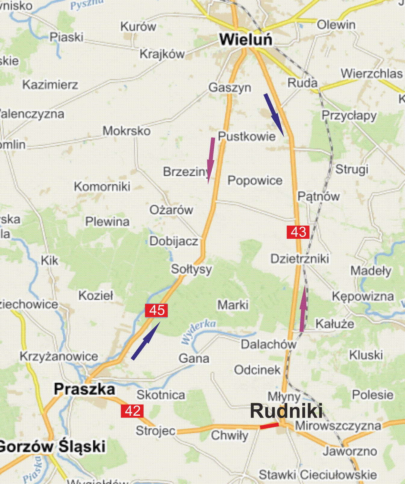 Na czas usuwania niebezpiecznych substancji przez Specjalistyczną Grupę Ratownictwa Chemiczno-Ekologicznego konieczne jest wprowadzenie objazdu dla ruchu tranzytowego. Od skrzyżowania DK42/DK45 w Praszce należy kierować się DK45 do Wielunia, a następnie DK43 do skrzyżowania DK42/DK43 w Rudnikach. Droga od Rudnik do Praszki przebiegać będzie analogicznie.