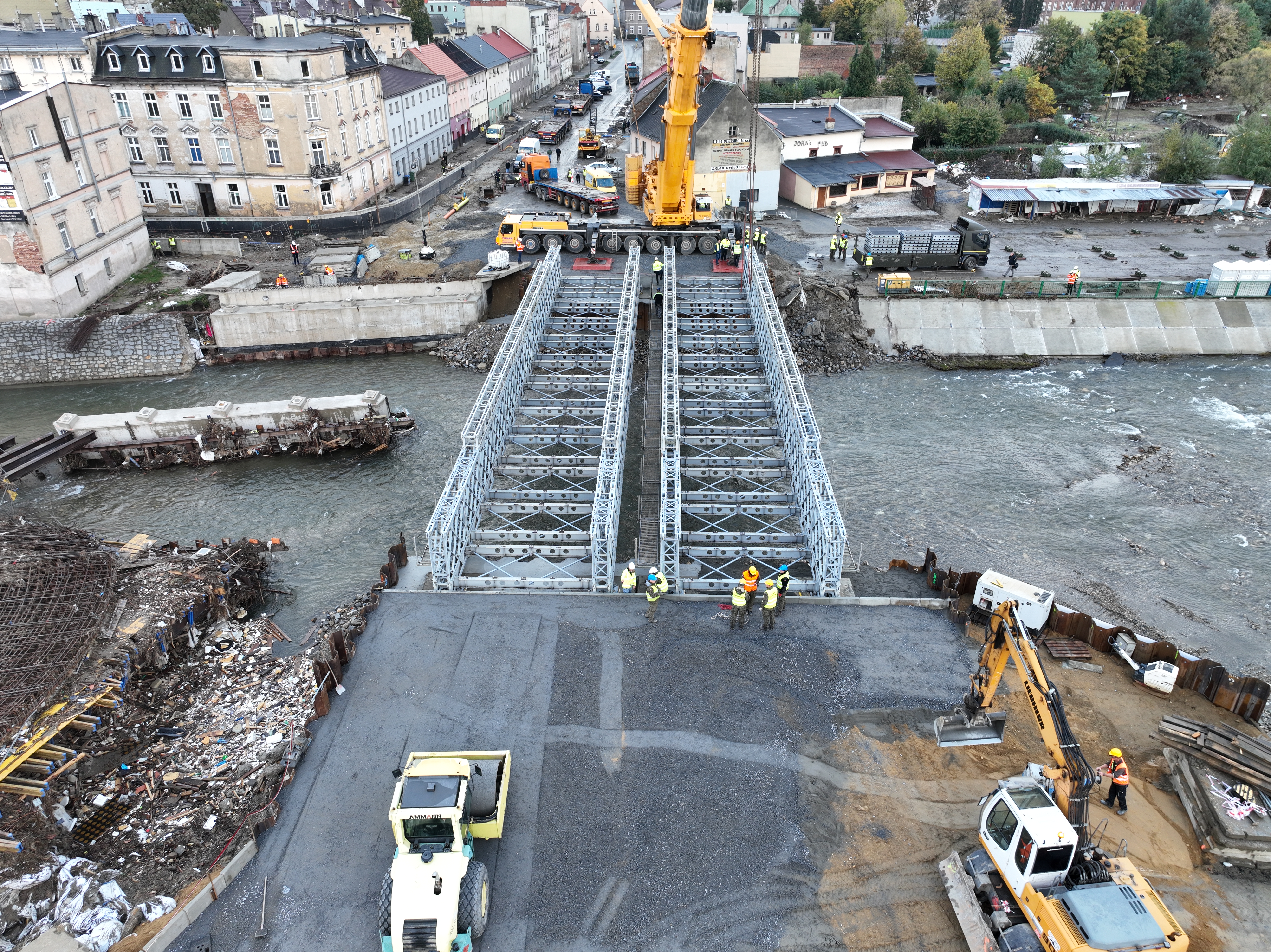 Od poniedziałku, 7 października, żołnierze przystąpili do skręcania konstrukcji mostu tymczasowego DMS-65, a w piątek (11 października) posadowili dwie konstrukcje mostu na przygotowanych przyczółkach i wypełnili pomost płytami. Aktualnie wykonawca kontynuuje prace przy budowie dojazdów do obiektów oraz rozpoczął prace przy odbudowie chodników.