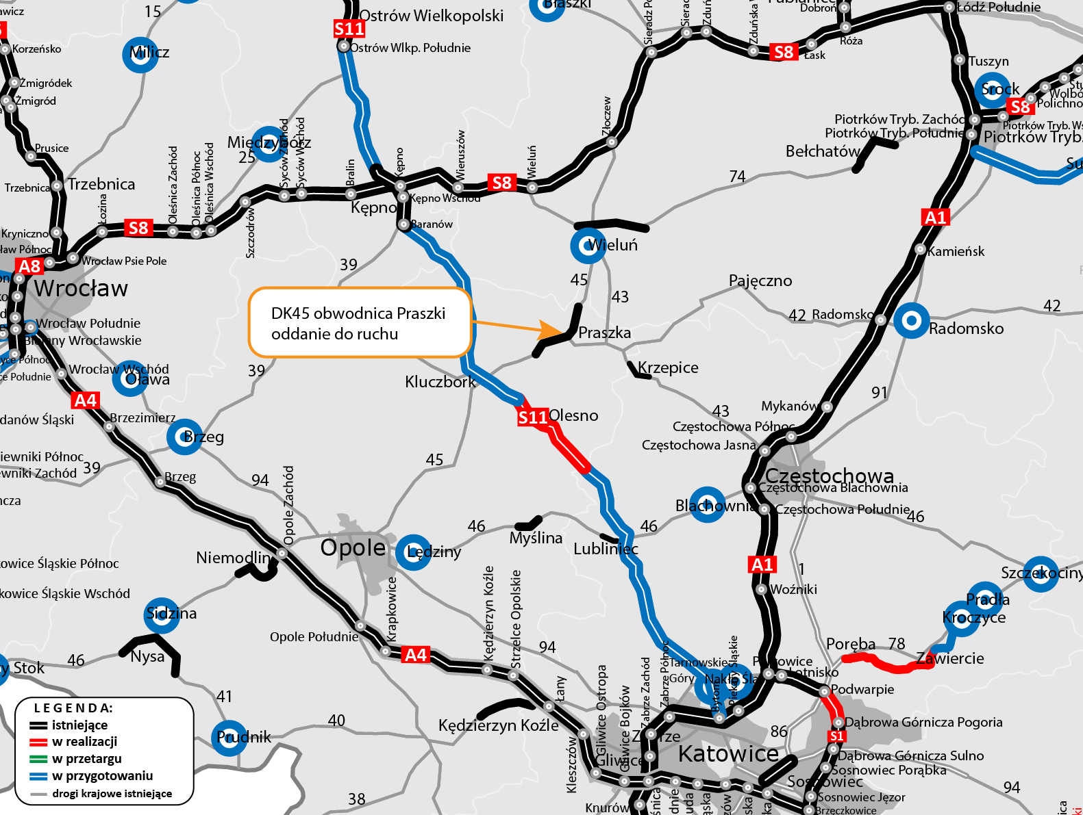 Prace przy budowie blisko 13-kilometrowego odcinka obwodnicy Praszki w ciągu DK45 dobiegły końca. Od dzisiaj ruch tranzytowy omija centrum tego miasta i sąsiedniego Gorzowa Śląskiego. Obwodnica Praszki to jedna z kilku inwestycji realizowanych aktualnie na terenie woj. opolskiego w ramach Programu Budowy Dróg Krajowych.