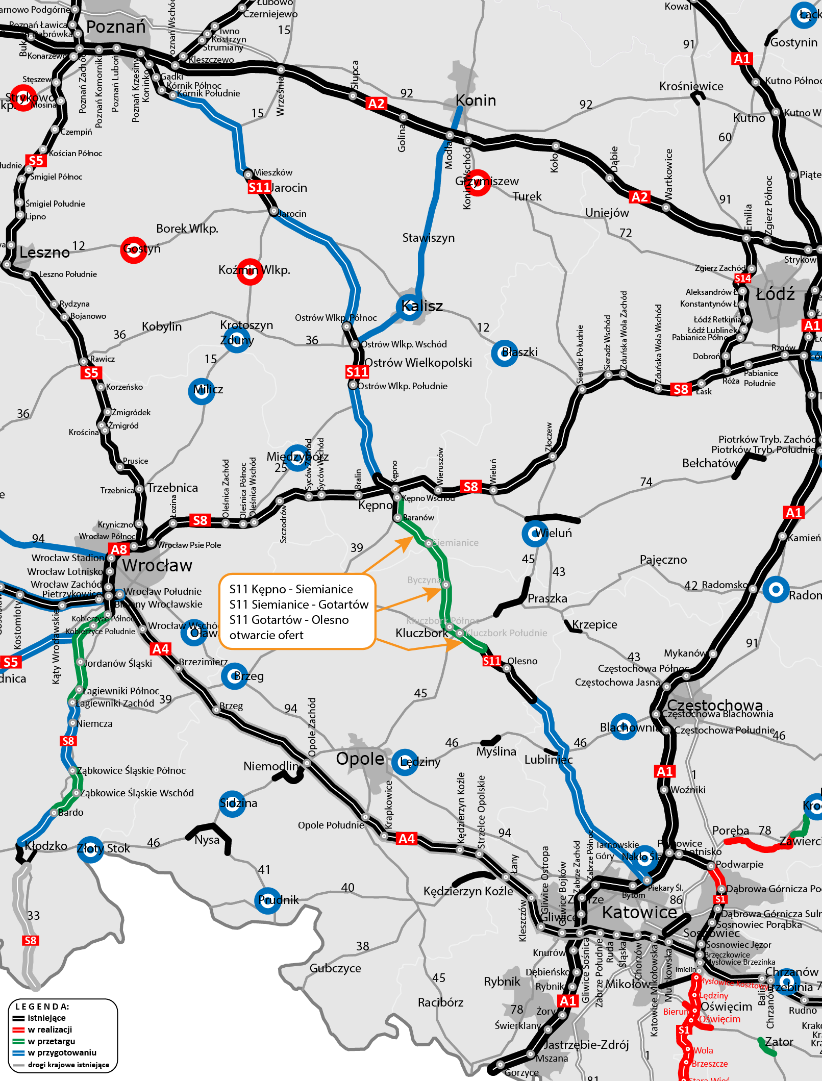 Trwa przetarg na zaprojektowanie i budowę S11 na odcinku Oborniki – Poznań wraz z obwodnicą Obornik. Termin składania ofert upływa 6 grudnia br. o godz. 9. Ponadto, w przyszłym roku planujemy ogłosić postępowanie przetargowe dla kolejnego odcinka S11 tj. Ostrów Wielkopolski – Kępno.