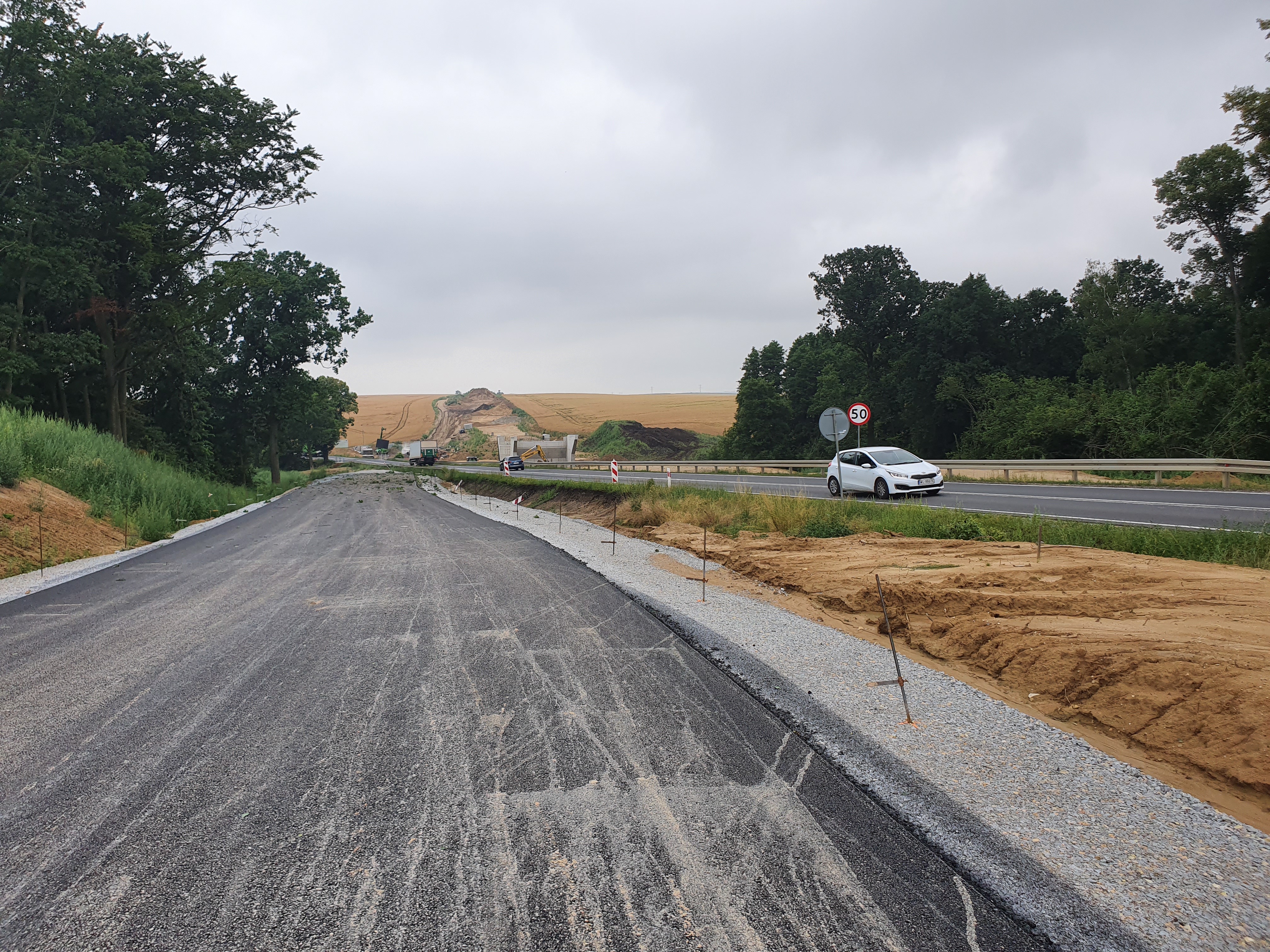 Prawie na całej długości nowego odcinka drogi położona jest już warstwa podbudowy pomocniczej z kruszywa, na ponad połowie podbudowa bitumiczna, a na niemal 30 proc. widać już warstwę wiążącą. Trwają prace ziemne przy budowie ronda turbinowego na początkowym odcinku obwodnicy na skrzyżowaniu z DK40.
