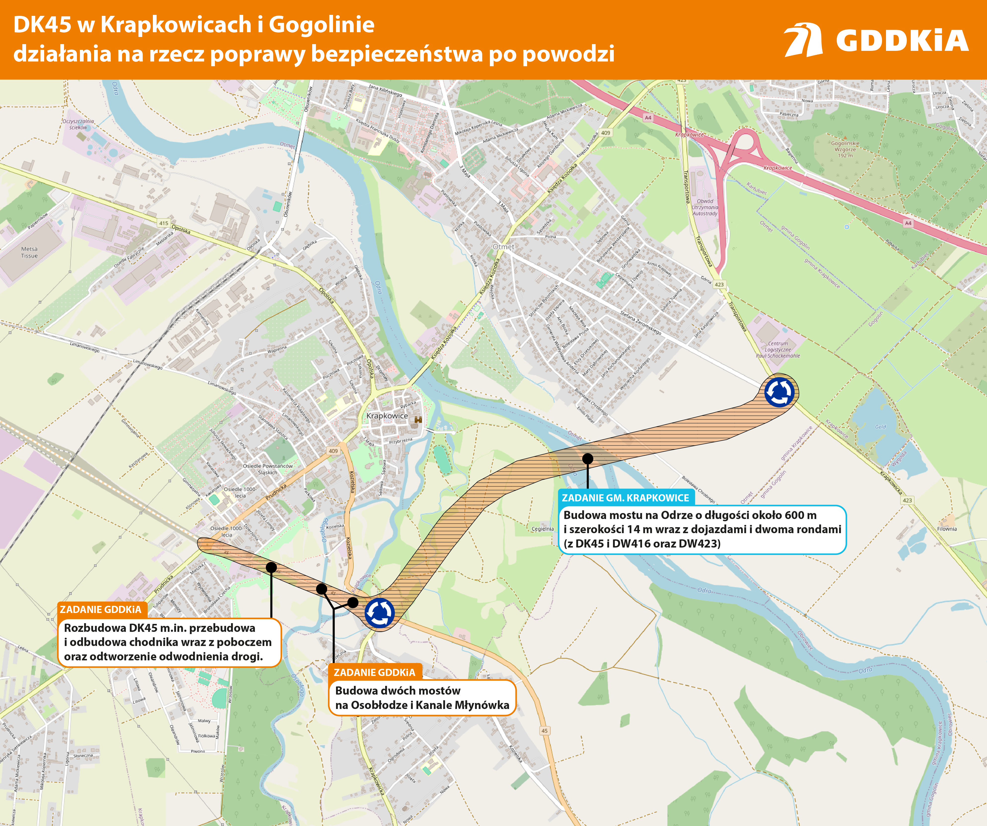 Rozbudowa drogi krajowej obejmuje odcinek od ronda z DW409 do skrzyżowania z DW416 w kierunku Żywocic. Inwestycja pozwoli na przywrócenie ciągłości DK45, przerwanej na skutek powodzi. Prace uwzględniają odbudowę drogi na odcinku 1,2 km, rozbiórkę i budowę dwóch mostów na Osobłodze i Kanale Młynówka, rozbudowę skrzyżowania z ul. Kozielską, przebudowę i odbudowę chodnika wraz z poboczem na całej długości oraz odtworzenie odwodnienia drogi.