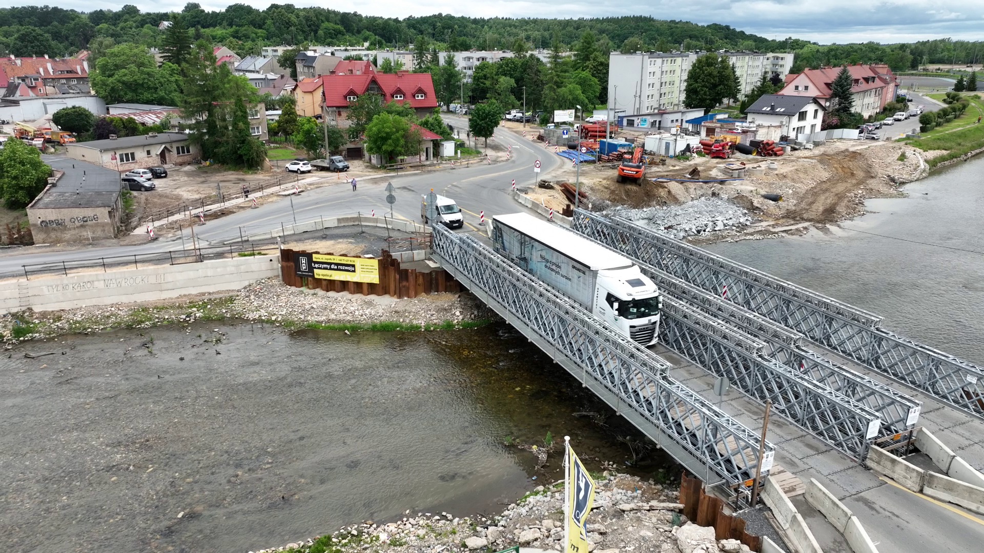 Przypominamy, że na obiekcie tymczasowym obowiązuje ograniczenie prędkości do 30 km/h. Niestety kierowcy często przejeżdżają przez most znacznie szybciej co powoduje uszkodzenia nawierzchni z płyt. W konsekwencji prowadzi to do utrudnień w ruchu, wynikających z konieczności wymiany uszkodzonych elementów. Apelujemy o stosowanie się do ograniczeń prędkości, a w szczególności unikanie gwałtownych przyśpieszeń i hamowań.