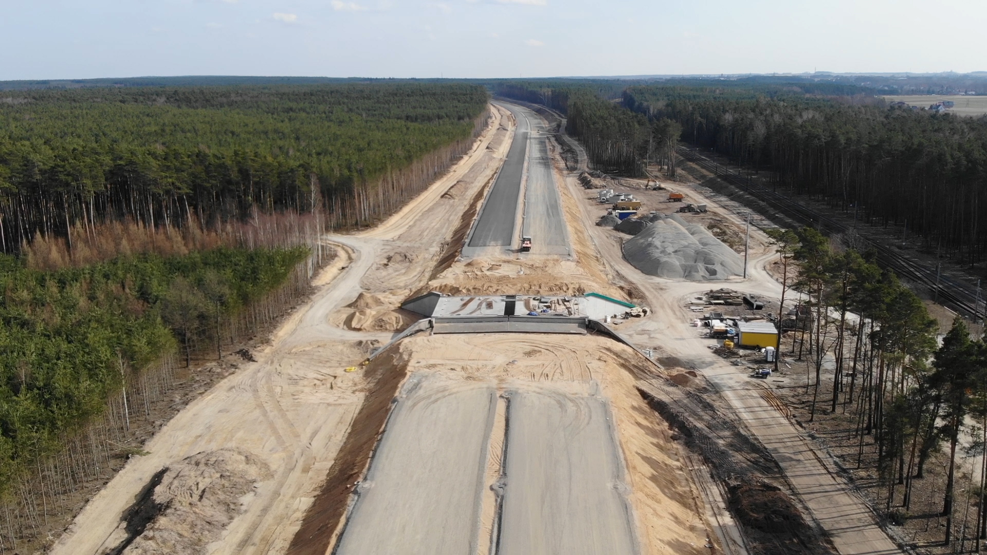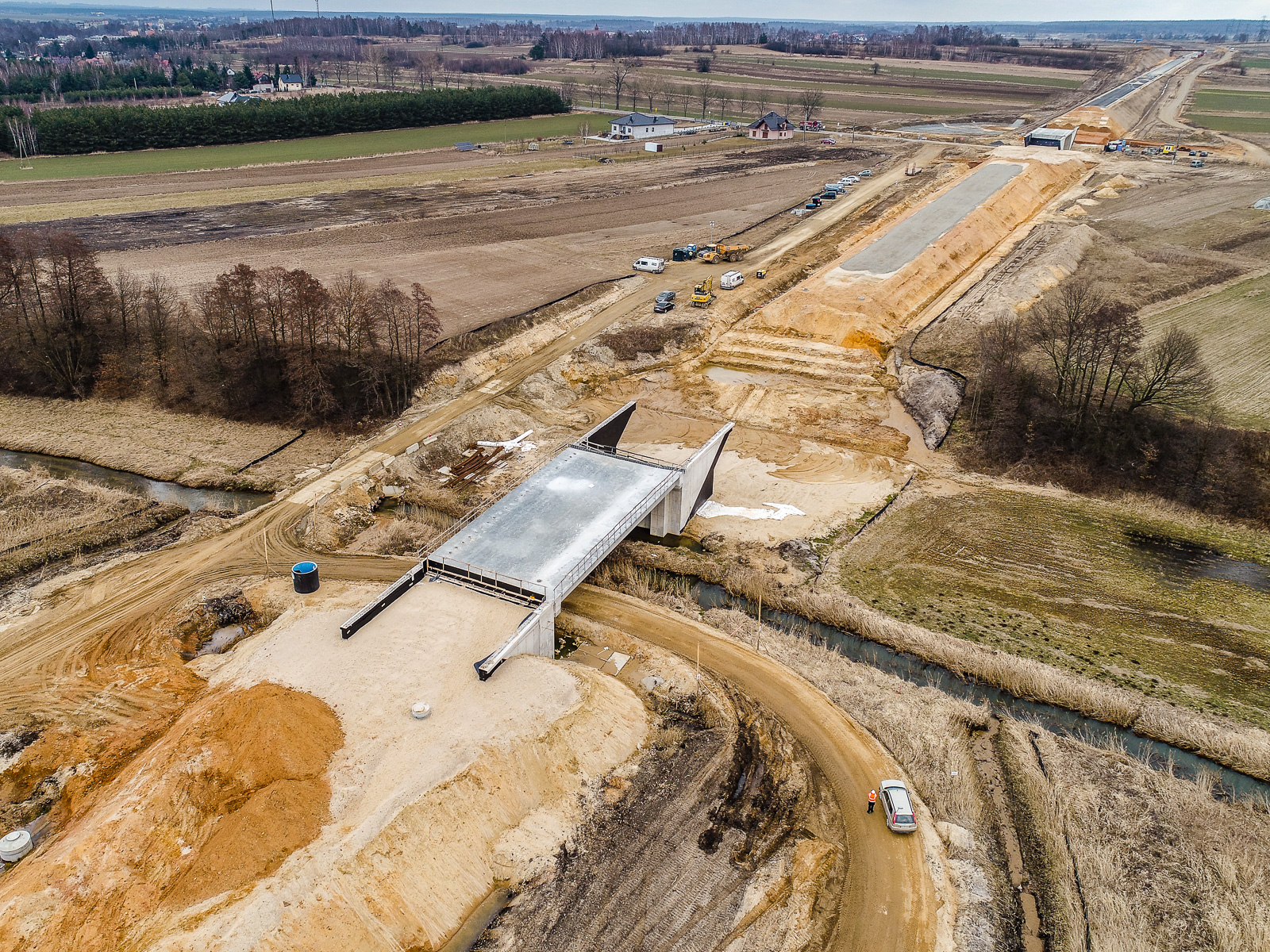 Finalizowane są roboty ziemne w zakresie wykopów, nasypów oraz wzmocnienia podłoża w ciągu trasy głównej oraz dróg poprzecznych. Kontynuowane są prace w zakresie układania warstw konstrukcyjnych jezdni. Warstwa podbudowy z kruszywa jest już widoczna na znacznym odcinku trasy głównej. Wykonawca kontynuuje prace przy układaniu warstw bitumicznych (podbudowa zasadnicza oraz warstwa wiążąca). Prowadzone są prace na 24 obiektach mostowych, m.in. w zakresie ustrojów nośnych oraz prac wykończeniowych niektórych z obiektów oraz zbrojenia i betonowania przyczółków.
