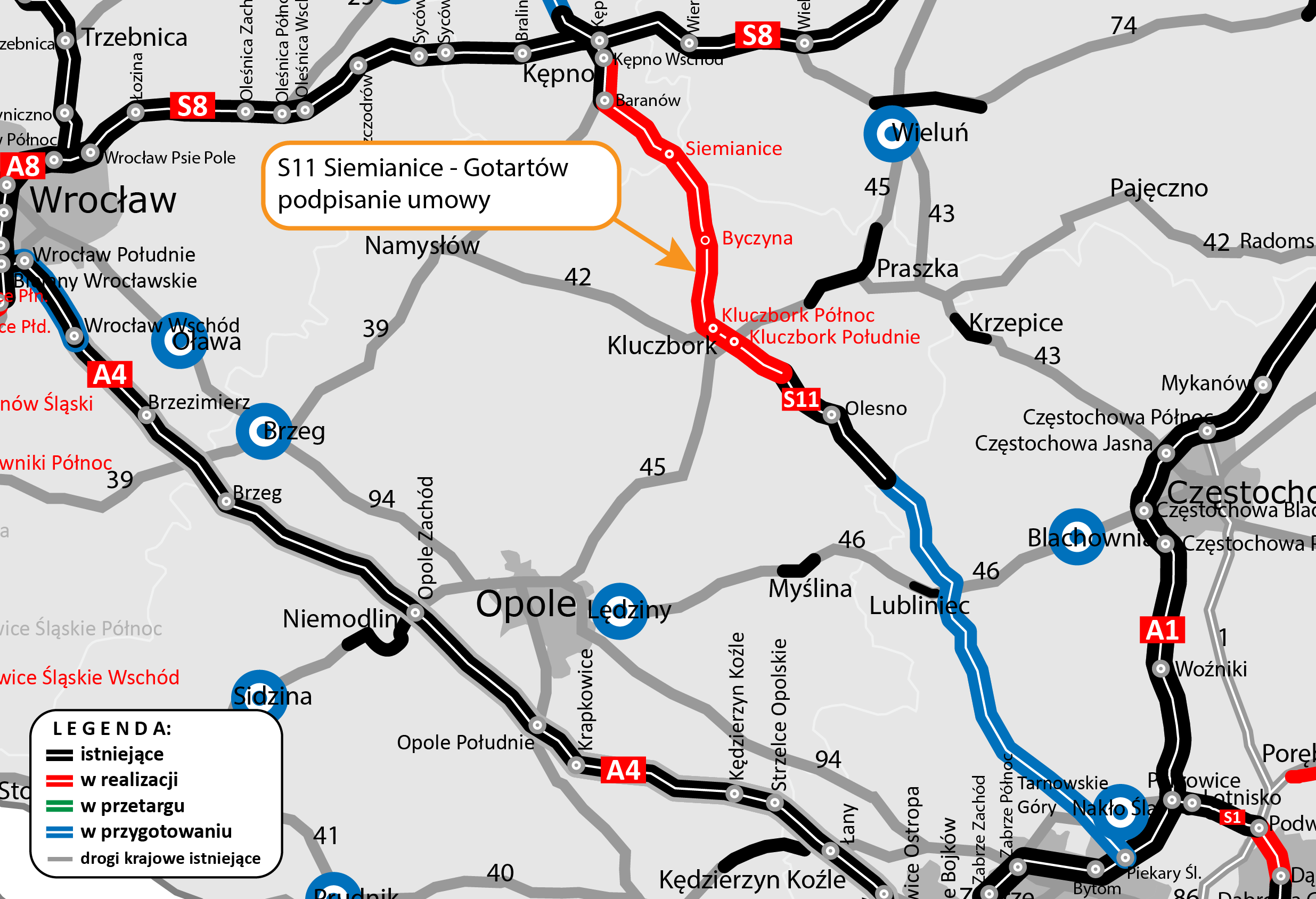 26 kwietnia br. podpisaliśmy umowę na budowę 10,5-kilometrowego odcinka S11 pomiędzy Gotartowem i początkiem obwodnicy Olesna. Za przygotowanie projektu budowlanego oraz realizację prac w terenie odpowiedzialne jest konsorcjum firm Mirbud (lider) oraz Kobylarnia. Wartość umowy to 464,9 mln zł.