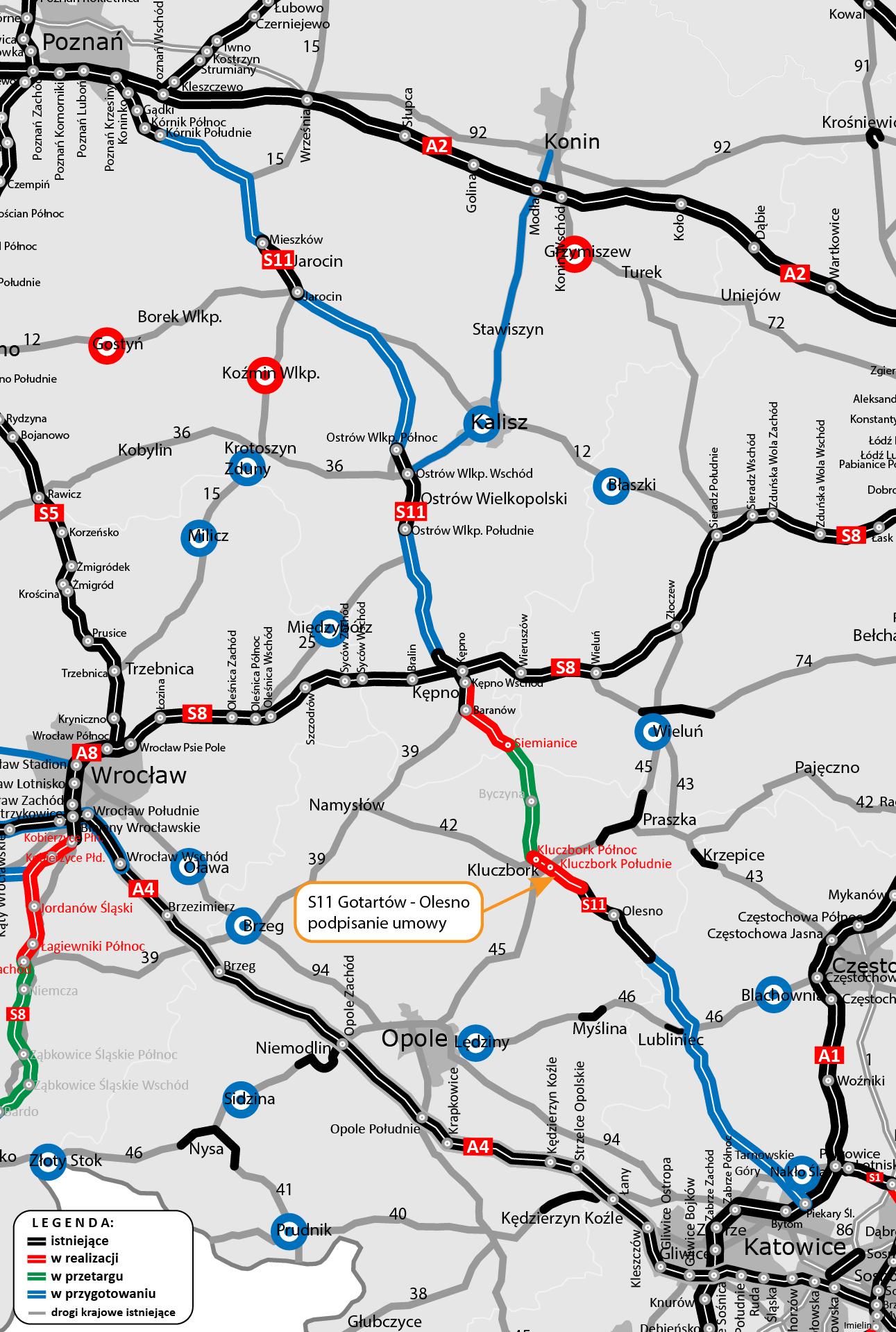 Podpisaliśmy umowę na budowę 10,5-kilometrowego odcinka S11 pomiędzy Gotartowem i początkiem obwodnicy Olesna. To jeden z trzech odcinków 46-kilometrowej trasy, który będzie realizowany w najbliższym czasie. Za przygotowanie projektu budowlanego oraz realizację prac w terenie odpowiedzialne będzie konsorcjum firm Mirbud (lider) oraz Kobylarnia (partner). Wartość umowy to 464,9 mln zł, z czasem realizacji 39 miesięcy (bez okresów zimowych, 16 grudnia – 15 marca, w trakcie prac budowlanych).
