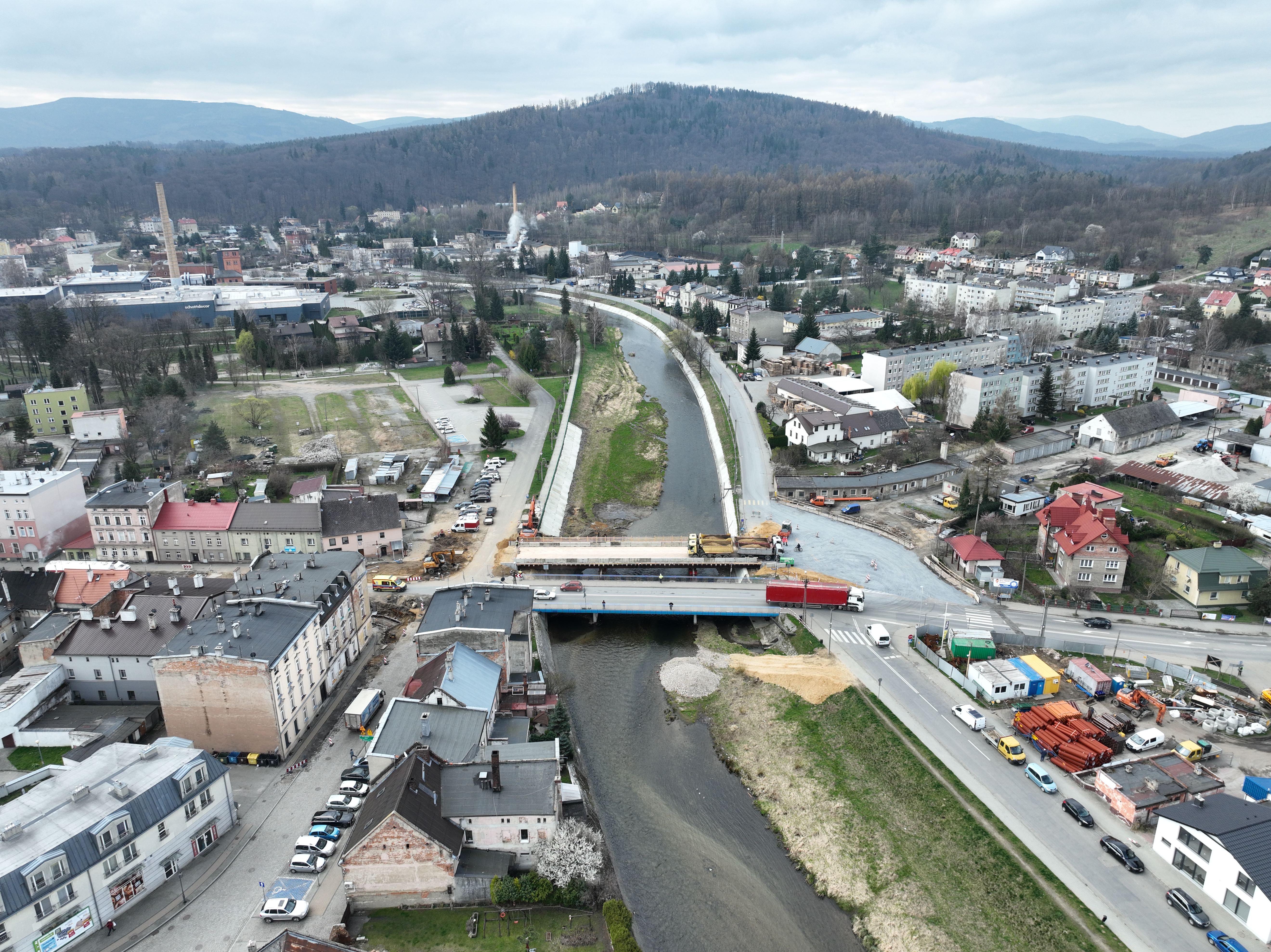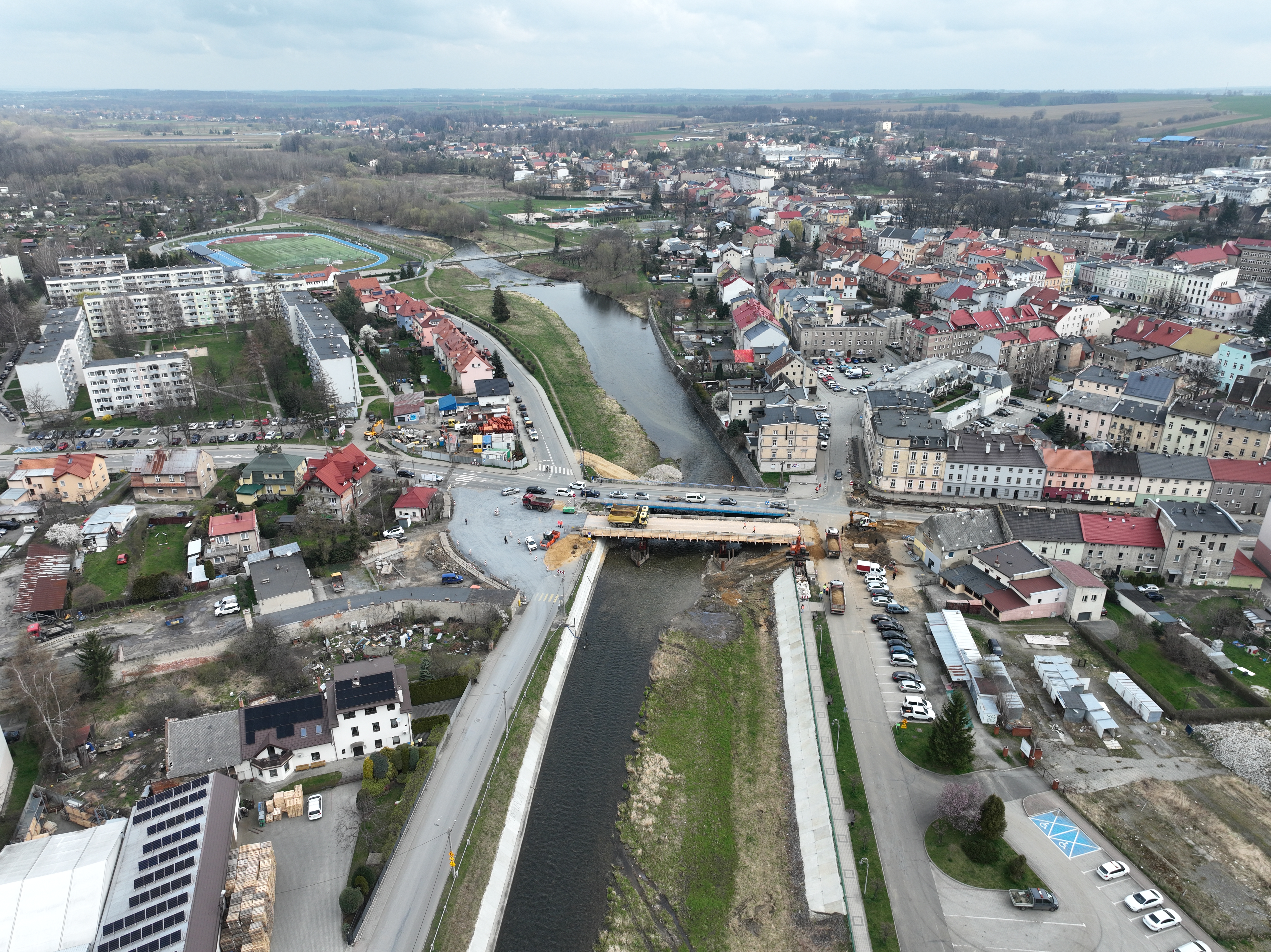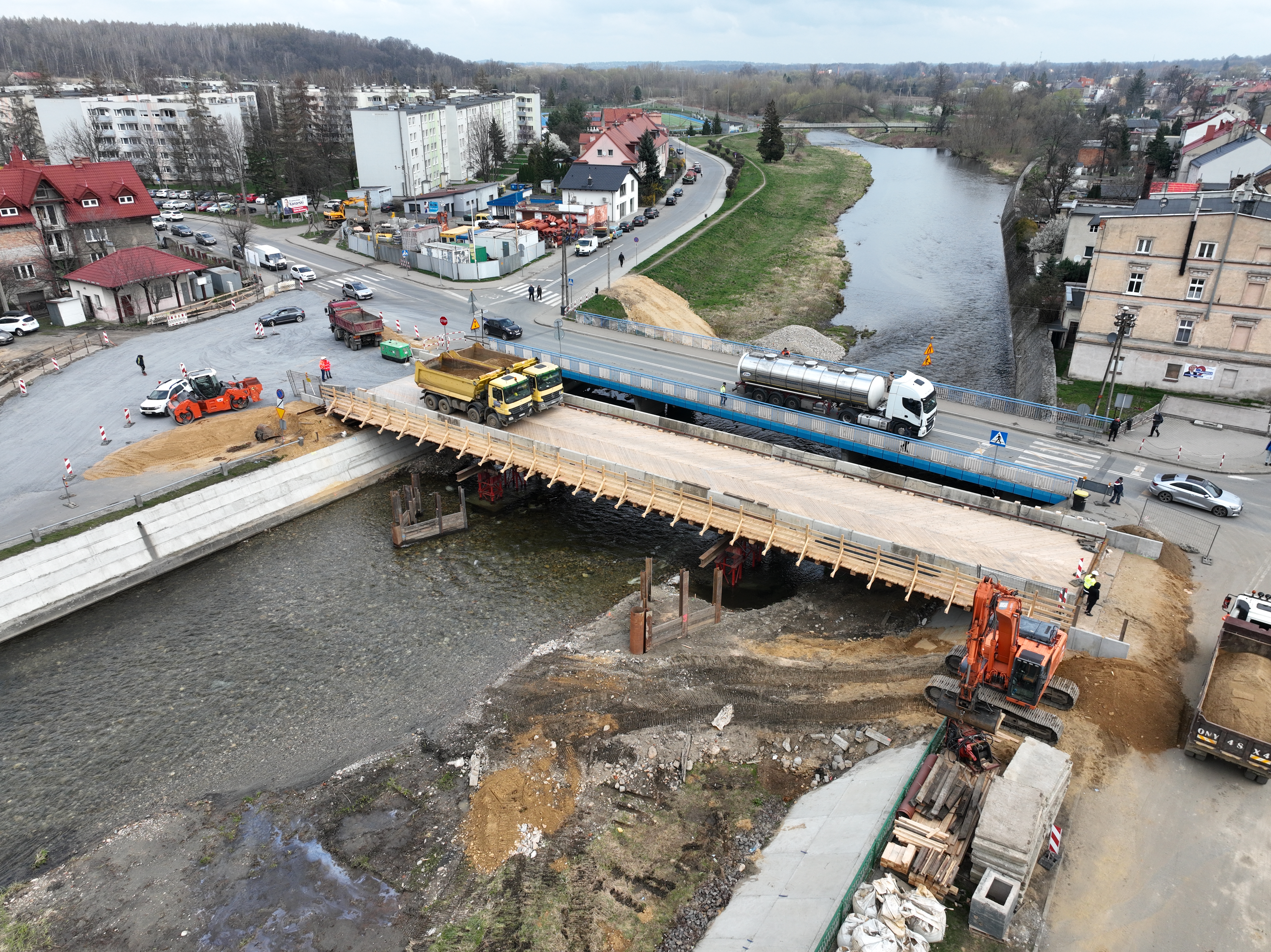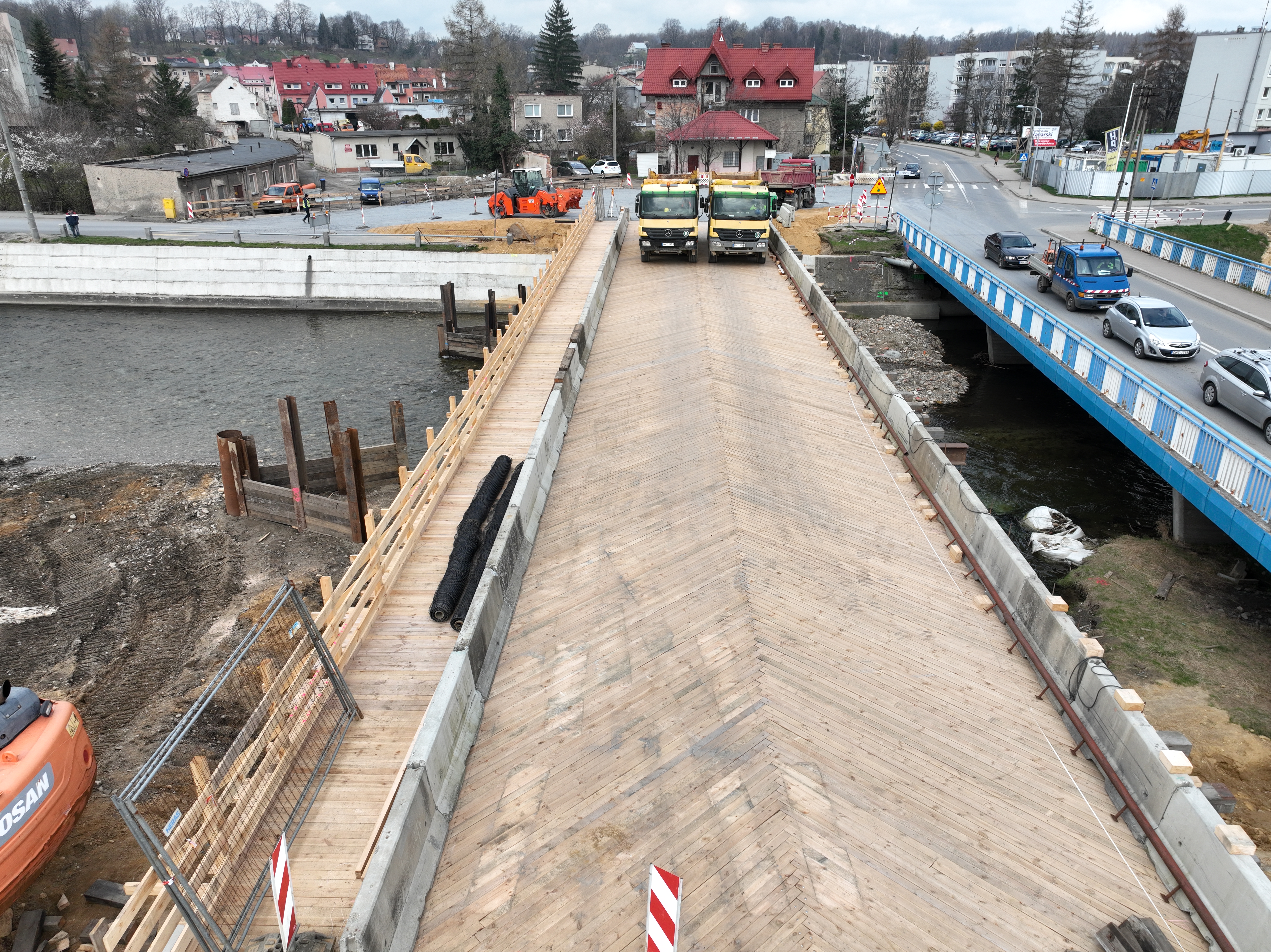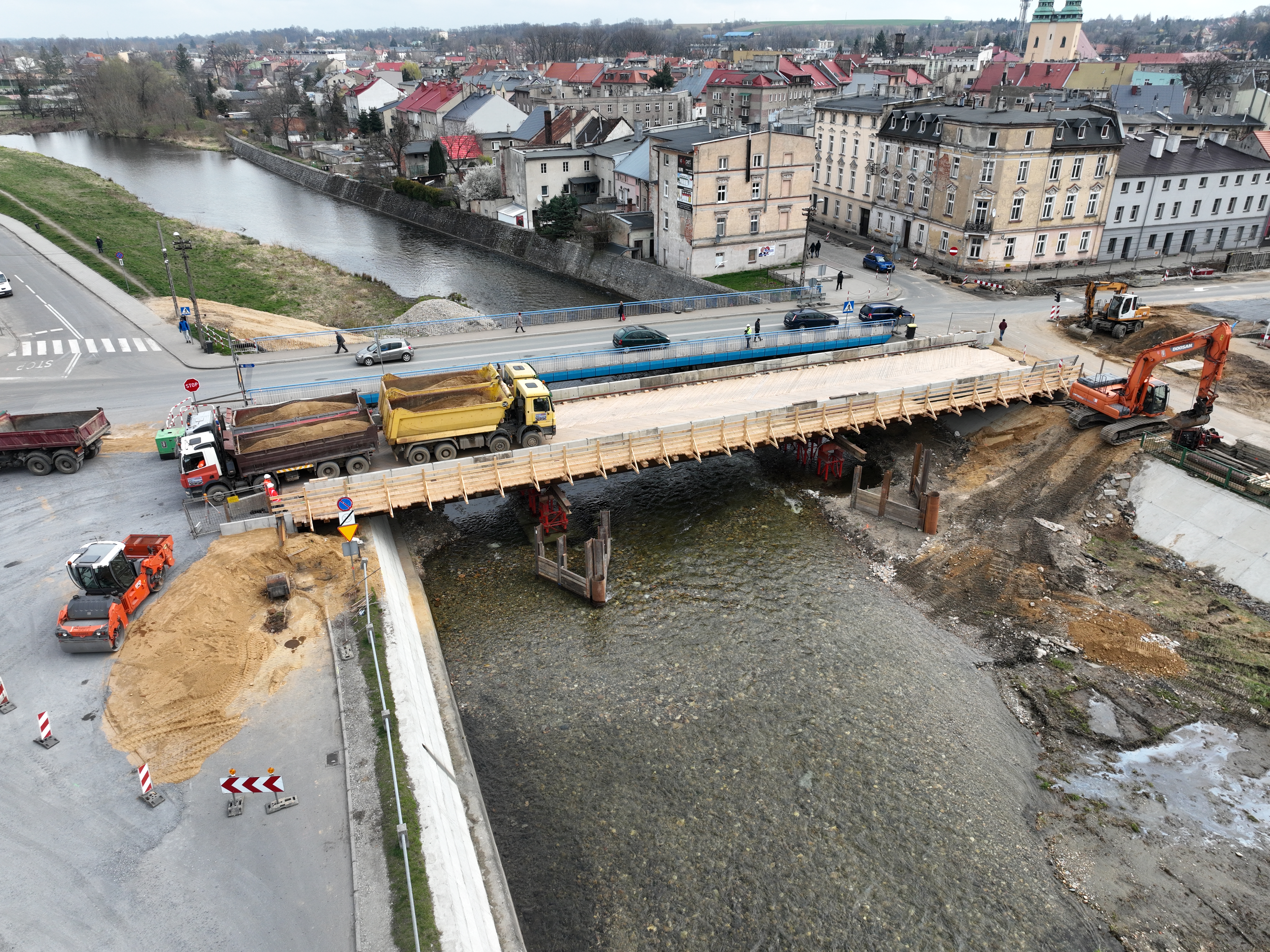 Na przełomie marca i kwietnia zaplanowano przełożenie ruchu na most tymczasowy. Na obiekcie o długości 47 m i szerokości 10 m przewidziany jest ruch kołowy w obu kierunkach oraz ruch pieszy (po jednej stronie obiektu zlokalizowany jest chodnik). Przełożenie ruchu umożliwi wyburzenie starego mostu i budowę nowego, trzyprzęsłowego o wysokich parametrach nośności. Jego konstrukcja powinna być gotowa do końca roku.