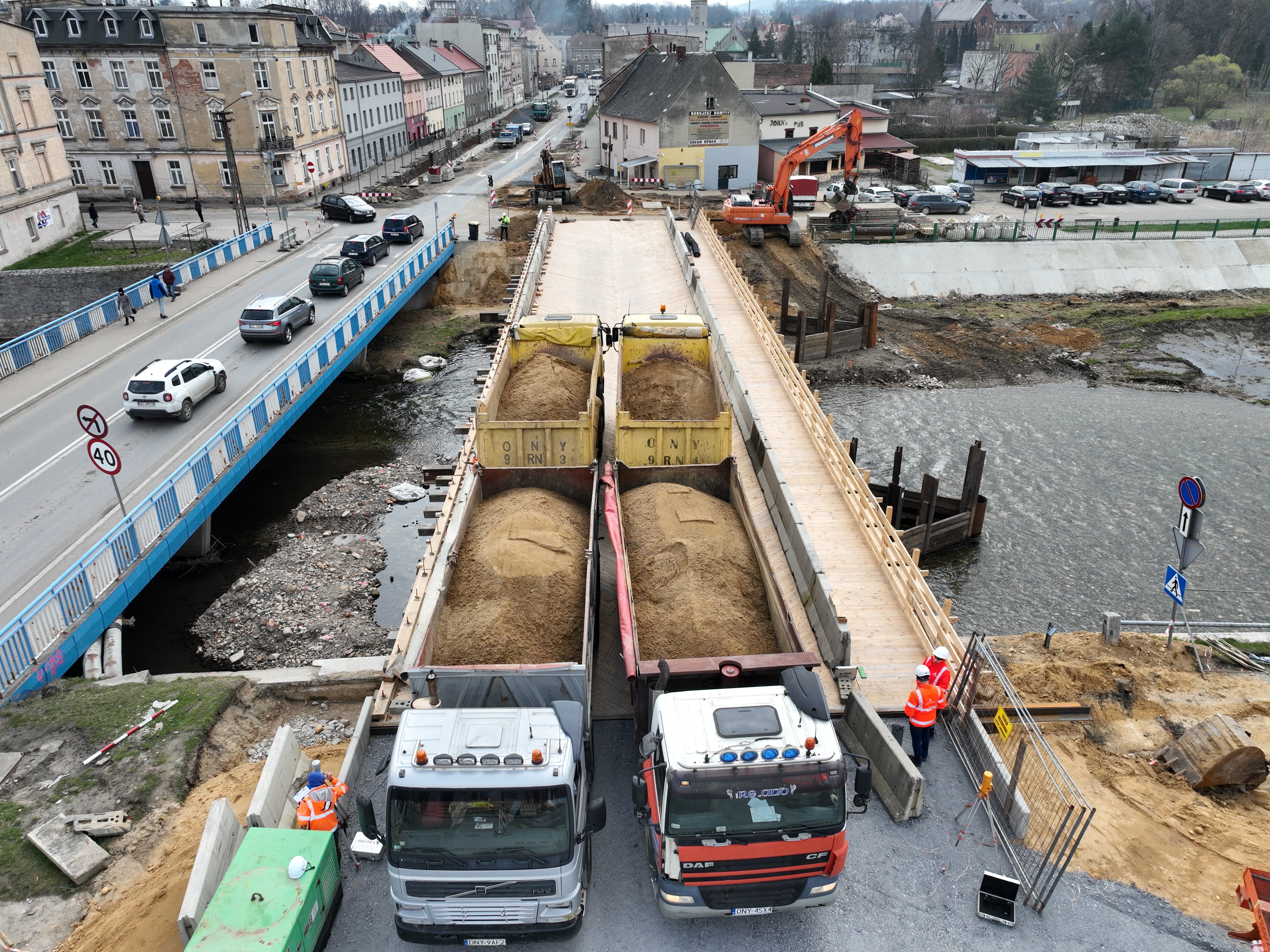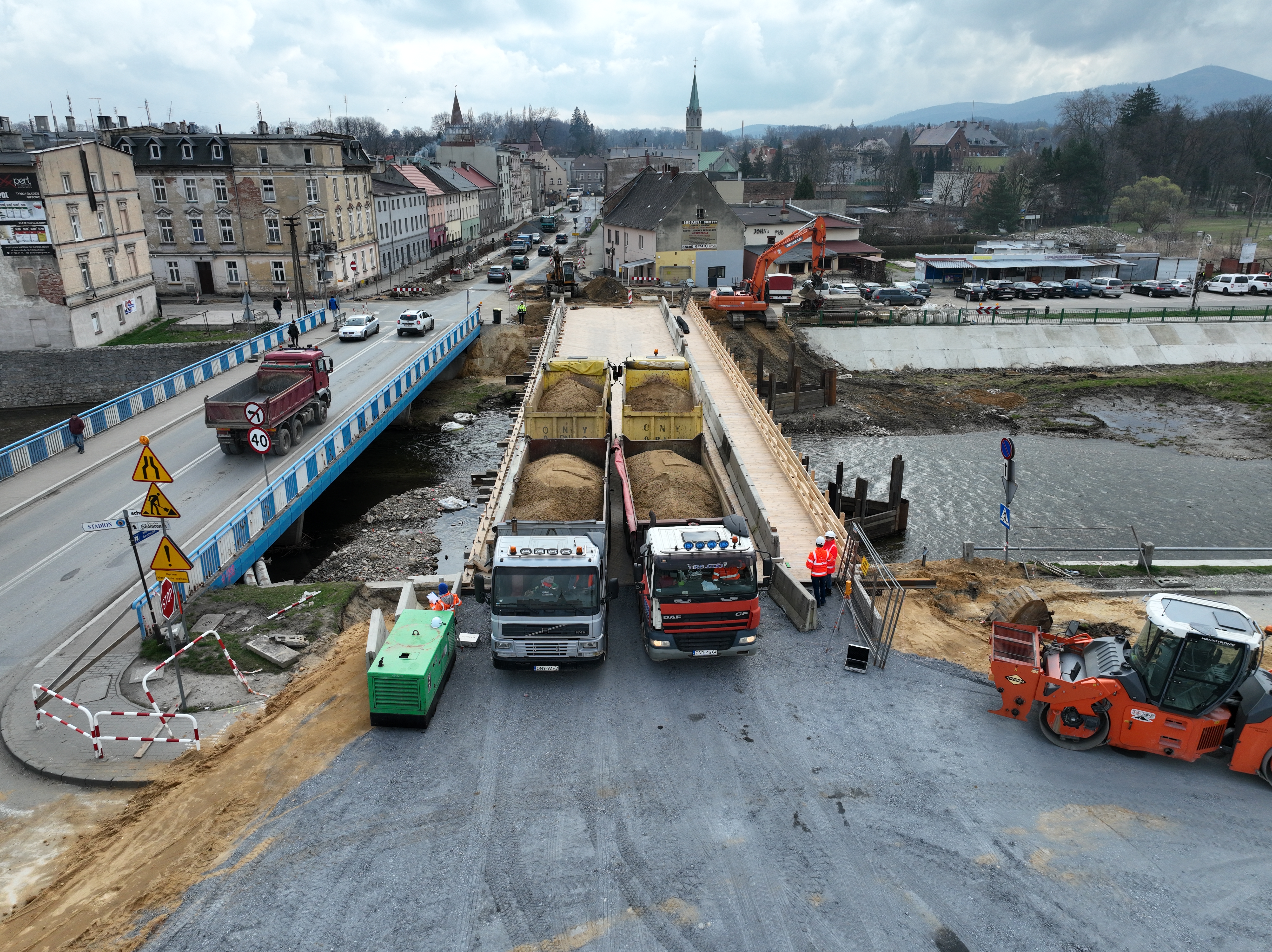 W tym tygodniu wykonawca przeprowadził próbne obciążenia dla obiektu tymczasowego wybudowanego nad rzeką Biała Głuchołaska w Głuchołazach. Przeprawa, która przejmie ruch na czas budowy nowego mostu, powstała w ramach trwającej rozbudowy drogi krajowej nr 40.