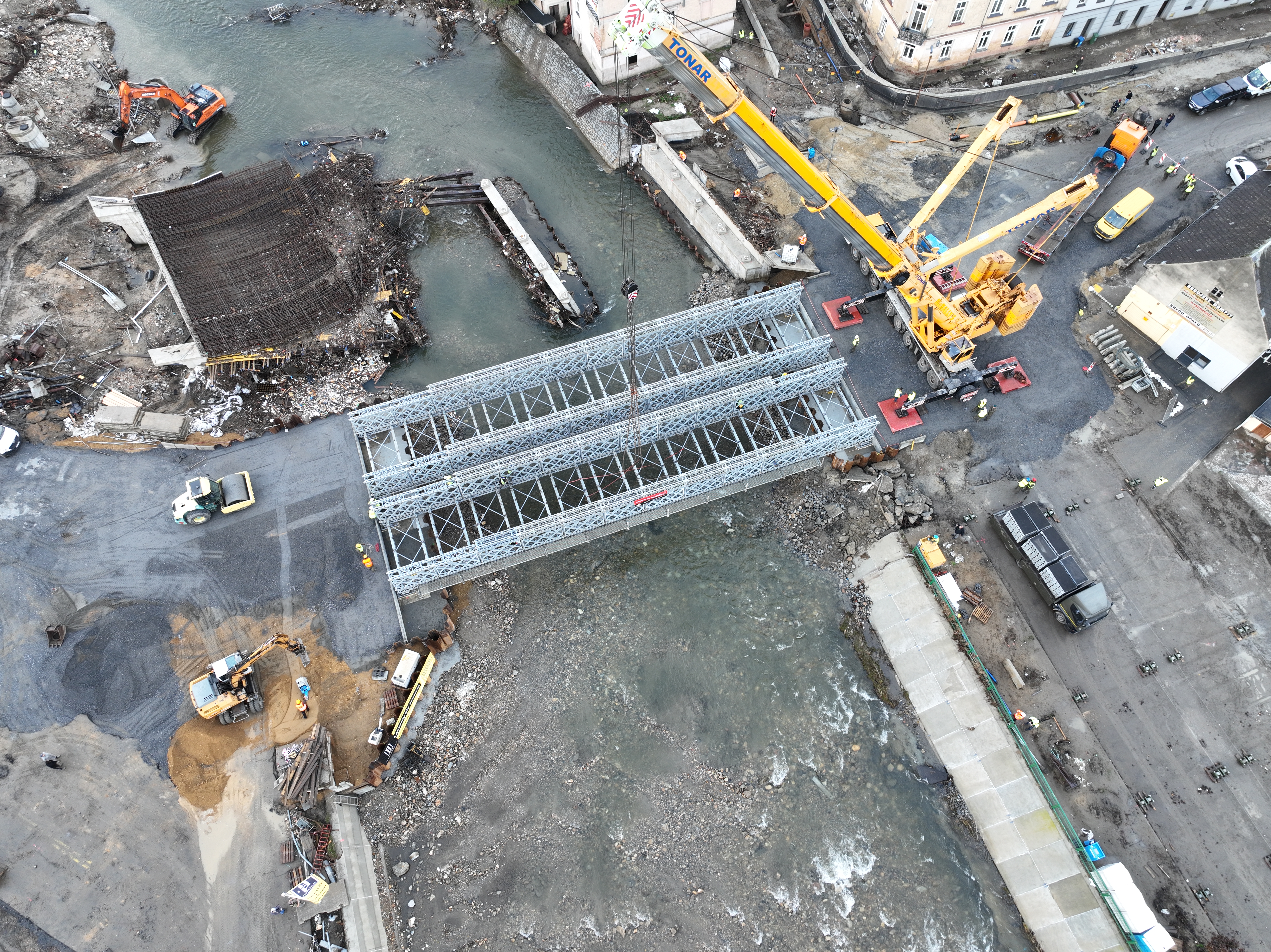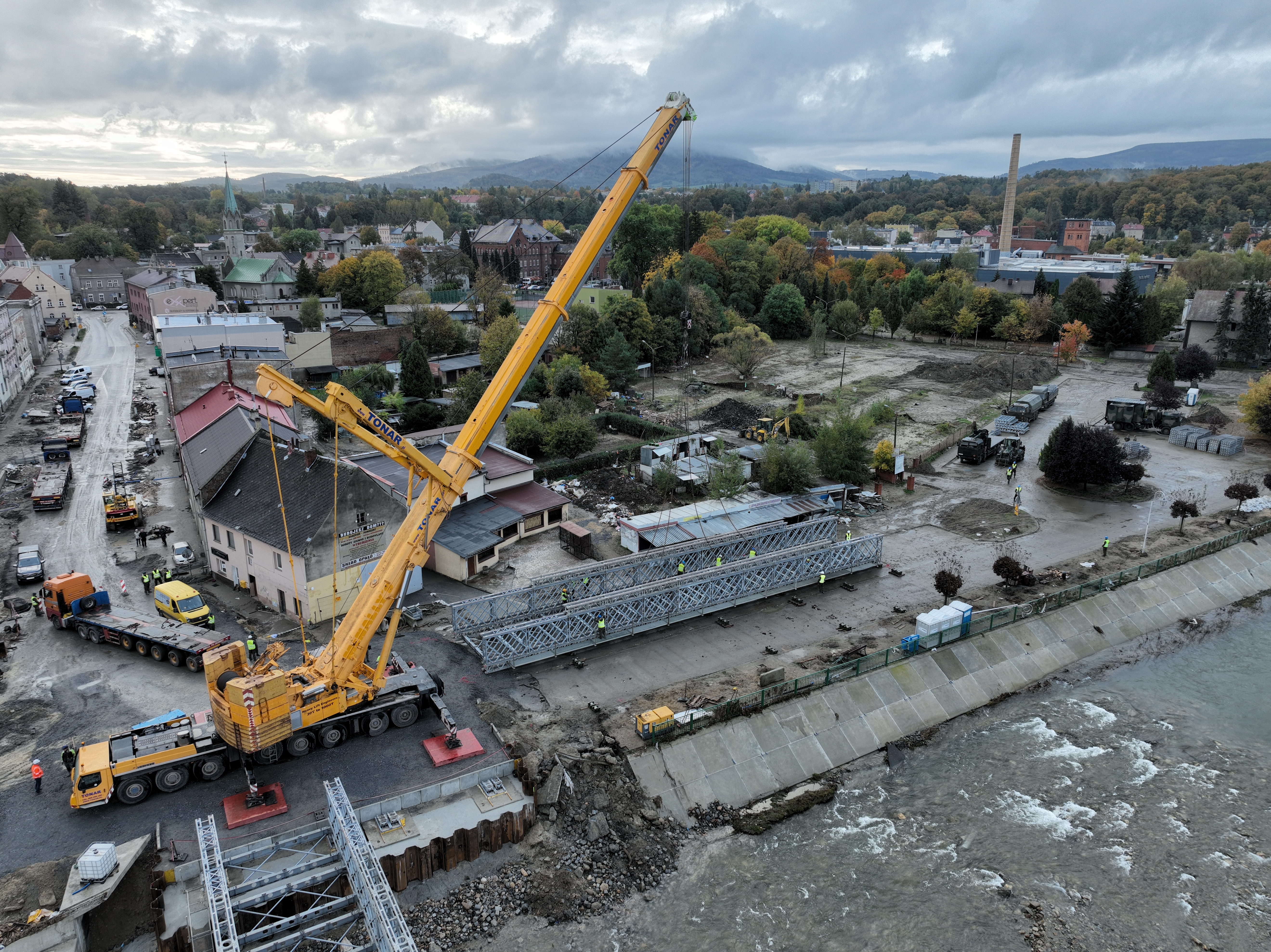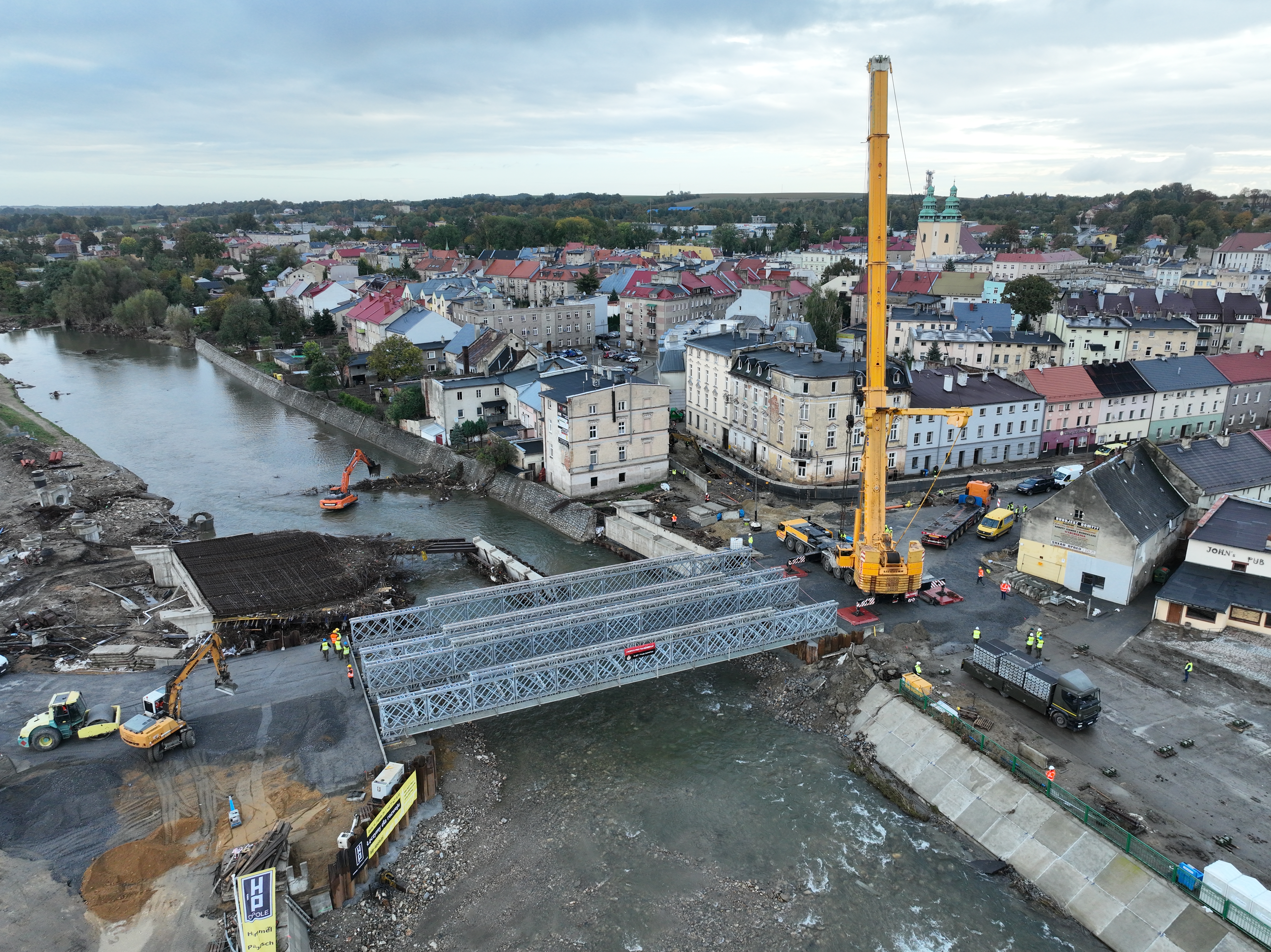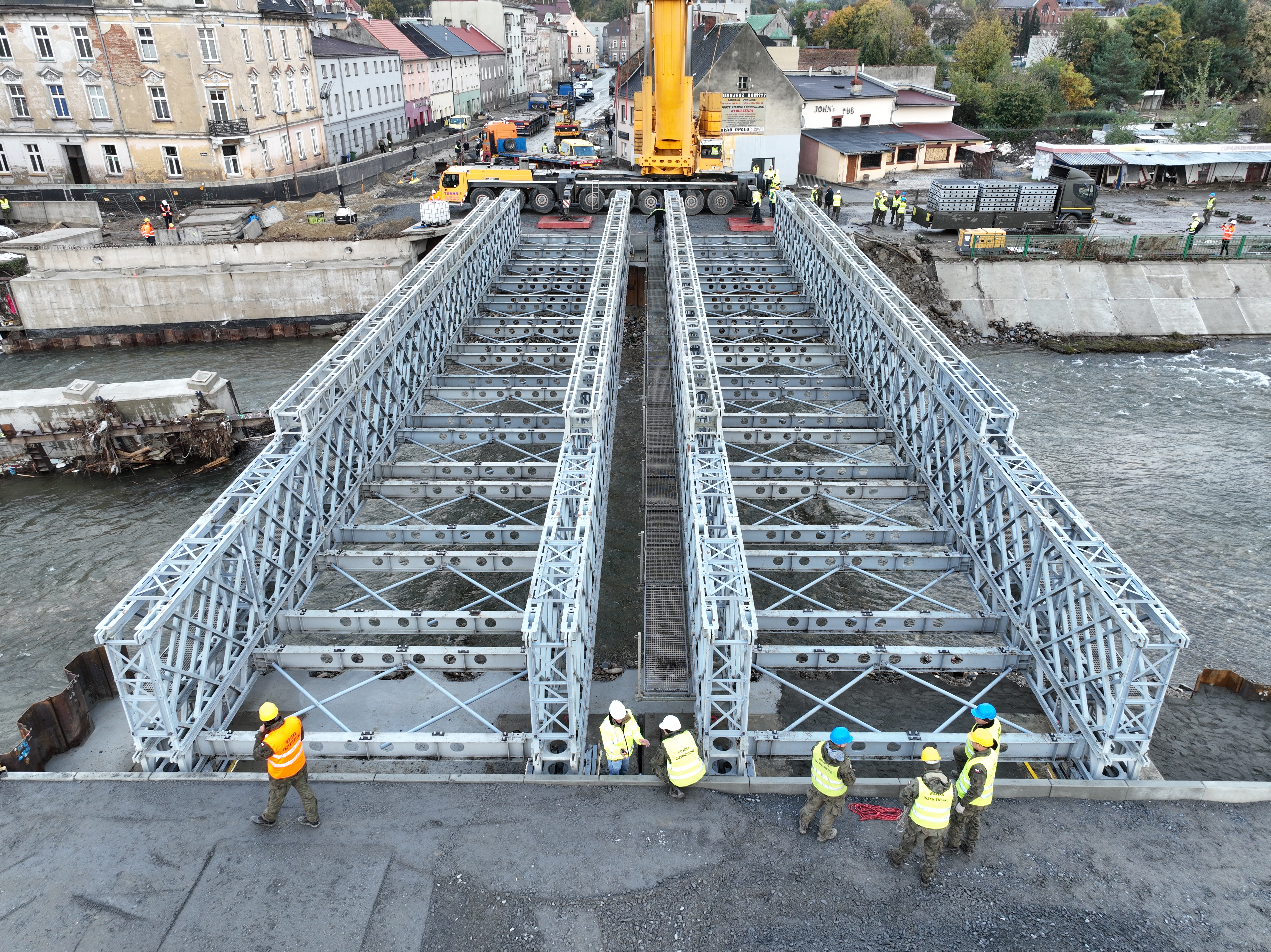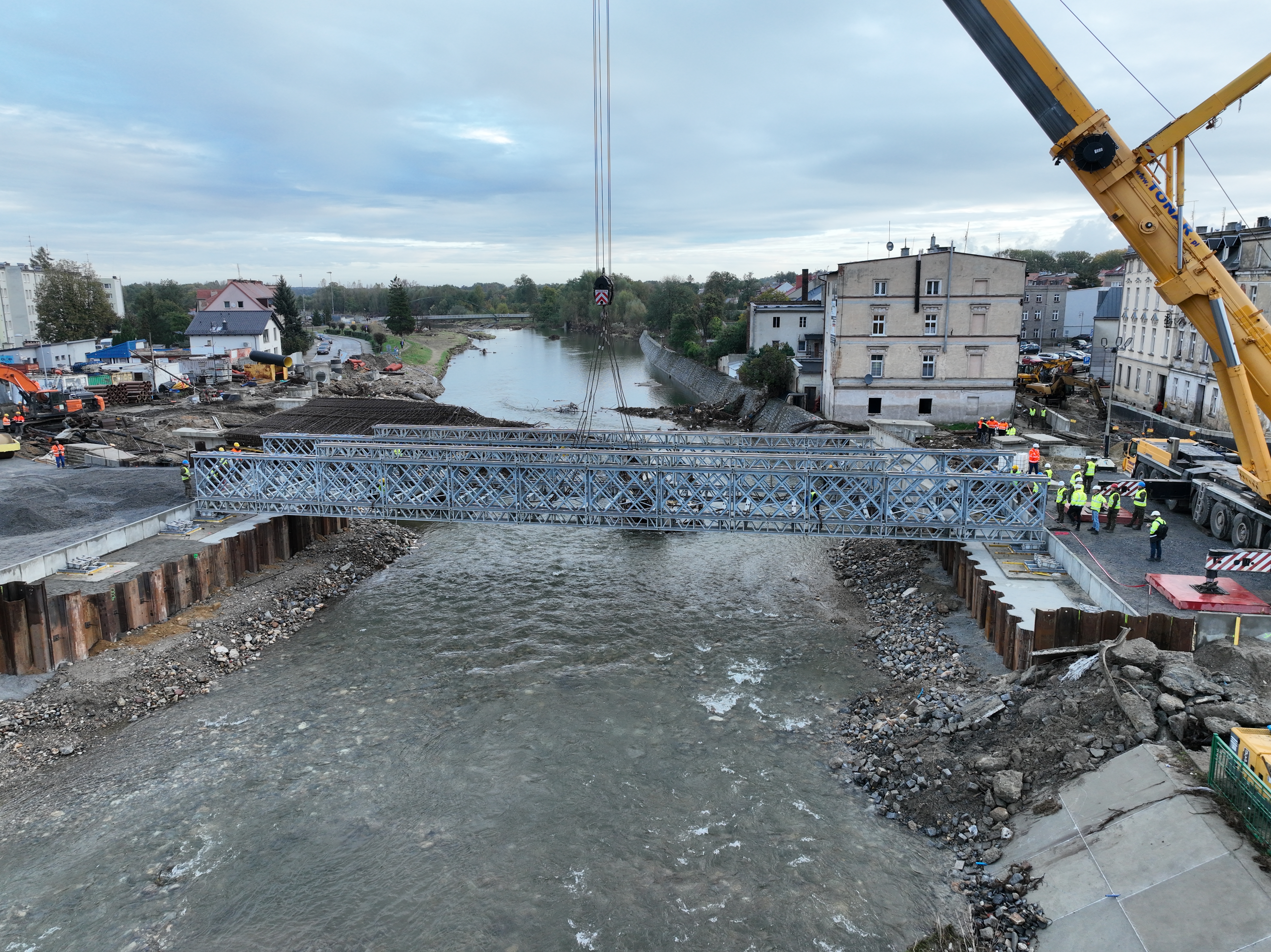 Na środę zaplanowaliśmy przeprowadzenie próbnych obciążeń, a w piątek (25 października) uruchomienie tymczasowego mostu. Tym samym ponownie skomunikujemy obie części miasta, które w połowie września zostały zniszczone przez wezbrane wody Białej Głuchołaskiej.