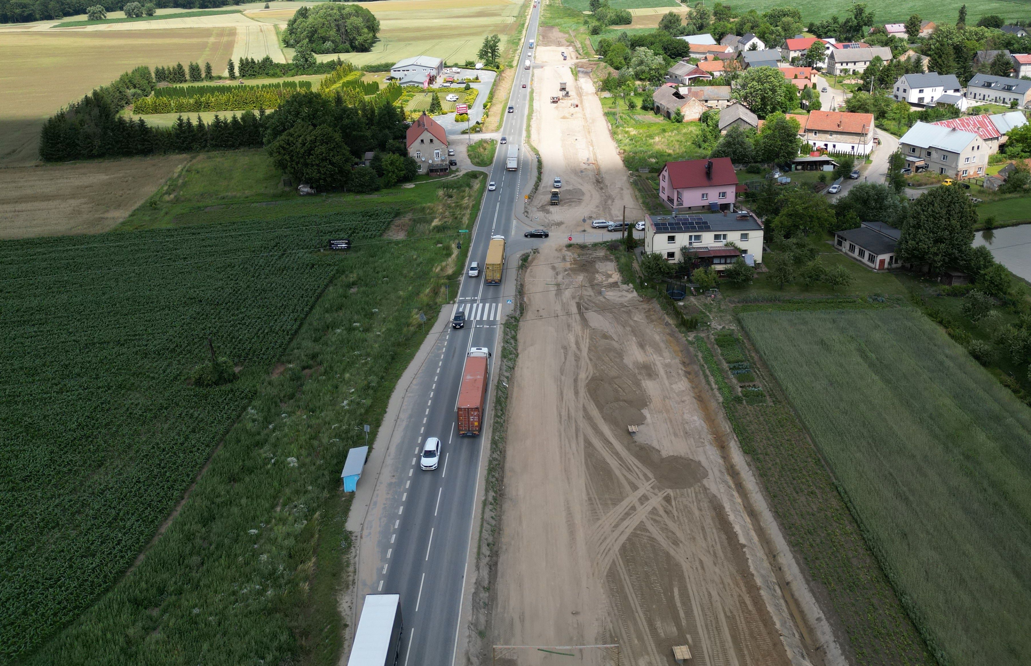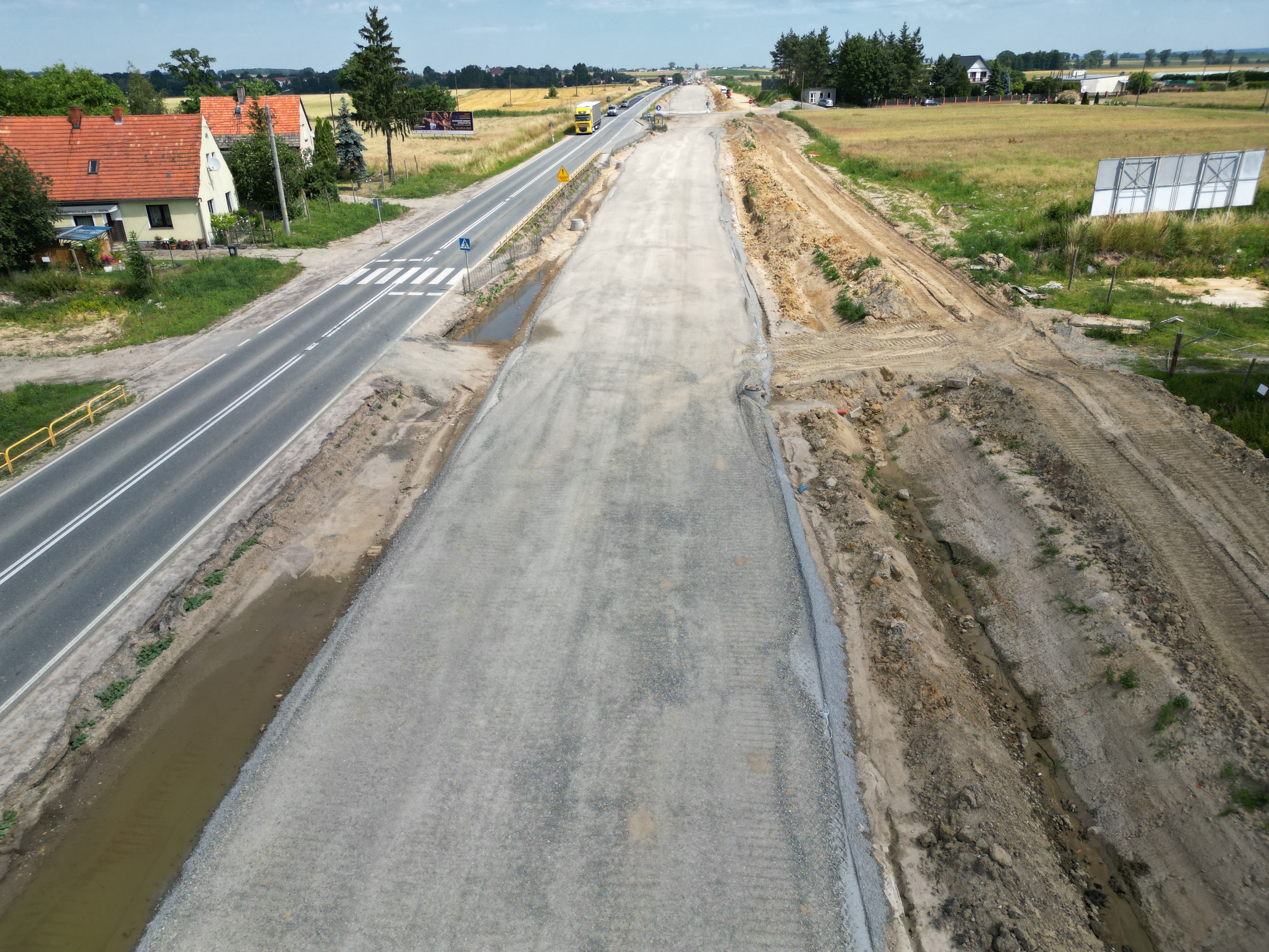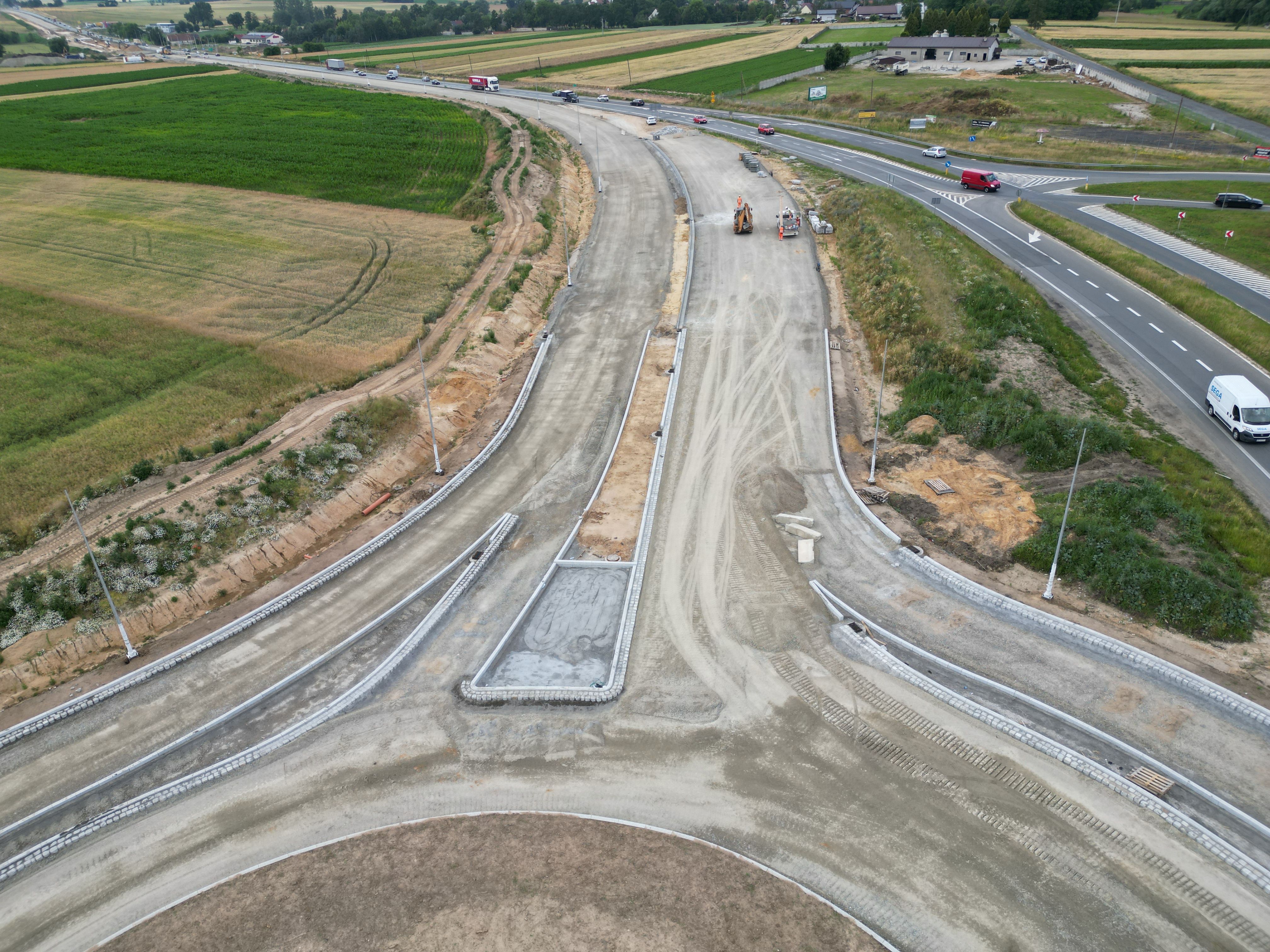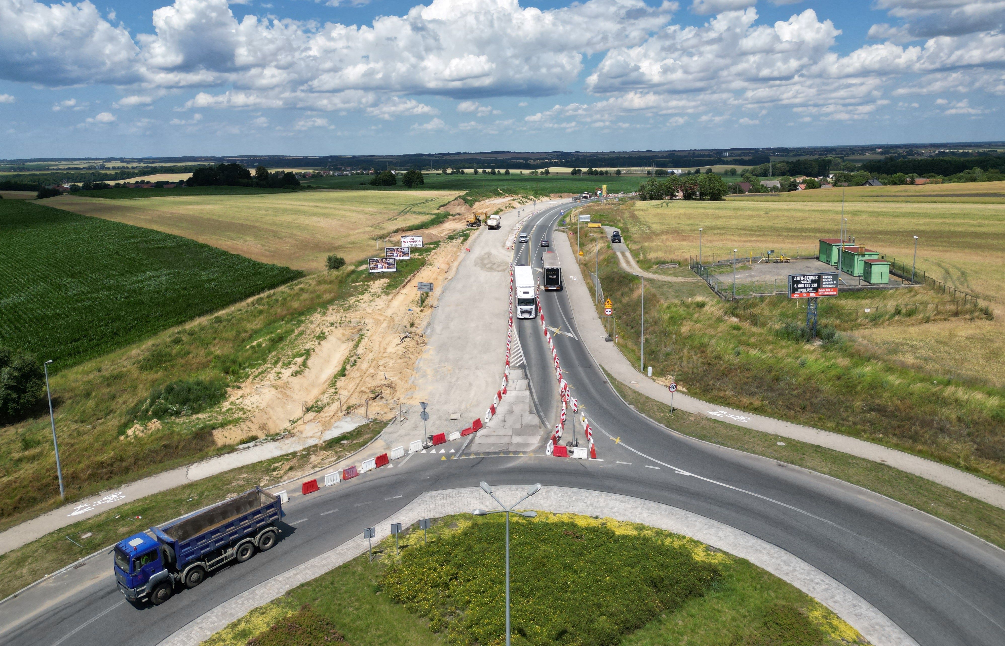Warstwa podbudowy z kruszywa jest układana także na dalszej części rozbudowywanego odcinka. W ciągu trasy głównej kontynuowane są prace związane z budową nasypów, odhumusowaniem terenu oraz przy wzmocnieniu podłoża. Niemal na całej długości prowadzone są roboty branżowe związane z przebudową kolizji w zakresie infrastruktury technicznej. Wykonawca rozpoczął montaż słupów oświetleniowych, a na wysokości Pakosławic układane są pierwsze odcinki podbudowy bitumicznej oraz warstwy wiążącej. Realizowane są także prace brukarskie w zakresie układania krawężników i ścieków.