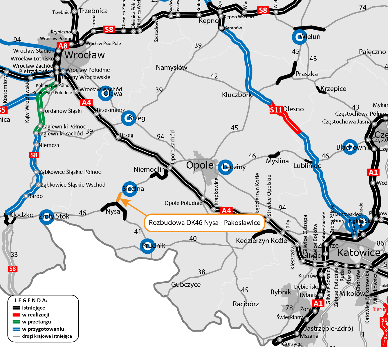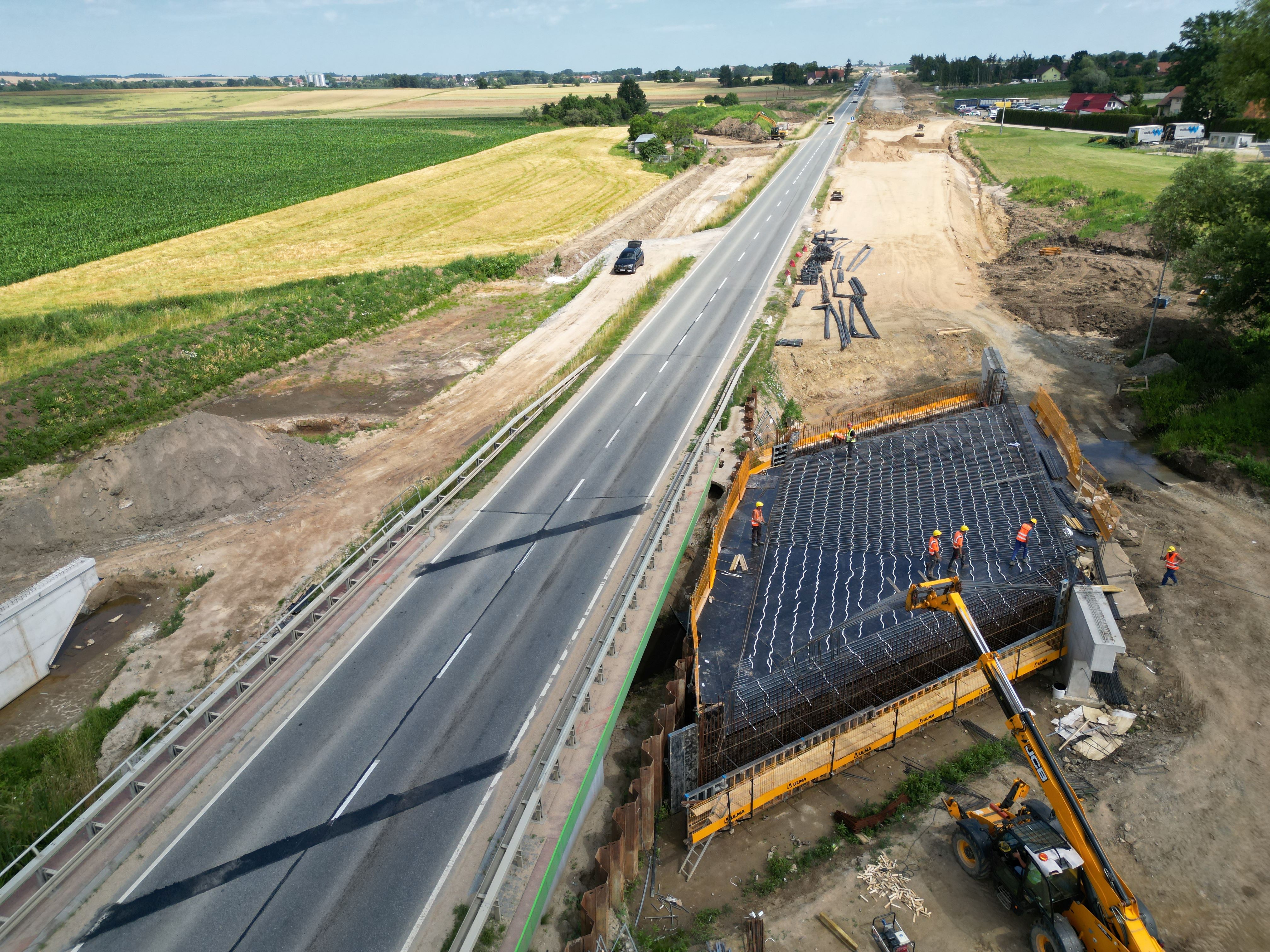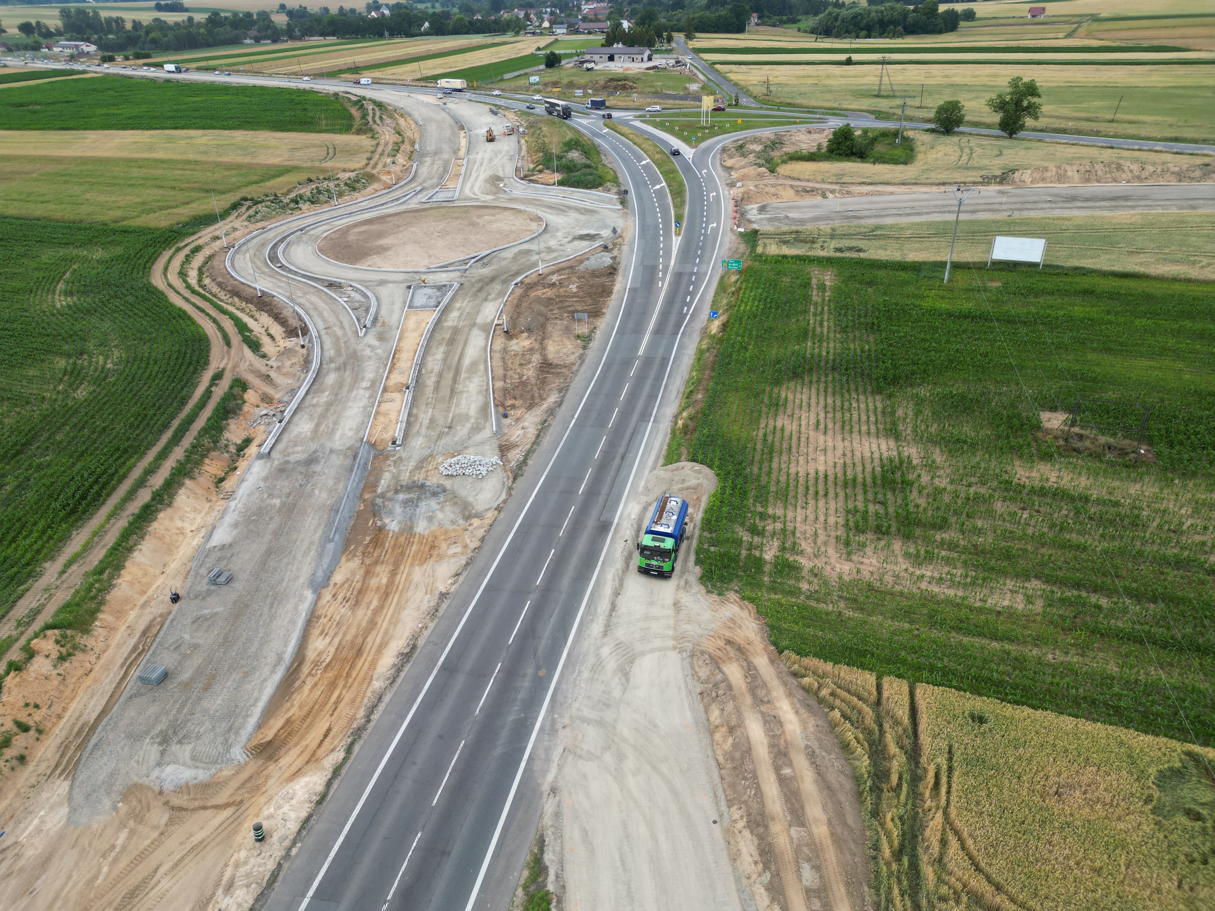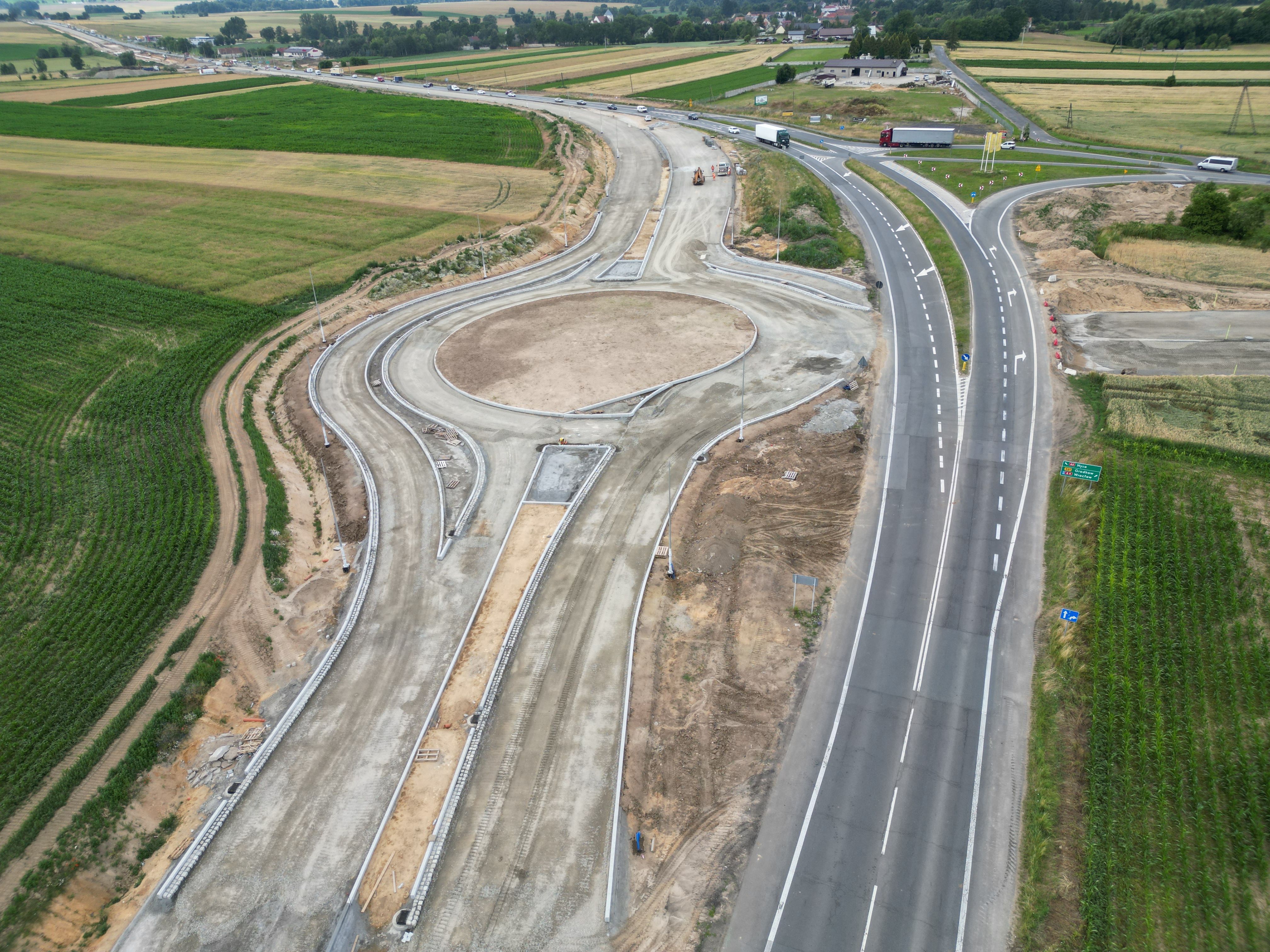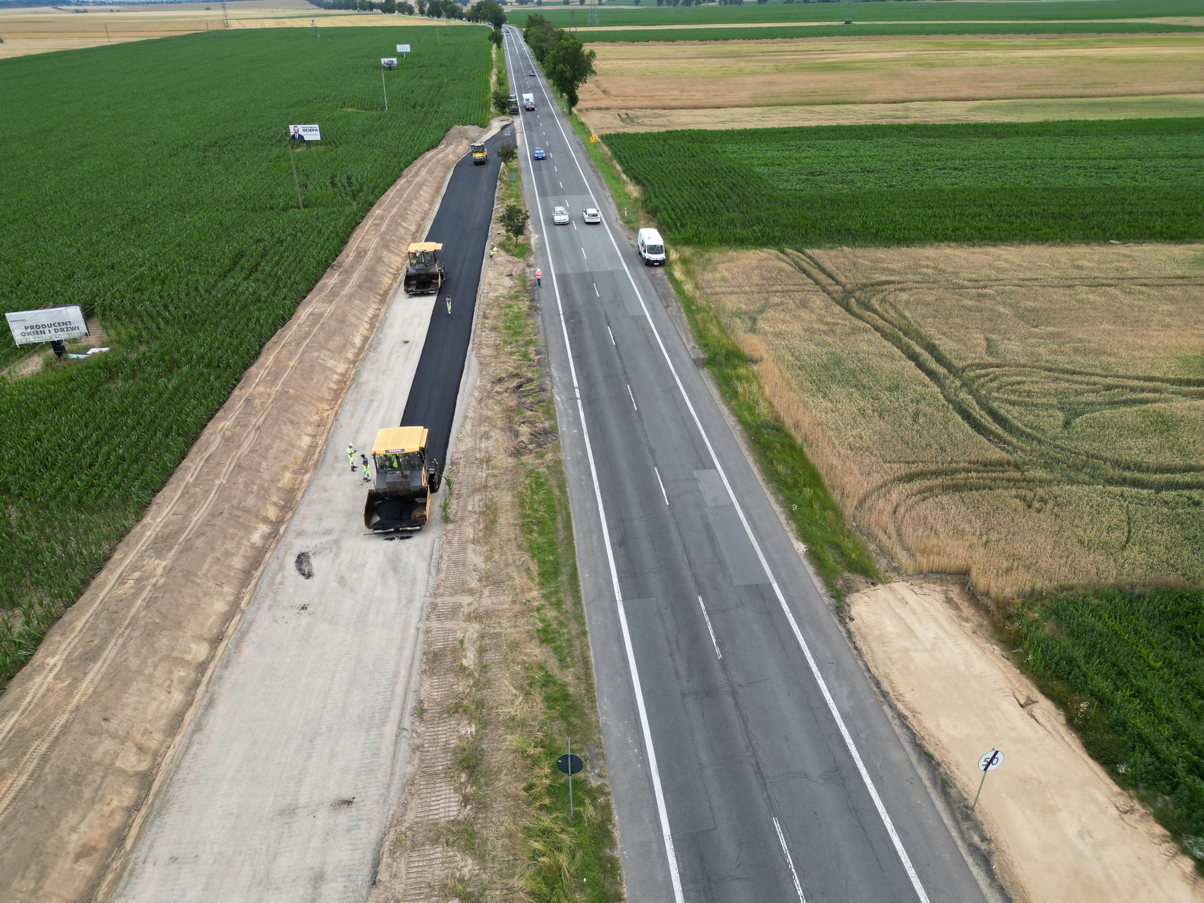 Warstwa podbudowy z kruszywa jest układana także na dalszej części rozbudowywanego odcinka. W ciągu trasy głównej kontynuowane są prace związane z budową nasypów, odhumusowaniem terenu oraz przy wzmocnieniu podłoża. Niemal na całej długości prowadzone są roboty branżowe związane z przebudową kolizji w zakresie infrastruktury technicznej. Wykonawca rozpoczął montaż słupów oświetleniowych, a na wysokości Pakosławic układane są pierwsze odcinki podbudowy bitumicznej oraz warstwy wiążącej. Realizowane są także prace brukarskie w zakresie układania krawężników i ścieków.