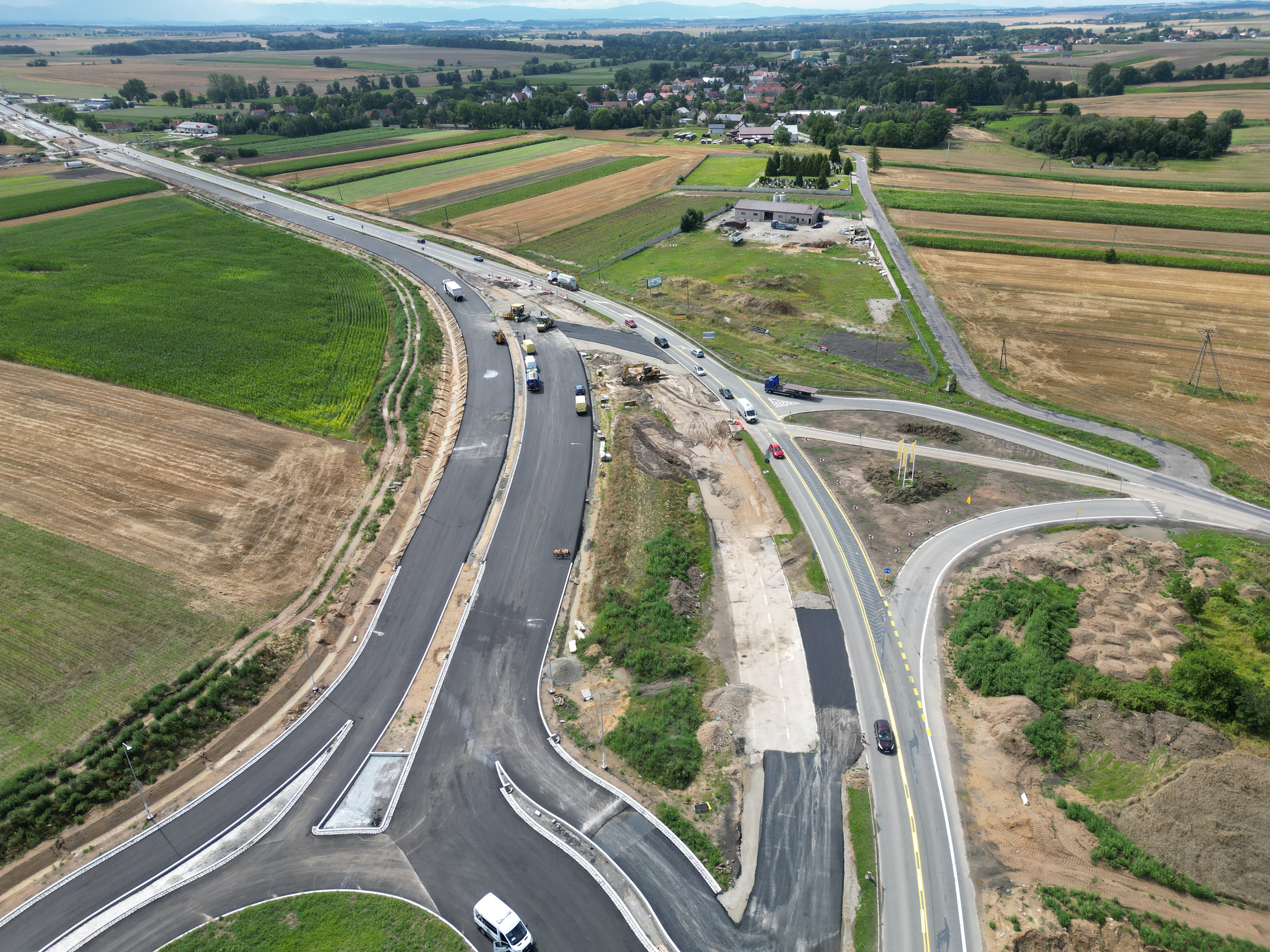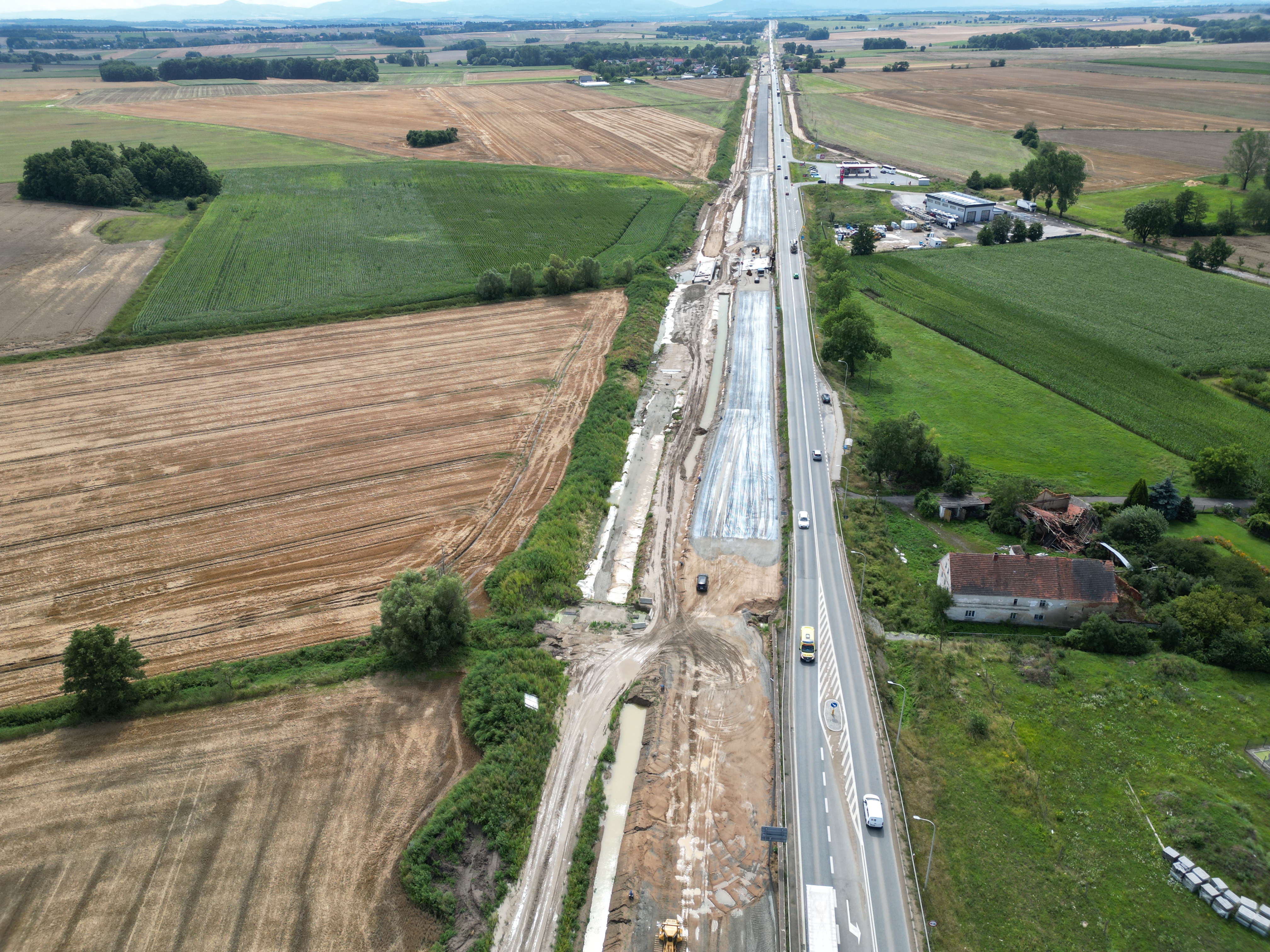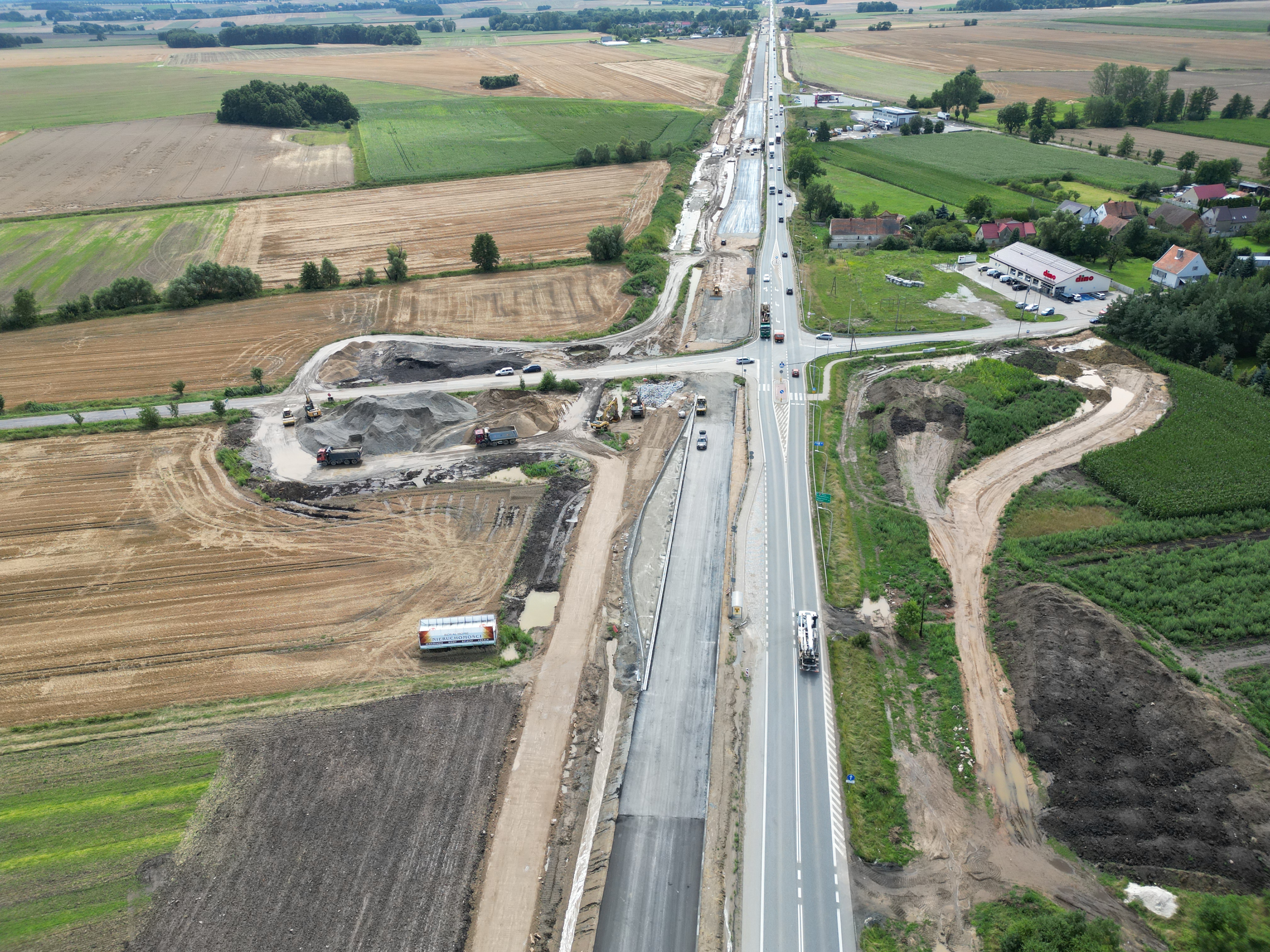 Warstwa podbudowy z kruszywa jest układana także na dalszej części rozbudowywanego odcinka. Trwa budowa nasypów w ciągu trasy głównej oraz wzmacnianie podłoża. Niemal na całej długości prowadzone są roboty branżowe związane z przebudową kolizji z infrastrukturą techniczną. Wykonawca kontynuuje montaż słupów oświetleniowych, a także budowę ekranów akustycznych.