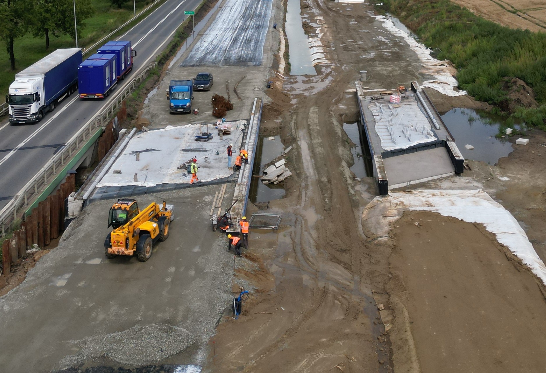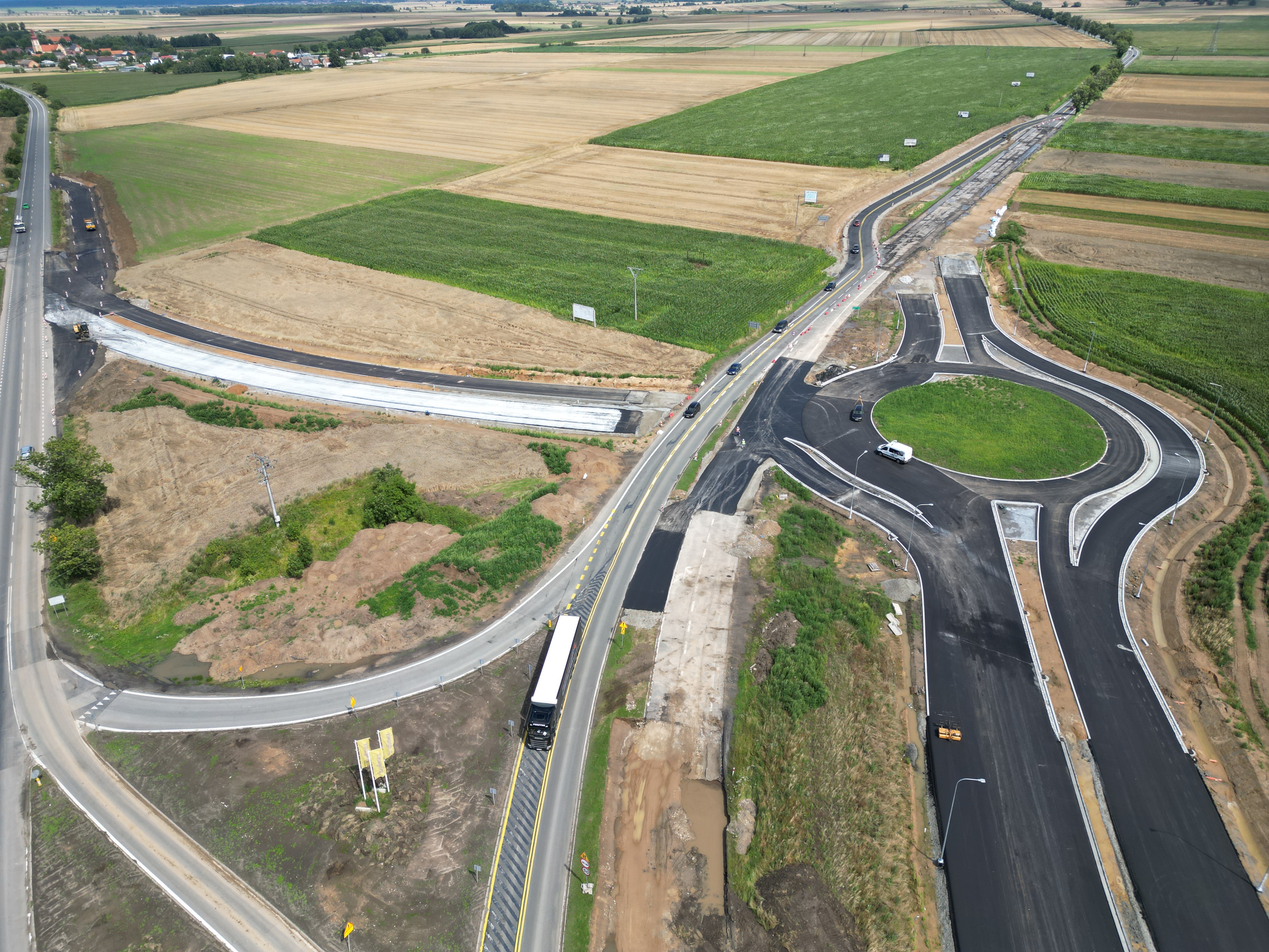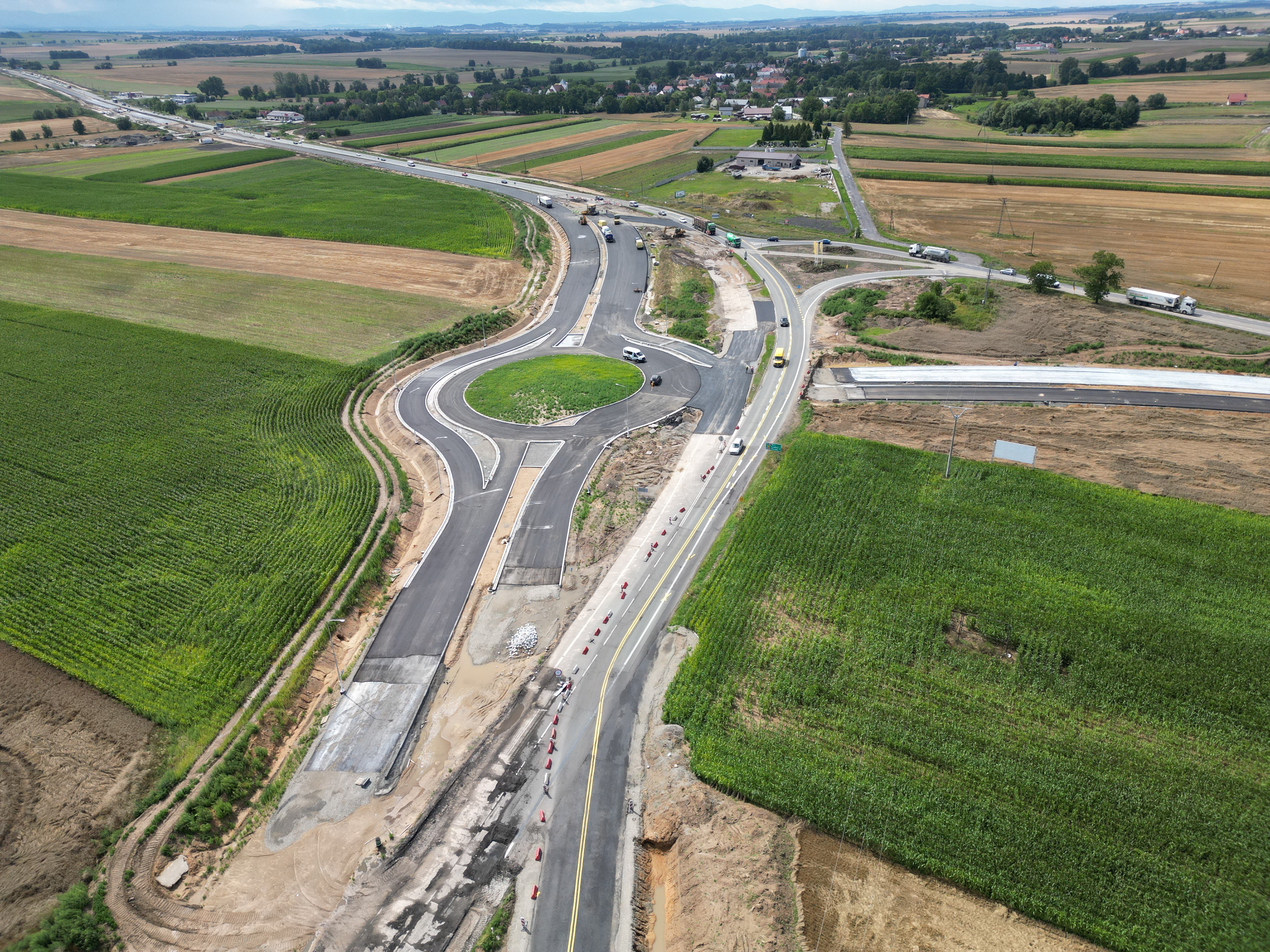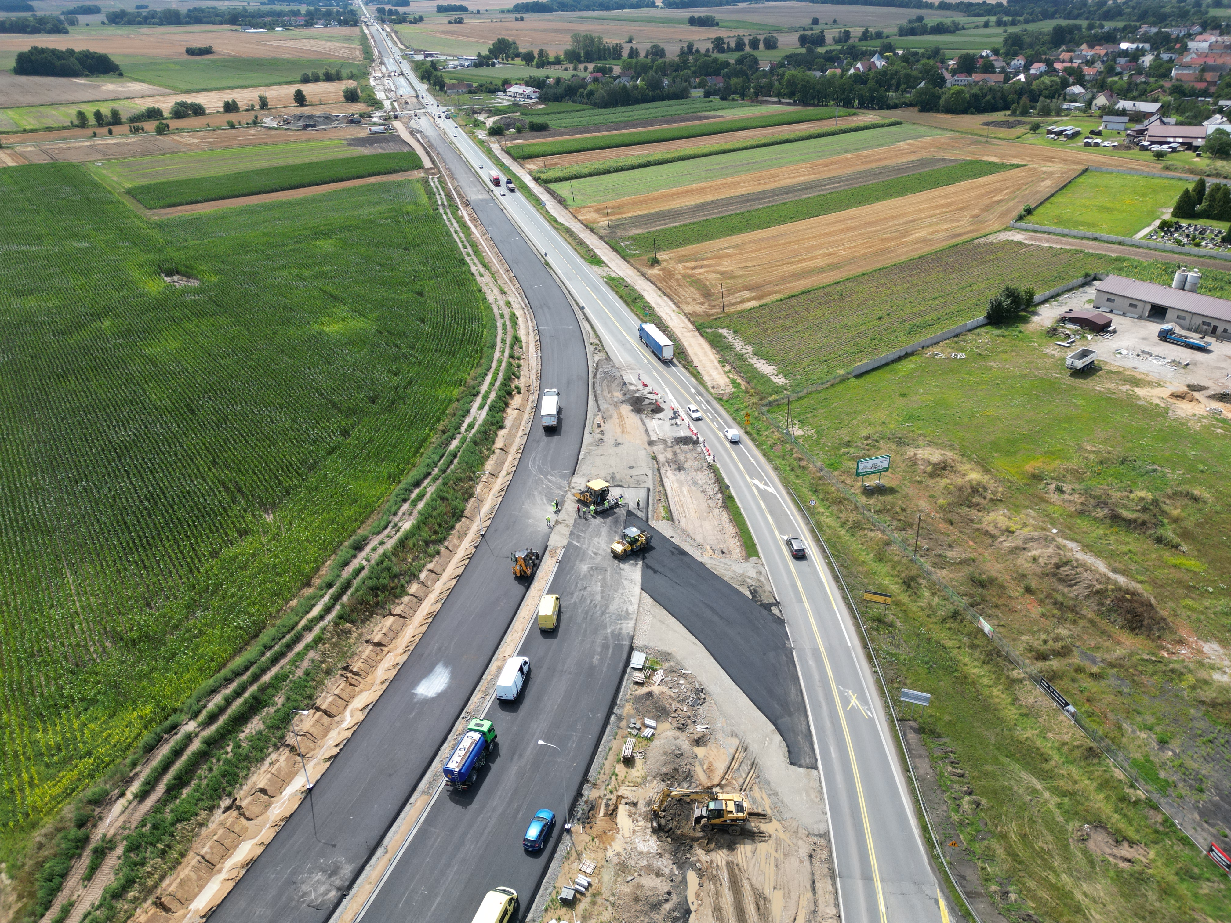 Warstwa podbudowy z kruszywa jest układana także na dalszej części rozbudowywanego odcinka. Trwa budowa nasypów w ciągu trasy głównej oraz wzmacnianie podłoża. Niemal na całej długości prowadzone są roboty branżowe związane z przebudową kolizji z infrastrukturą techniczną. Wykonawca kontynuuje montaż słupów oświetleniowych, a także budowę ekranów akustycznych.