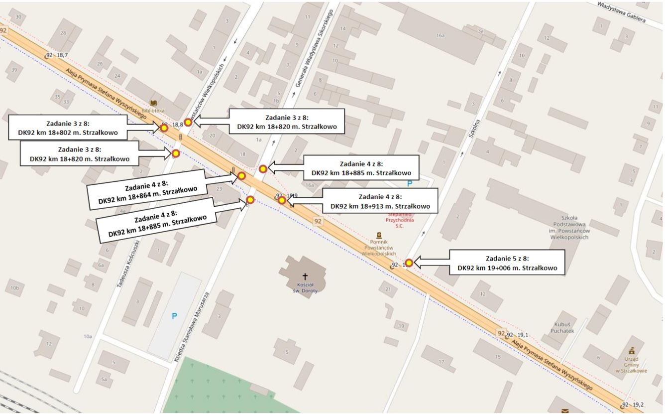 Zadanie polega na zaprojektowaniu oraz budowie osiemnastu doświetleń na wyznaczonych przejściach dla pieszych w Strzałkowie. Realizacja możliwa jest dzięki Programowi Bezpieczna Infrastruktura Drogowa.