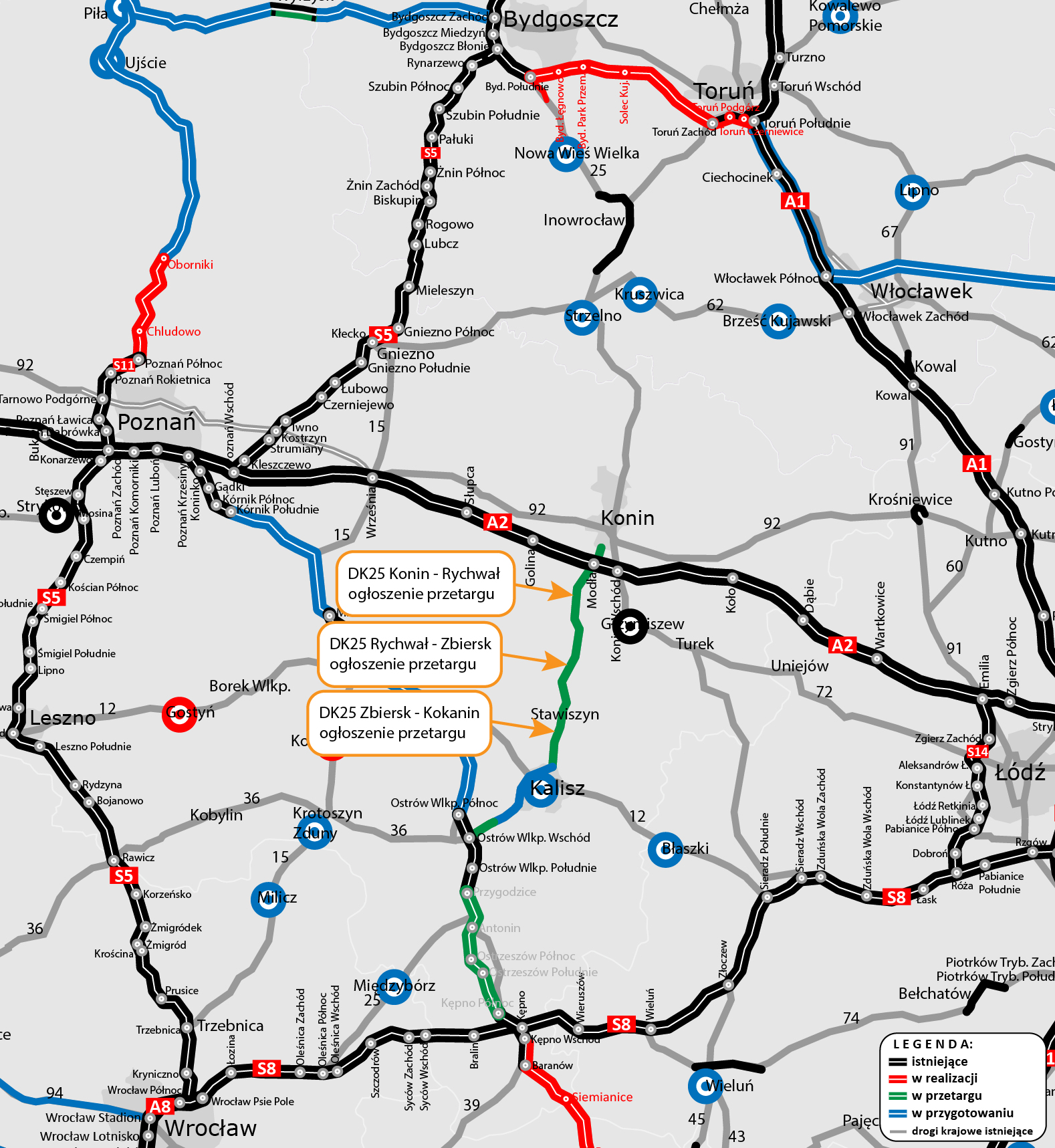 Rozpoczęte postępowania przetargowe, których szczegóły za kilka dni pojawią się na naszej platformie zakupowej, dotyczą odcinków Konin – Rychwał (12 km), Rychwał – Zbiersk (13,1 km) i Zbiersk – Kokanin (18 km).