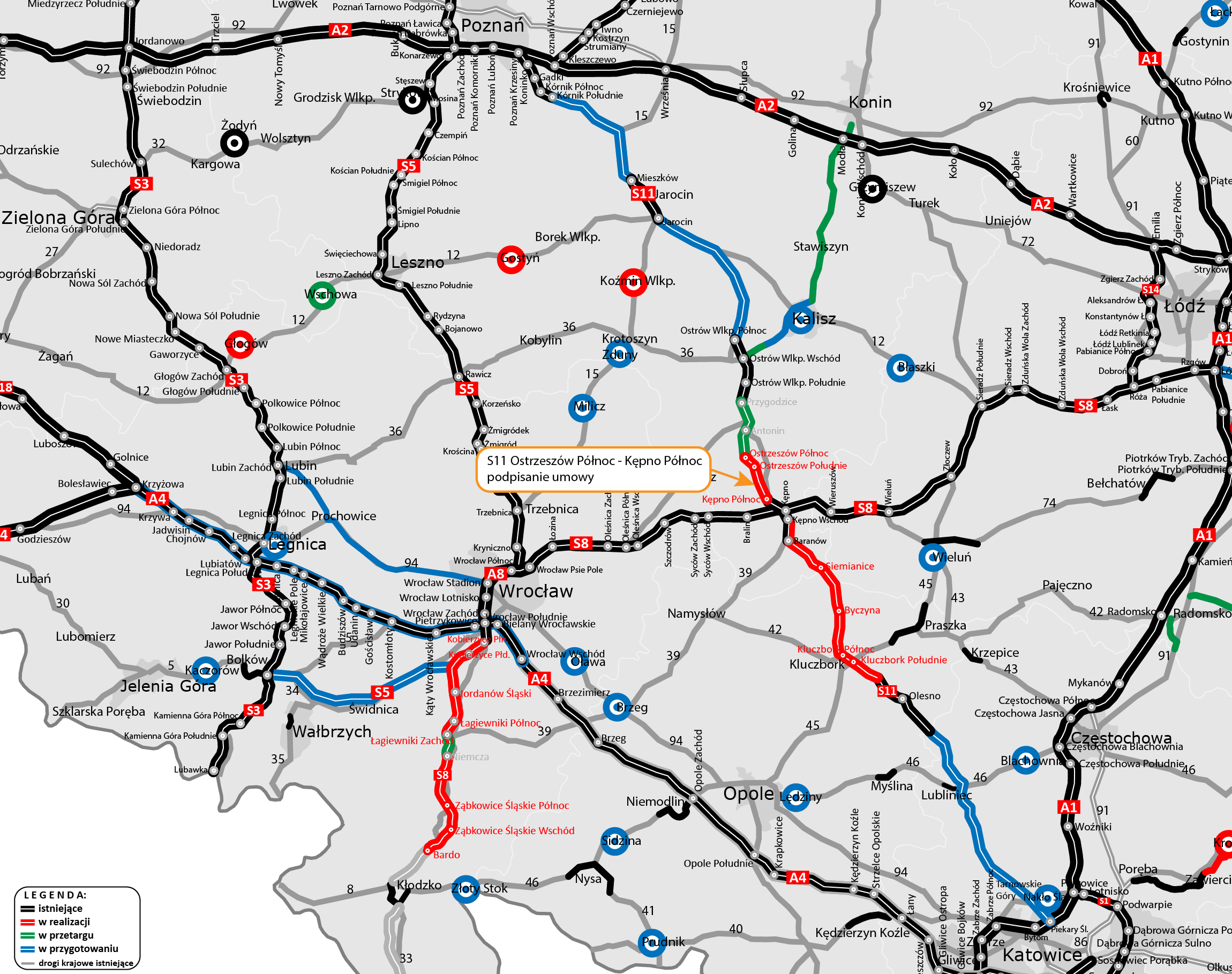 Dla ponad 12-kilometrowego odcinka S11 Przygodzice - Ostrzeszów Północ wybraliśmy ofertę złożoną przez firmę Mirbud (549 441 000 zł). Odcinek drogi ekspresowej będzie przebiegać pomiędzy istniejącą S11 stanowiącą obwodnicę Ostrowa Wielkopolskiego a drogą wojewódzką nr 444 w rejonie miejscowości Ostrzeszów, gdzie połączy się z odcinkiem Ostrzeszów - Kępno, na który właśnie podpisaliśmy umowę.
