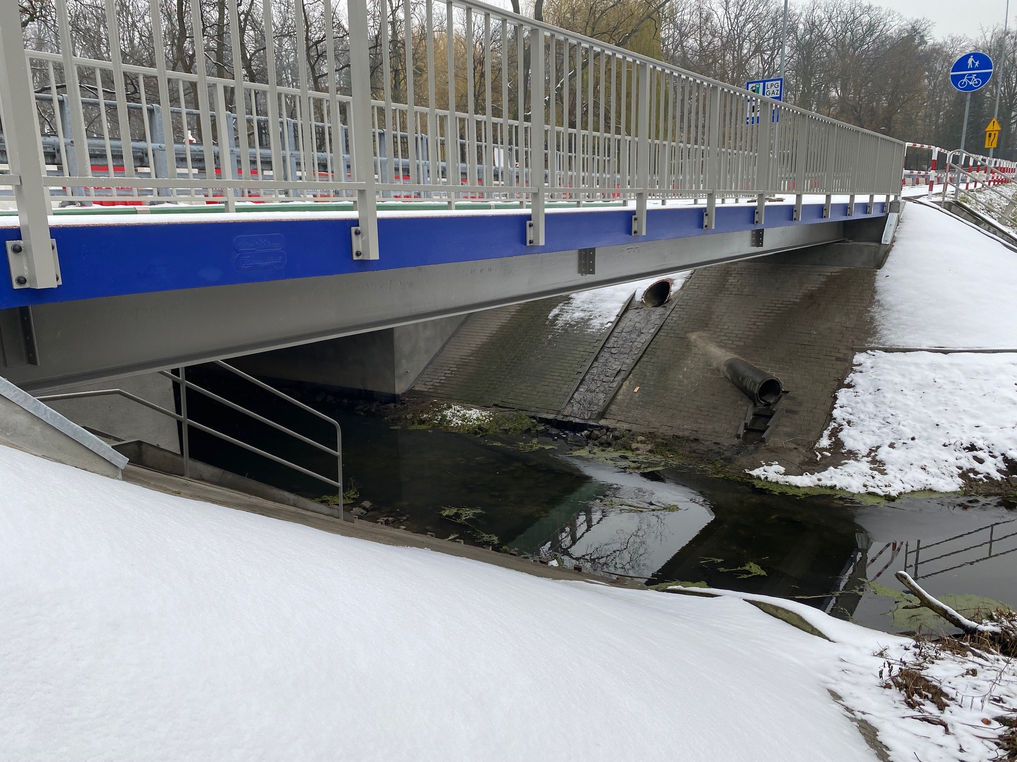 Ruch pieszy na czas trwania remontu został skierowany na sąsiadujący z kładką most, gdzie została wydzielona część dla obsługi pieszych.