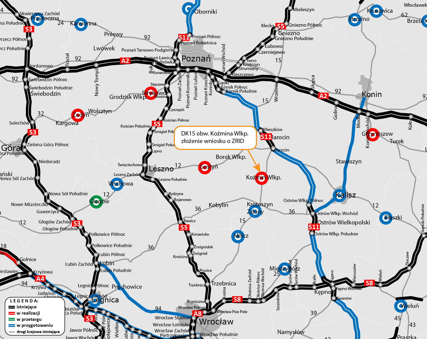 Do Wojewody Wielkopolskiego złożyliśmy wniosek o wydanie decyzji o zezwoleniu na realizację inwestycji drogowej (ZRID) dla obwodnicy Koźmina Wielkopolskiego. Inwestycja w ciągu DK15 jest piątą z ośmiu obwodnic w woj. wielkopolskim, która z dniem wydania decyzji przejdzie do fazy realizacji w ramach rządowego Programu budowy 100 obwodnic.