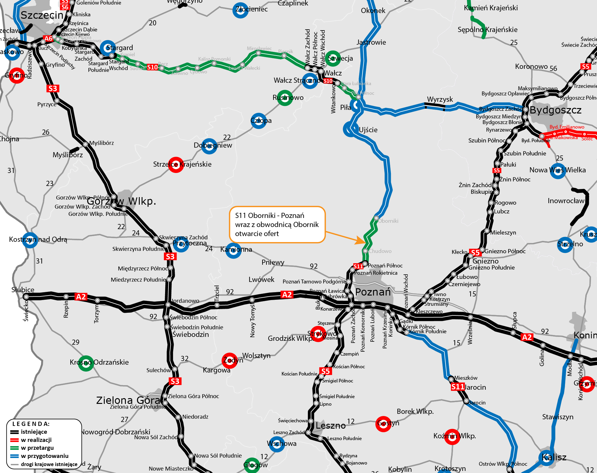 Trwają prace projektowe dla budowy trasy S11 od granicy z woj. zachodniopomorskim do granicy z woj. opolskim. Długość projektowanej S11 w woj. wielkopolskim to około 240 km, podzielonych na następujące odcinki: