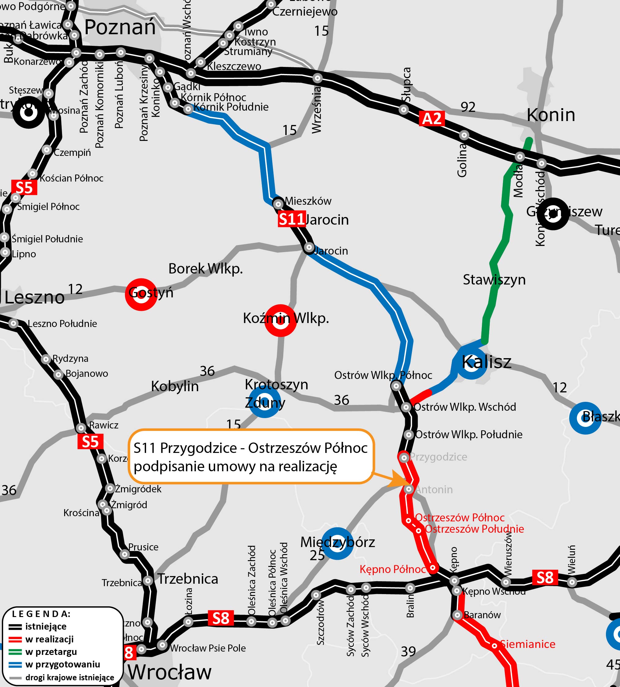 Odcinek drogi ekspresowej S11 Przygodzice – Ostrzeszów o długości 12,6 km to kluczowy fragment infrastruktury w południowej Wielkopolsce. Nowa trasa, poprzez istniejący już odcinek S11, połączy dwa istotne, lokalne ośrodki – Ostrów Wielkopolski i Ostrzeszów – umożliwiając szybki, bezpieczny i komfortowy przejazd z pominięciem zatłoczonych dróg krajowych. W ramach inwestycji powstaną dwa węzły drogowe: Przygodzice, który umożliwi wjazd na drogę samorządową (stary przebieg DK11 utarci status drogi krajowej) oraz dojazd do miejscowości Przygodzice, oraz Antonin, który zapewni sprawne połączenie z drogą krajową nr 25 w kierunku Oleśnicy i Wrocławia.