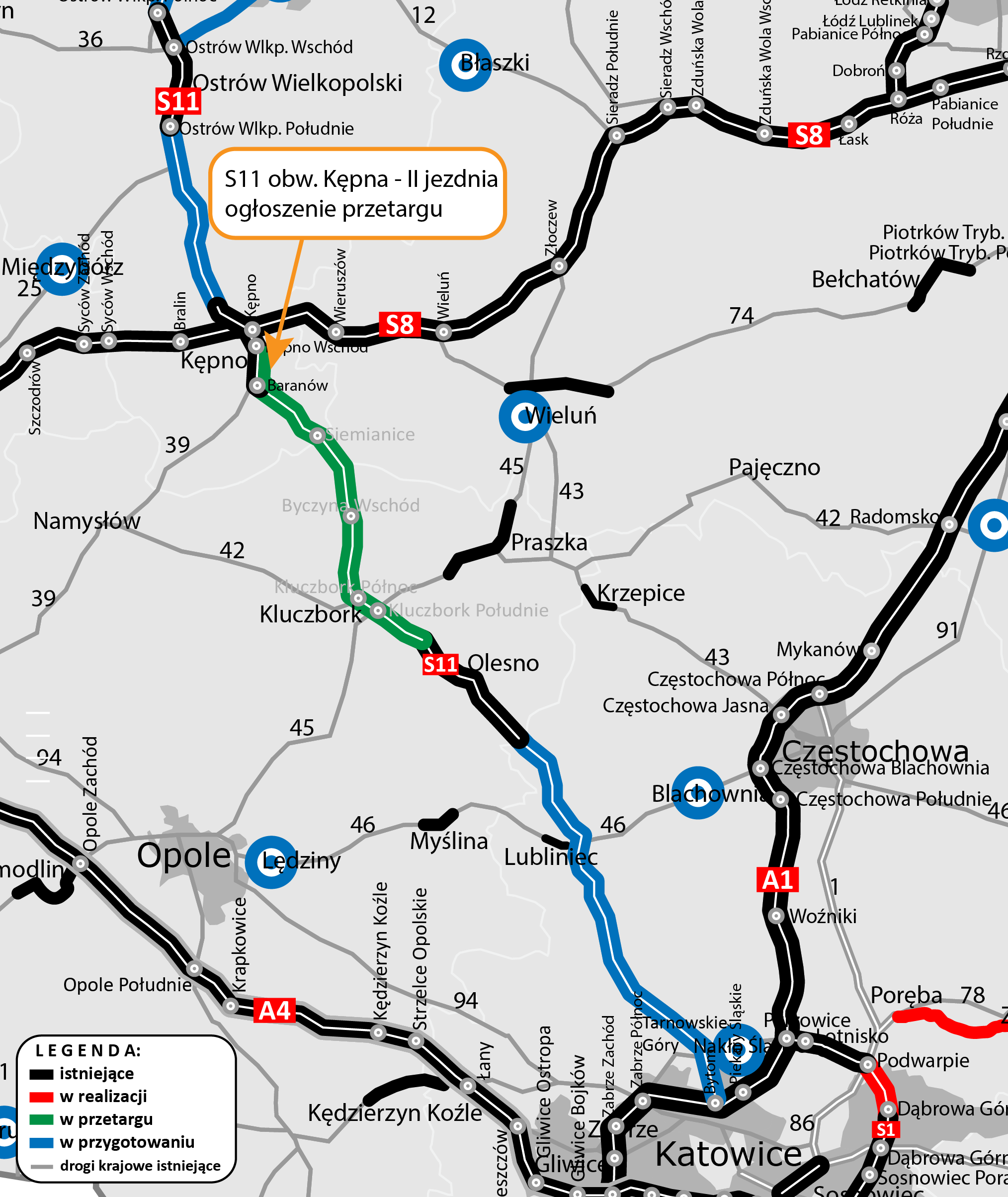 Rozpoczęty przetarg, którego szczegóły za kilka dni pojawią się na naszej platformie zakupowej, dotyczy zaprojektowania i wybudowania drugiej jezdni na odc. ok. 4 km, jadąc od strony północnej za węzłem Kępno Wschód do węzła Baranów. W ramach inwestycji wykonane zostaną również obiekty pod drugą jezdnię nad drogą powiatową nr 5704P, linią kolejową nr 272. 31 sierpnia rozpoczął się również przetarg na przedłużenie S11 od końca obwodnicy Kępna do początku obwodnicy Olesna w woj. opolskim, odcinek o długości ok 46 km.