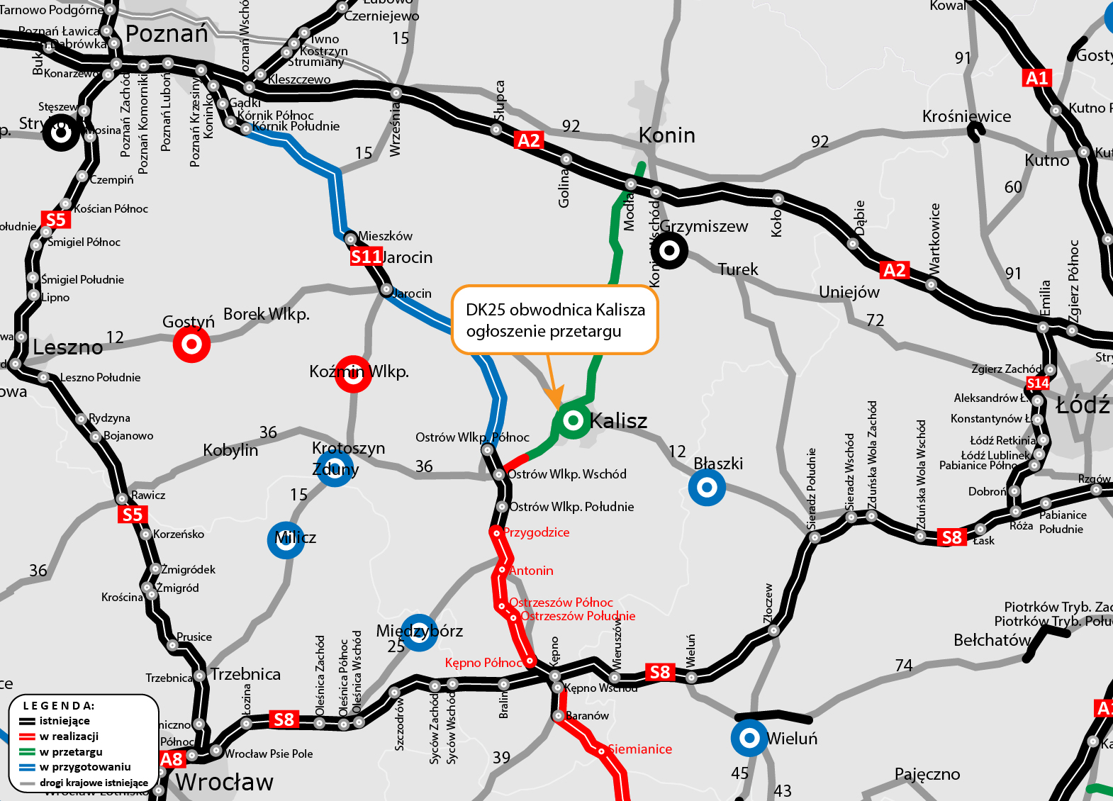Do publikacji w Dzienniku Urzędowym UE wysłaliśmy ogłoszenie o przetargu na zaprojektowanie i budowę obwodnicy Kalisza w ciągu drogi krajowej nr 25 o długości 18 km. Inwestycja realizowana będzie w latach 2026-2030 w ramach Programu budowy 100 obwodnic. Podpisanie umowy planujemy w II połowie przyszłego roku.