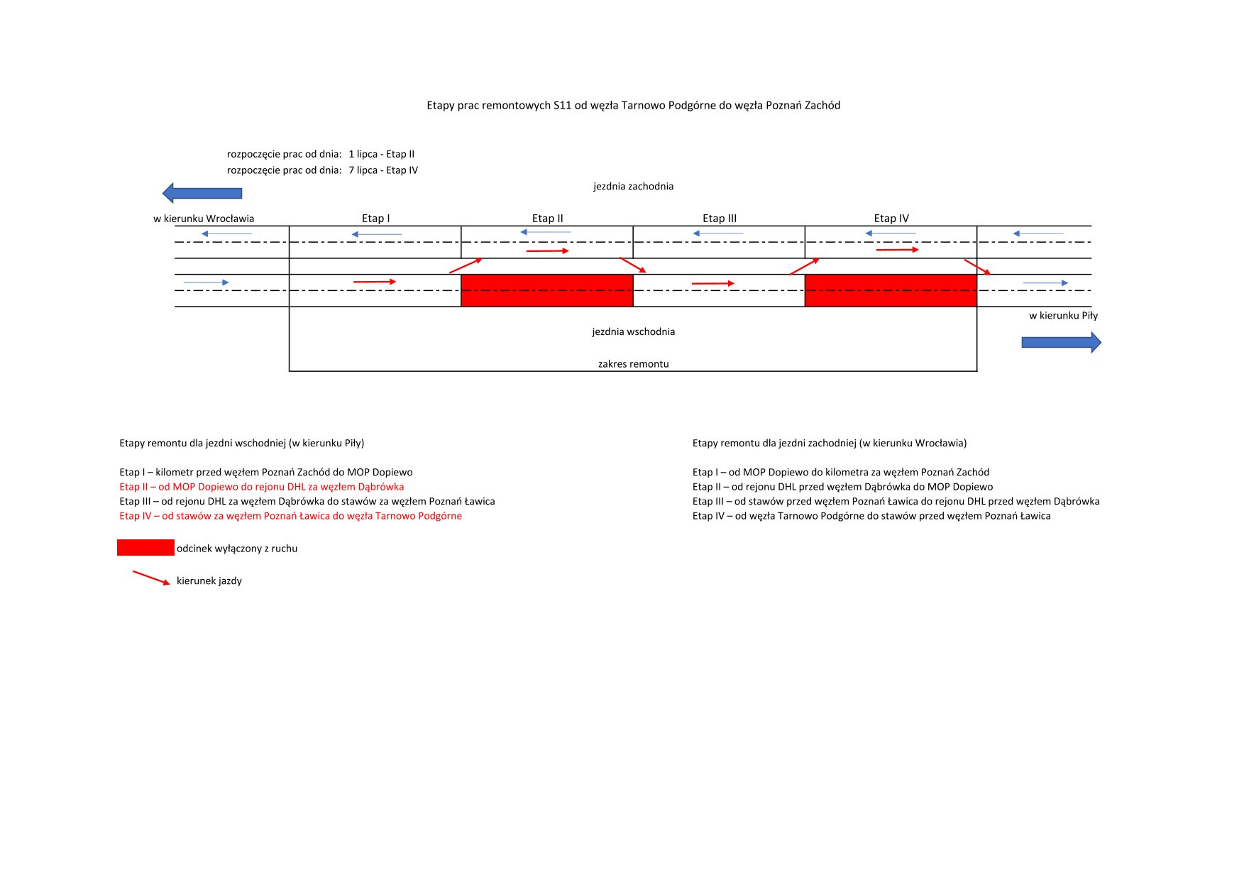 Na jezdni w kierunku Wrocławia wprowadzone zostanie zwężenie do jednego pasa ruchu w obu kierunkach na odcinku od węzła Tarnowo Podgórne do stawów przed węzłem Poznań Ławica.