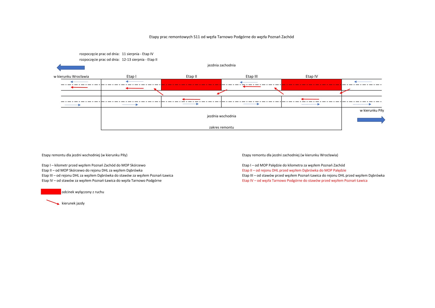 Dziś (11 sierpnia) w godzinach popołudniowo-wieczornych zamknięty zostanie kolejny odcinek tej jezdni, od węzła Tarnowo Podgórne do stawów przed węzłem Poznań Ławica. Nie będzie możliwości zjazdu z S11 od strony Piły na węźle Tarnowo Podgórne w kierunku Pniew oraz Poznania (DK92) oraz nie będzie możliwości wjazdu z DK92 od strony Pniew oraz Poznania na S11 w kierunku Wrocławia. Objazd poprowadzony zostanie przez węzeł Poznań Ławica. Dla kierowców jadących od strony Poznania w kierunku Wrocławia – objazd będzie odbywał się przez węzeł Napachanie i dalej w kierunku Wrocławia.