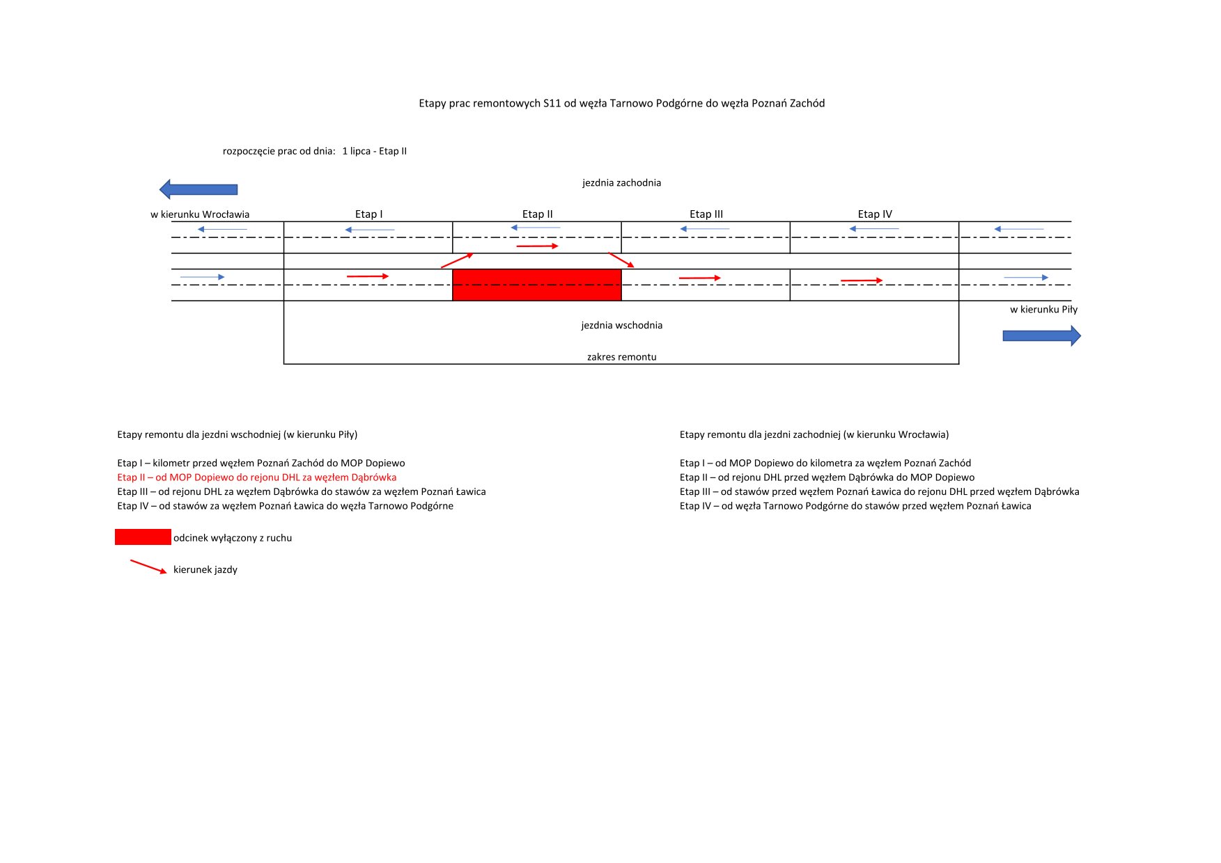 W pierwszej kolejności wyłączony z ruchu zostanie odcinek od MOP Dopiewo do rejonu DHL za węzłem Dąbrówka w kierunku Piły. Na tym etapie nie będzie możliwości zjazdu i wjazdu z węzła Dąbrówka w kierunku Piły. Jadąc w kierunku Piły, samochody będą kierowane na węzeł Ławica. MOP Dopiewo będzie dostępny dla kierowców.