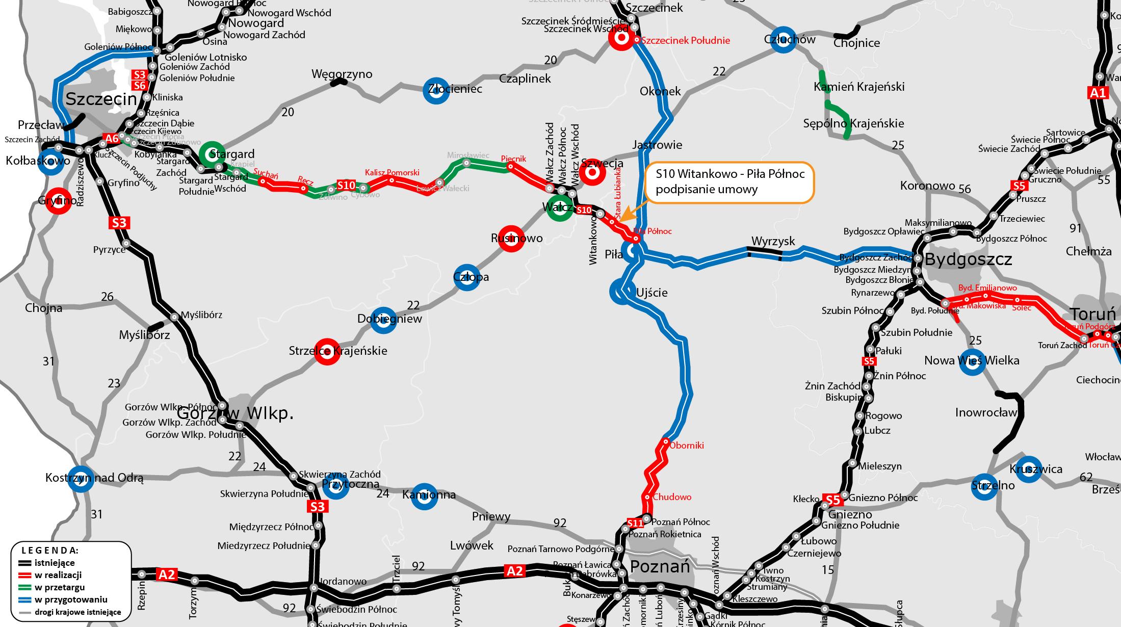 To czwarty z ośmiu odcinków drogi ekspresowej pomiędzy Szczecinem i Piłą. Wcześniej podpisaliśmy umowy na trzy odcinki tej trasy w woj. zachodniopomorskim, a teraz na pierwszy w woj. wielkopolskim. Przypomnijmy, że w ubiegłym roku ogłosiliśmy przetargi na odcinki tej trasy o łącznej długości 113 km. W przyszłości S10 stanowić będzie najszybsze połączenie drogowe Szczecina z aglomeracją warszawską.