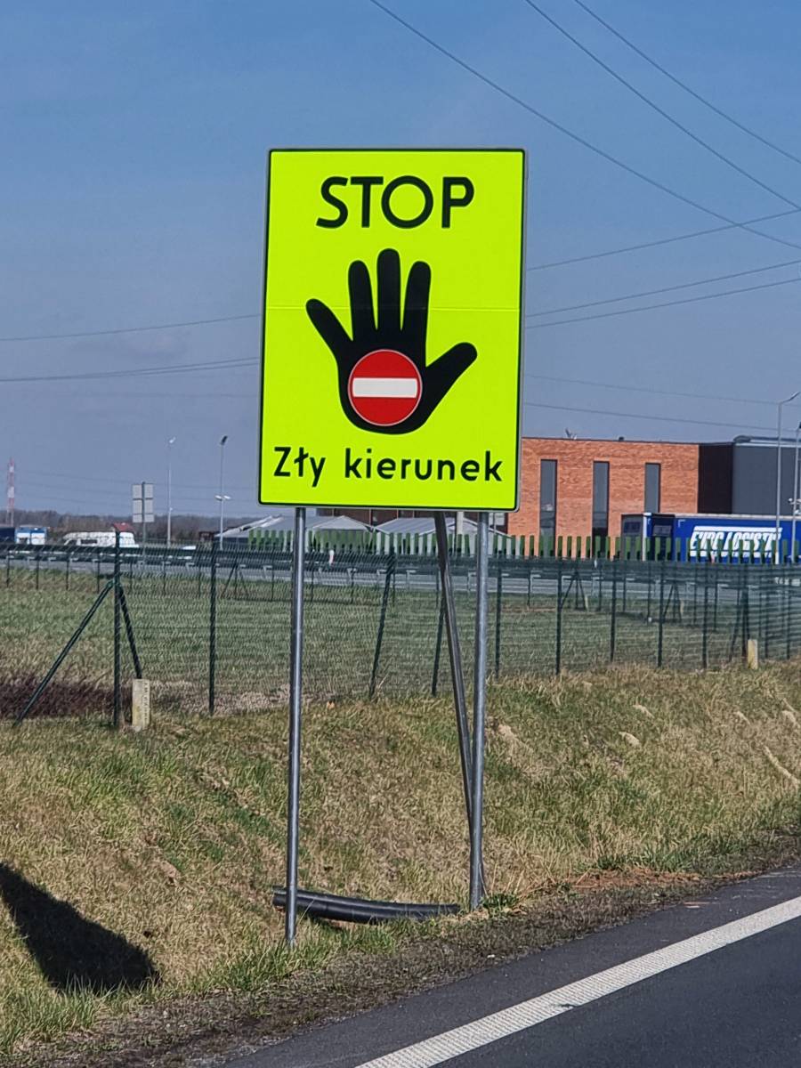 Jeżeli zobaczymy tablicę „STOP Zły kierunek” będzie oznaczało, że jedziemy pod prąd. Najprawdopodobniej mamy jeszcze czas na zmianę kierunku jazdy na prawidłowy.