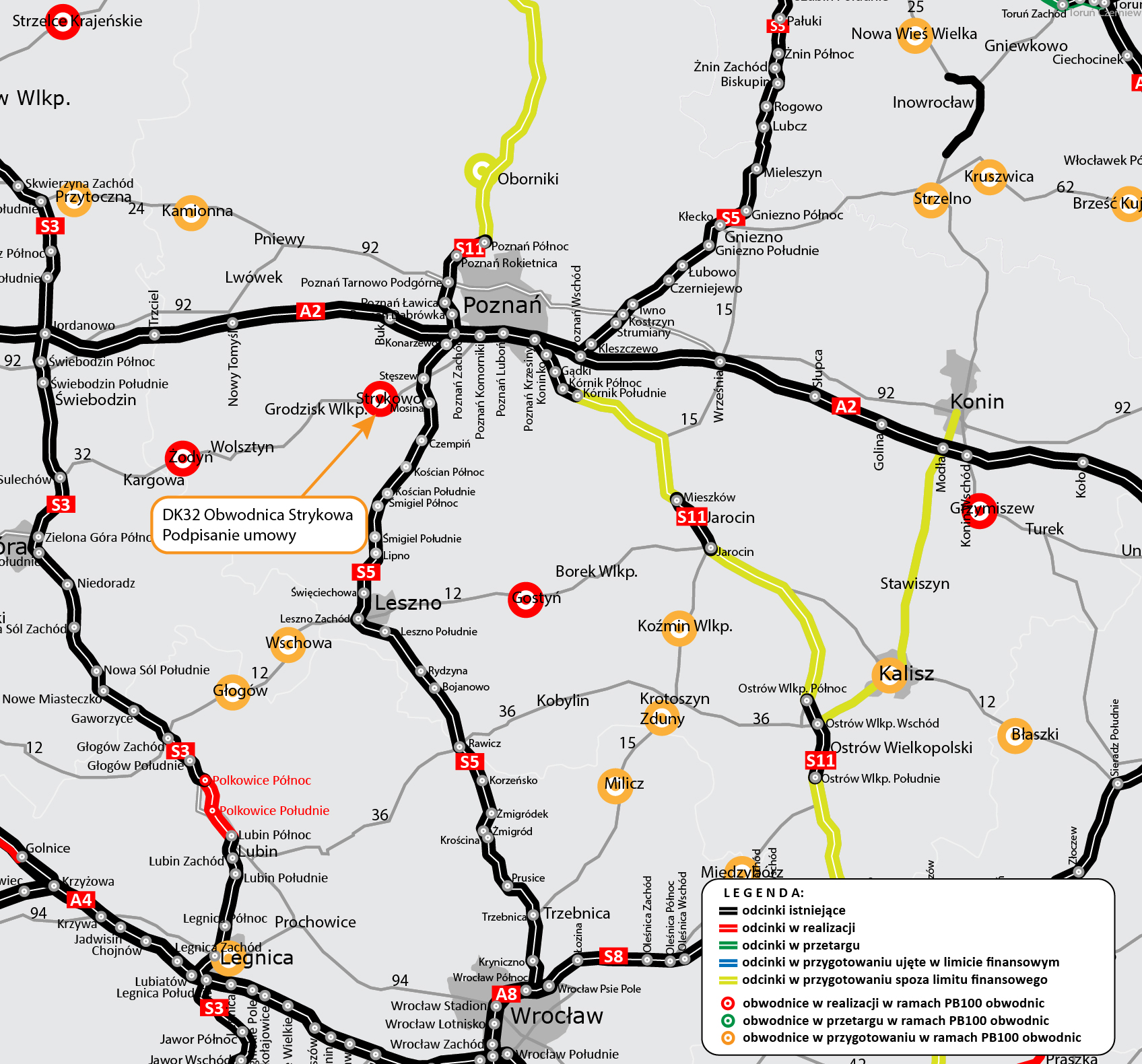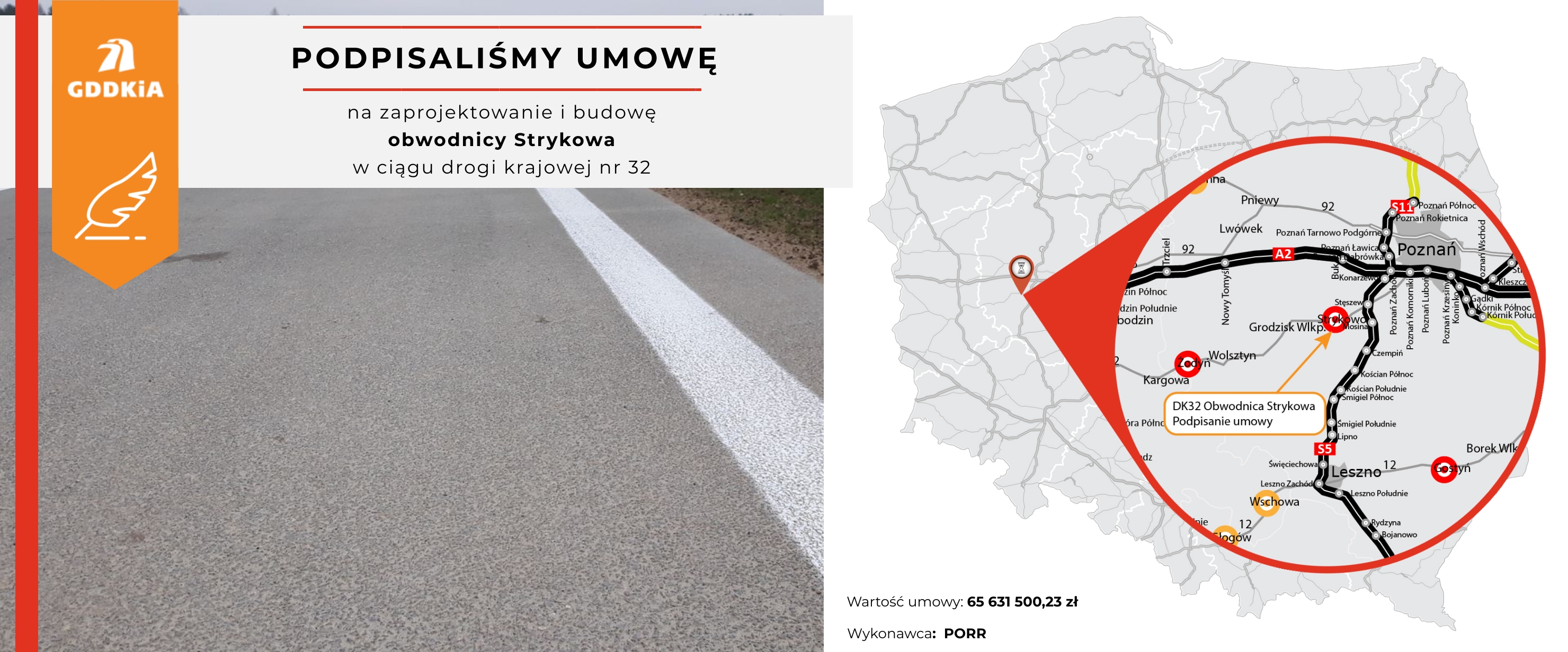 Podpisaliśmy umowę na zaprojektowanie i budowę obwodnicy Strykowa w ciągu DK32. Jest to czwarta z ośmiu obwodnic, jakie będą realizowane w Wielkopolsce w ramach rządowego Programu budowy 100 obwodnic. Inwestycję za 65 631 500,23 zł zrealizuje firma PORR.