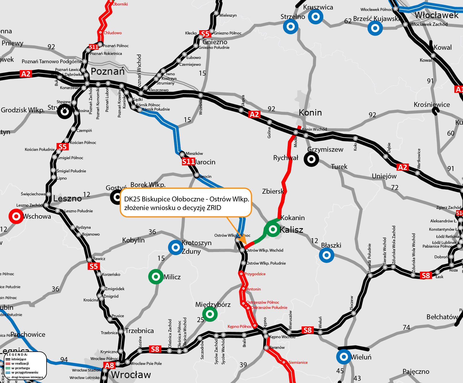 Do Wojewody Wielkopolskiej złożyliśmy wniosek o wydanie decyzji o zezwoleniu na realizację inwestycji drogowej (ZRID) dla ponad 6-kilometrowego odcinka drogi krajowej nr 25 między Biskupicami Ołobocznymi i Ostrowem Wielkopolskim. Tym samym zakończył się etap opracowania dokumentacji projektowej potrzebnej do złożenia wniosku o wydanie decyzji ZRID. Jej uzyskanie pozwoli na przekazanie wykonawcy placu budowy i rozpoczęcie robót w terenie.