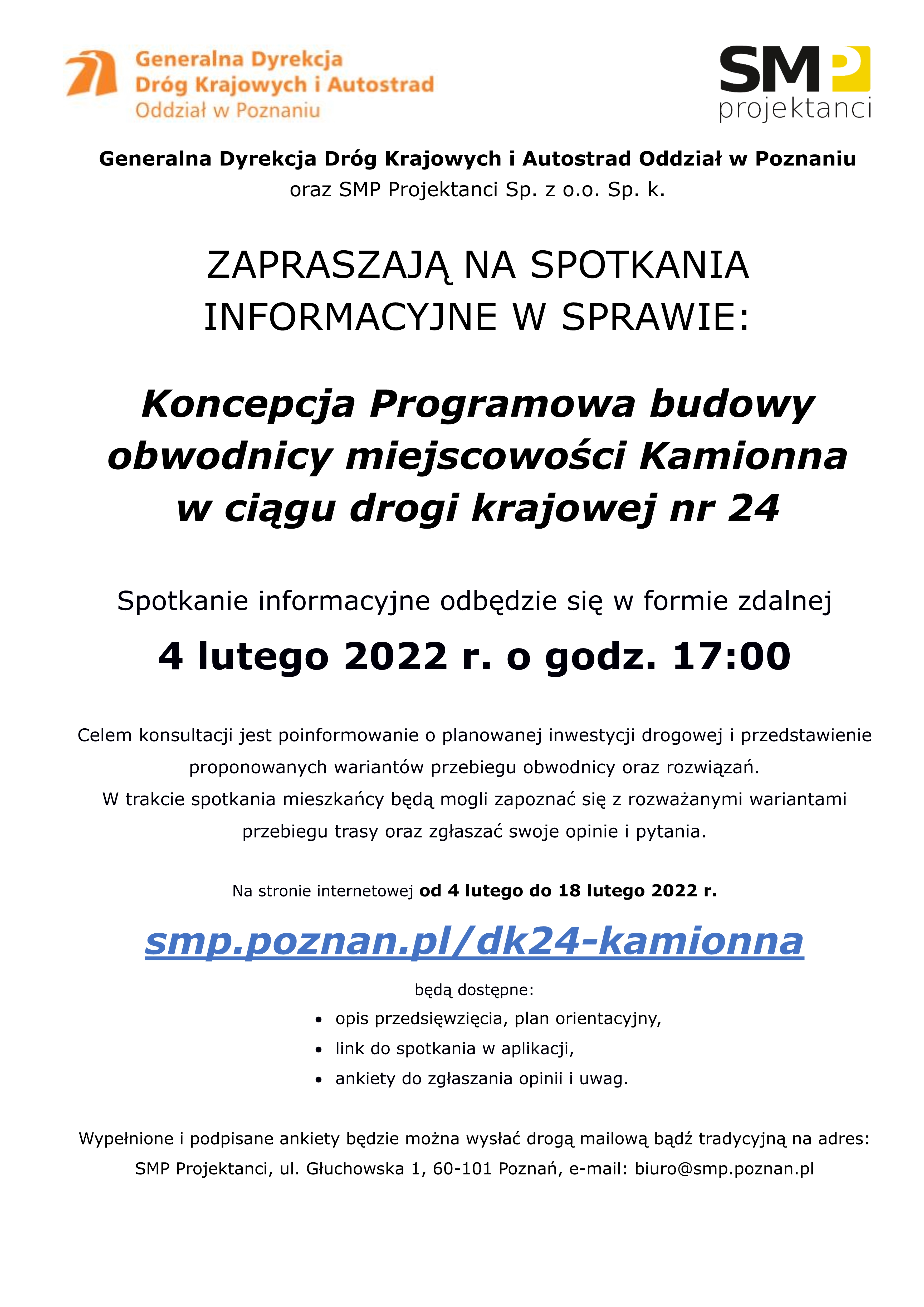 Czwartego lutego br. o godzinie 17:00 odbędzie się zdalnie spotkanie informacyjne dotyczące budowy obwodnicy Kamionnej w ciągu drogi krajowej numer 24. Z uwagi na aktualną sytuację pandemiczną w kraju, podjęto decyzję o organizacji spotkań w formule on-line przy użyciu ogólnodostępnego oprogramowania.