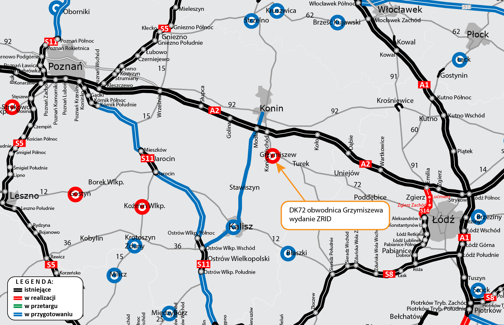 Wojewoda Wielkopolski wydał decyzję o zezwoleniu na realizację inwestycji drogowej (ZRID) dla obwodnicy Grzymiszewa w ciągu DK72. Tym samym dobiegł końca etap projektowania drogi i wykonawca może przystąpić do robót budowlanych. To oznacza również uruchomienie procesu wypłaty odszkodowań za przejęte pod budowę drogi nieruchomości.