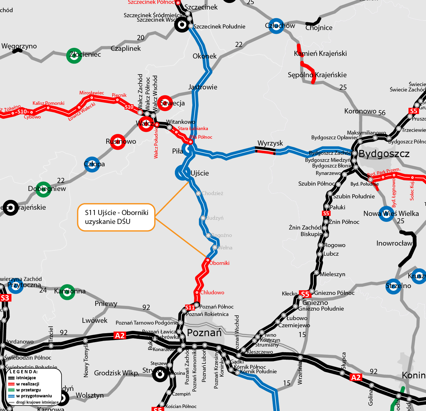 Regionalny Dyrektor Ochrony Środowiska w Poznaniu wydał decyzję środowiskową (DŚU) dla drogi ekspresowej S11 Ujście - Oborniki. Wskazany w niej został wariant nr 2 przebiegu trasy o długości 43,1 km.