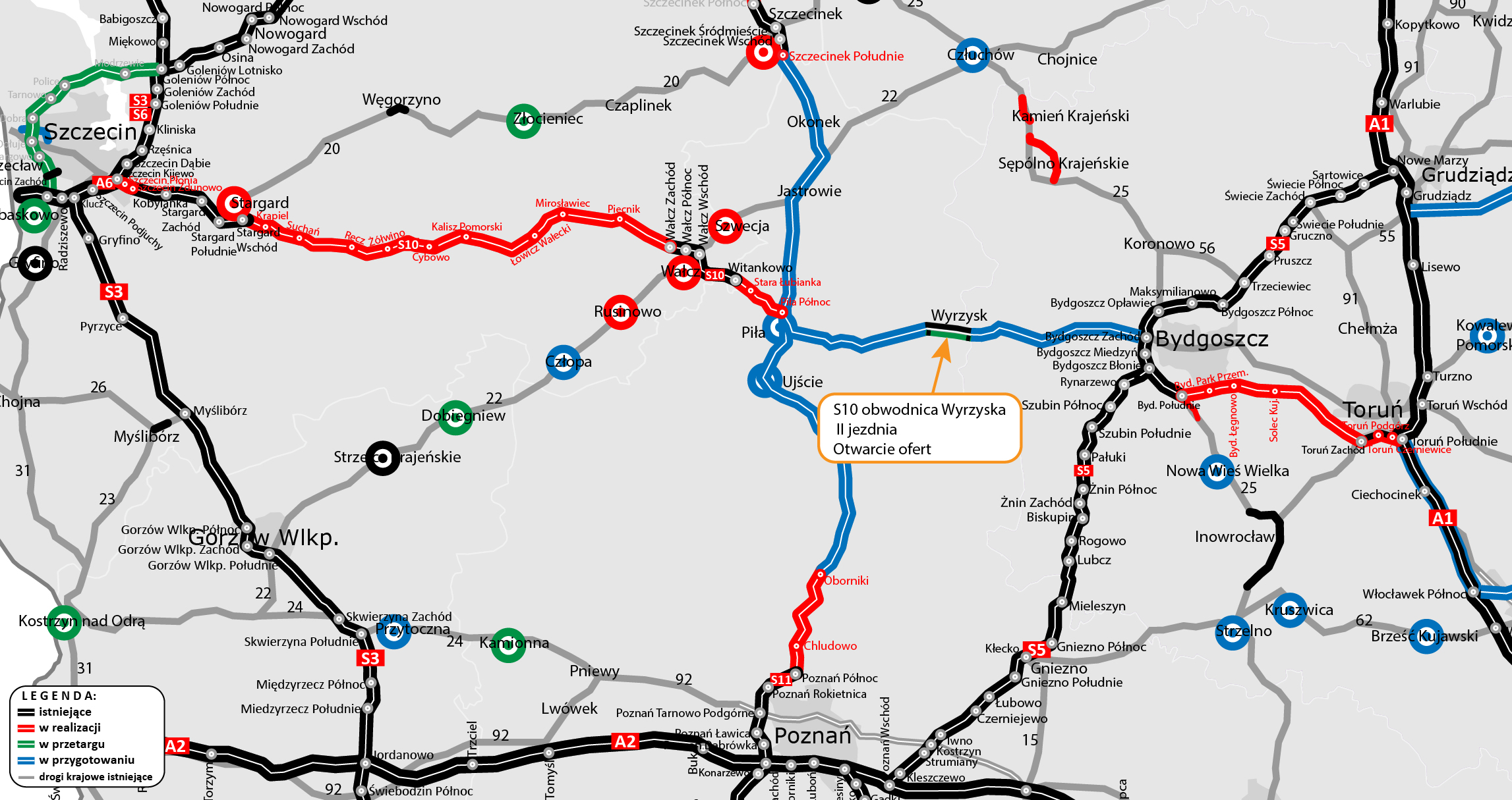 Jednojezdniowa obwodnica Wyrzyska w ciągu S10, oddana do ruchu w 2010 roku, stanie się dwujezdniową ekspresówką. Podpisanie umowy planujemy na II kwartał 2025 r. Wykonawca zrealizuje zadanie w formule Projektuj i buduj. W ciągu pierwszych 10 miesięcy zostanie opracowany projekt budowlany i złożony wniosek o wydanie decyzji o zezwoleniu na realizację inwestycji drogowej (ZRID). Zakładamy, że jej procedowanie zajmie siedem miesięcy, a na prace w terenie przypadną kolejne 22 miesiące. Z czasu realizacji robót wyłączone będą okresy zimowe od 16 grudnia do 15 marca.
