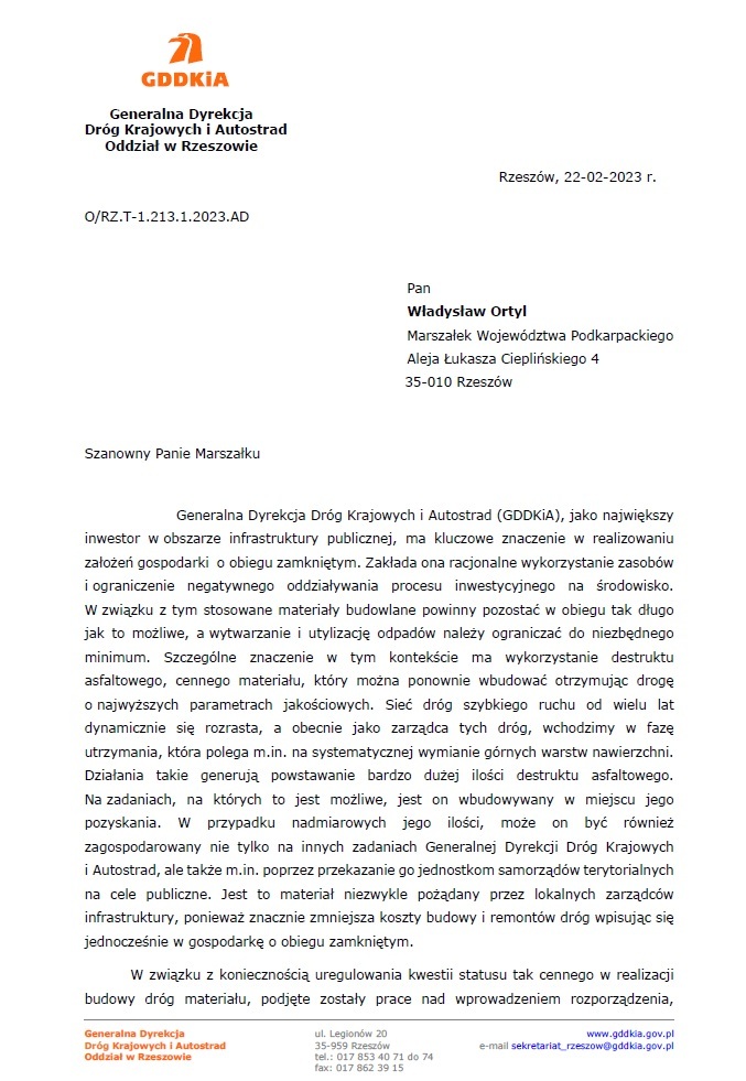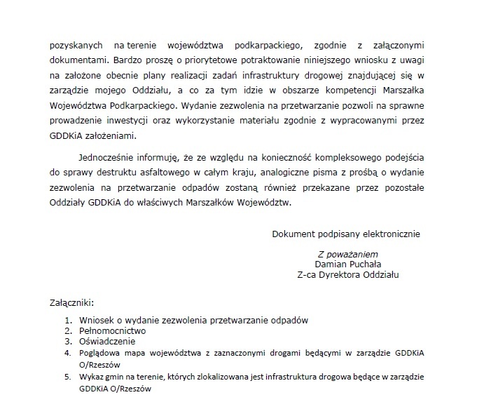 Na początku bieżącego roku Oddziały GDDKiA zwróciły się do marszałków poszczególnych województw z wnioskami o wydanie zezwoleń na przetwarzanie odpadów destruktu asfaltowego. Dzięki temu w przypadku, gdy zgodnie z zapisami kontraktowymi GDDKiA będzie posiadaczem odpadu destruktu asfaltowego w myśl ustawy z dnia 14 grudnia 2012 r. o odpadach, będziemy mieli możliwość przeprowadzenia procedury utraty statusu odpadu dla odpadu destruktu asfaltowego pozyskanego podczas budów, przebudów oraz remontów dróg.