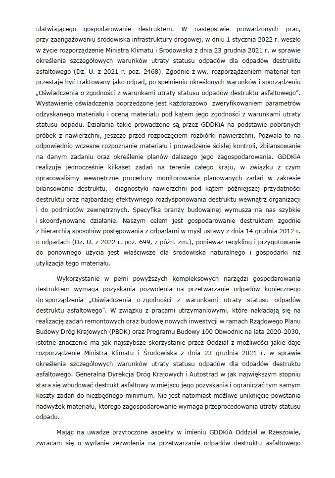 Jednak taka procedura jest długotrwała. Dlatego niezależnie od bieżących działań, GDDKiA angażuje się w opracowanie rozwiązań mających na celu wprowadzenie kolejnych ułatwień w ponownym wykorzystaniu destruktu asfaltowego. Do MKiŚ skierowaliśmy pismo, w którym nakreśliliśmy trudności z wykorzystaniem destruktu w świetle obowiązującego rozporządzenia. Efektem tego było wskazanie przez MKiŚ możliwości uregulowania zwolnienia posiadacza odpadu destruktu prowadzącego odzysk z obowiązku uzyskania zezwolenia na przetwarzanie odpadów poprzez wydanie rozporządzenia na podstawie ustawy o odpadach.