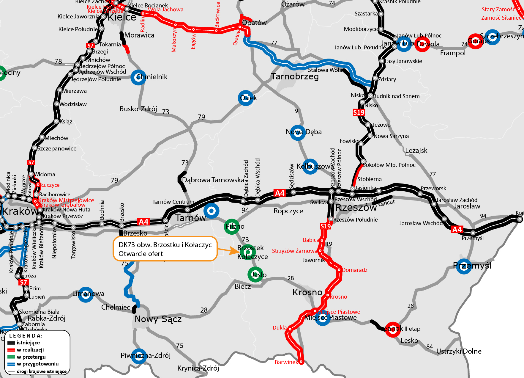 Obwodnice Brzostku i Kołaczyc, a także Jasła i Pilzna to nowe zadania, które zmienią przebieg i wygląd DK73. Wraz z przygotowywaną przebudową istniejącego odcinka DK73 pomiędzy Pilznem a Brzostkiem, inwestycje te spowodują, że kierowcy zyskają finalnie ok. 35 km wygodnej i bezpiecznej trasy, w dwóch trzecich poprowadzonej nowym śladem. Pozwoli to nie tylko wyprowadzić ruch, jaki koncentruje się w tych miastach, ale przede wszystkim poprawić przepustowość i bezpieczeństwo na całym ciągu DK73.
