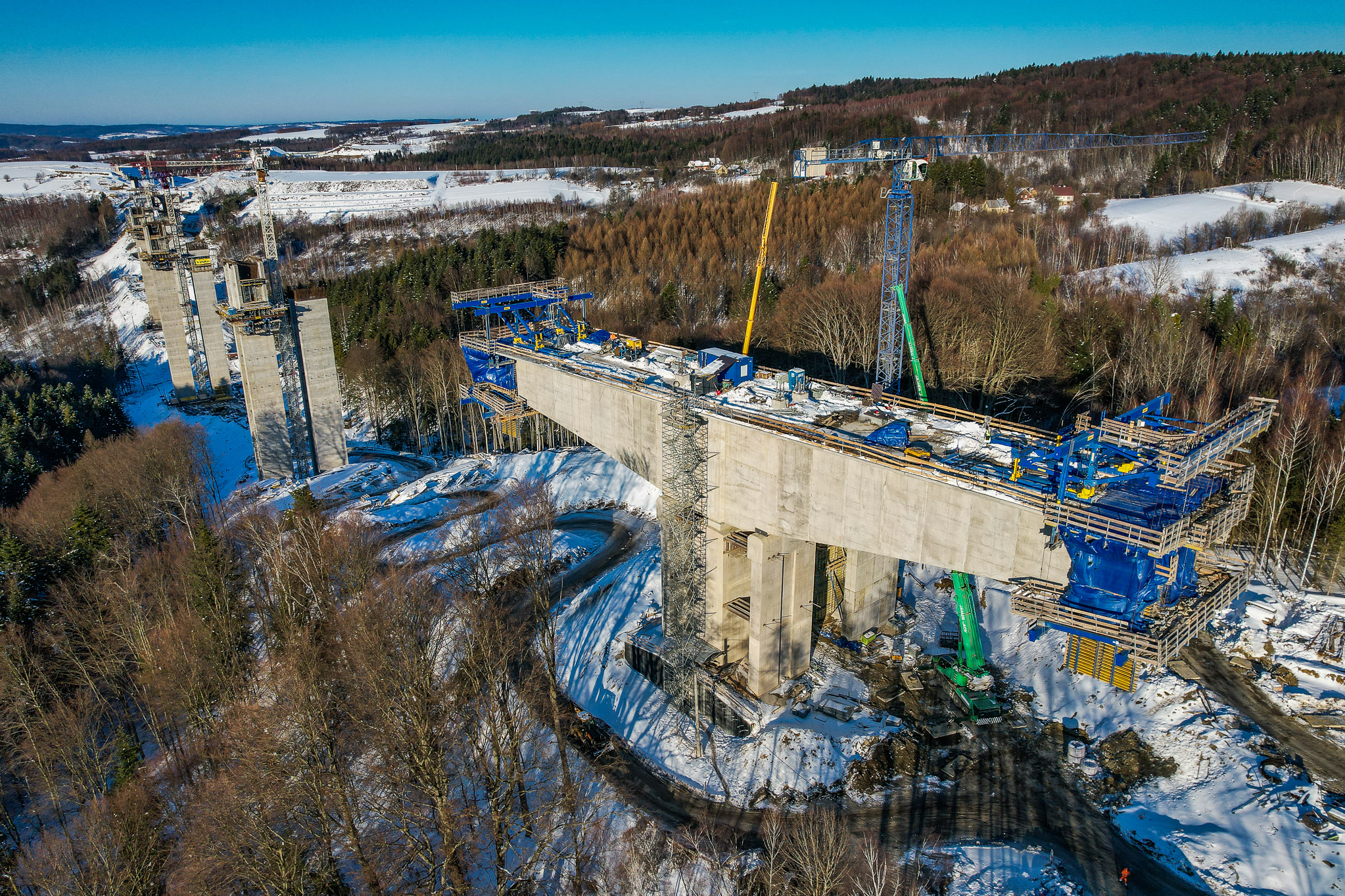 Na sąsiednim odcinku, Babica – Jawornik, warunki pogodowe pozwalają wykonywać roboty drogowe w ograniczonym zakresie, natomiast ekipy mostowe sukcesywnie realizują kolejne etapy robót na obiektach. Zaawansowanie prac mostowych szacowane jest na poziomie ok. 76 proc. W najbardziej imponującym miejscu na budowie, najwyższej powstającej w Polsce estakadzie ES-26, roboty koncentrują się na wykonywaniu zbrojenia, na deskowaniu oraz betonowaniu podpór tej imponującej konstrukcji. Najbardziej zaawansowane są podpory przy przyczółku południowym. Podpory zachodnie są na etapie zbrojenia i deskowania. Przyglądając się powstającej estakadzie można dostrzec też powoli wznoszące się lewe części podpór, które w większości są na etapie zbrojenia, deskowania oraz betonowania. Aktualny stan zaawansowania robót na ES-26 wynosi ok. 51 proc.